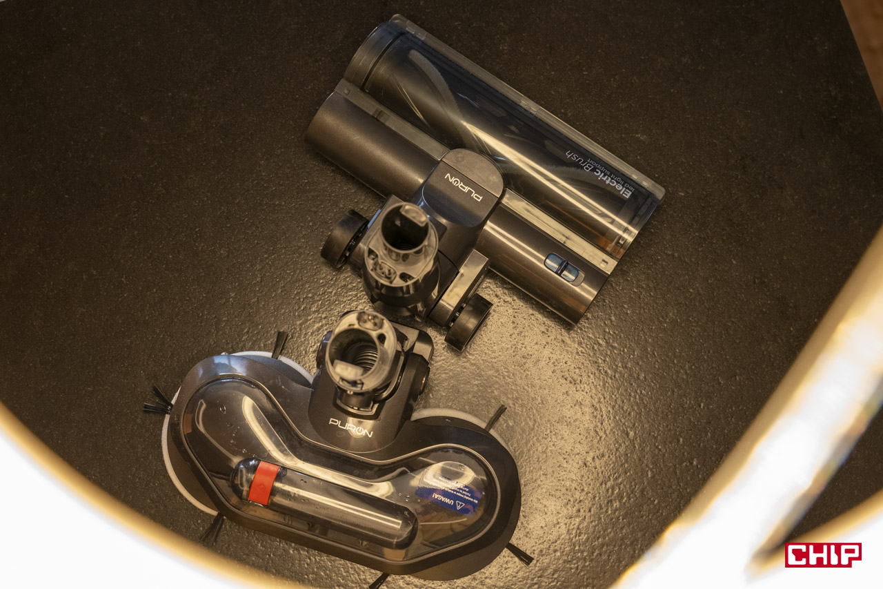 Głównymi gwiazdami zestawu są szczotka do odkurzania oraz moduł do mopowania. Obydwa wyposażono w podstawowe oświetlenie LED, co pomaga przy sprzątaniu w kątach oraz słabiej oświetlonych miejscach. Do tego łatwo konserwować i dbać o te sprzęty. Za pomocą prostych mechanizmów wyjmiemy szczotkę, a w przypadku mopa wystarczy odczepić zamocowane rzepami ściereczki. W zestawie PURON dorzucił zarówno urządzenie czyszczące do szczotek, jak i pojemnik do nalewania wody do końcówki mopującej. Obydwa rozwiązania posiadają blokadę, dzięki której sprzęt może stać bez potrzeby opierania go o ścianę czy odstawianie go do stacji dokującej.