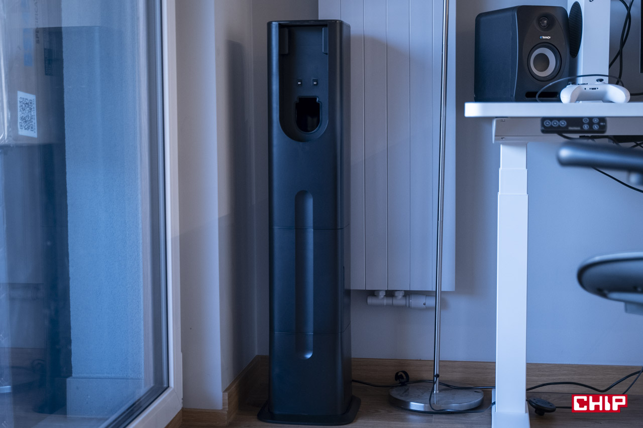 Wreszcie, sama stacja dokująca to stylowe i minimalistyczne rozwiązanie. Jej integralną częścią jest podnosząca się klapa, pod którą umieścimy baterię oraz zaczepimy odkurzacz. Dzięki niej odkurzacz ukrywa się w obrysie stacji dokującej, co wygląda dobrze. Stacja opiera swój design na jednolitej, matowej czerni, przez co nie będzie się nadmiernie wyróżniać w nowoczesnym domu. Wiele osób nie zauważy w niej części, gdzie umieszczamy worek – ta znajduje się w dolnej połowie zestawu za drzwiczkami. Sam system montażu worka także nie nastręczy trudności – po prostu naciskamy żółty element w górnej części zestawu, wysuwamy worek i wsuwamy nowy.