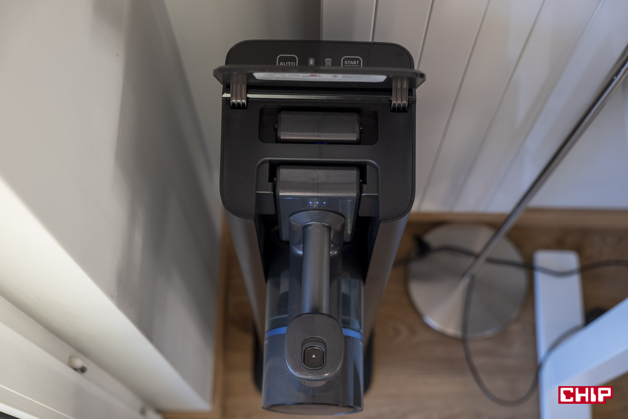 Stacja dokująca wyróżnia się tym, że nadaje do nas komunikaty głosowe zarówno po polsku, jak i po angielsku. Ma ona dwa tryby opróżniania – automatyczny, który włącza się od razu po podłączeniu odkurzacza do stacji dokującej oraz ręczny, sterowany za pomocą przycisku. Po każdym opróżnianiu pojemnika odkurzacza (które jest okresowo przerywane, zapewne po to, by blokujący się brud z pojemnika mógł opaść i zostać zebrany przy kolejnym wsysaniu) słyszymy komunikat o tym, że oczyszczanie zostało zakończone. Nie wyregulujemy głośności komunikatu, jak i intensywności czyszczenia, a nie są to czynności ciche. Jednocześnie trwają krótką chwilę.