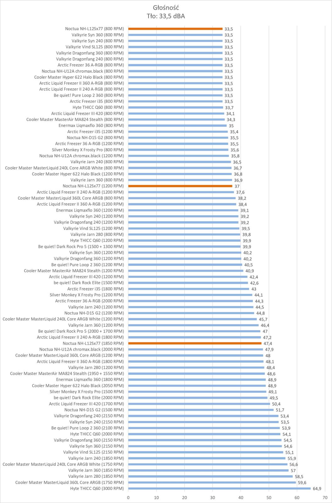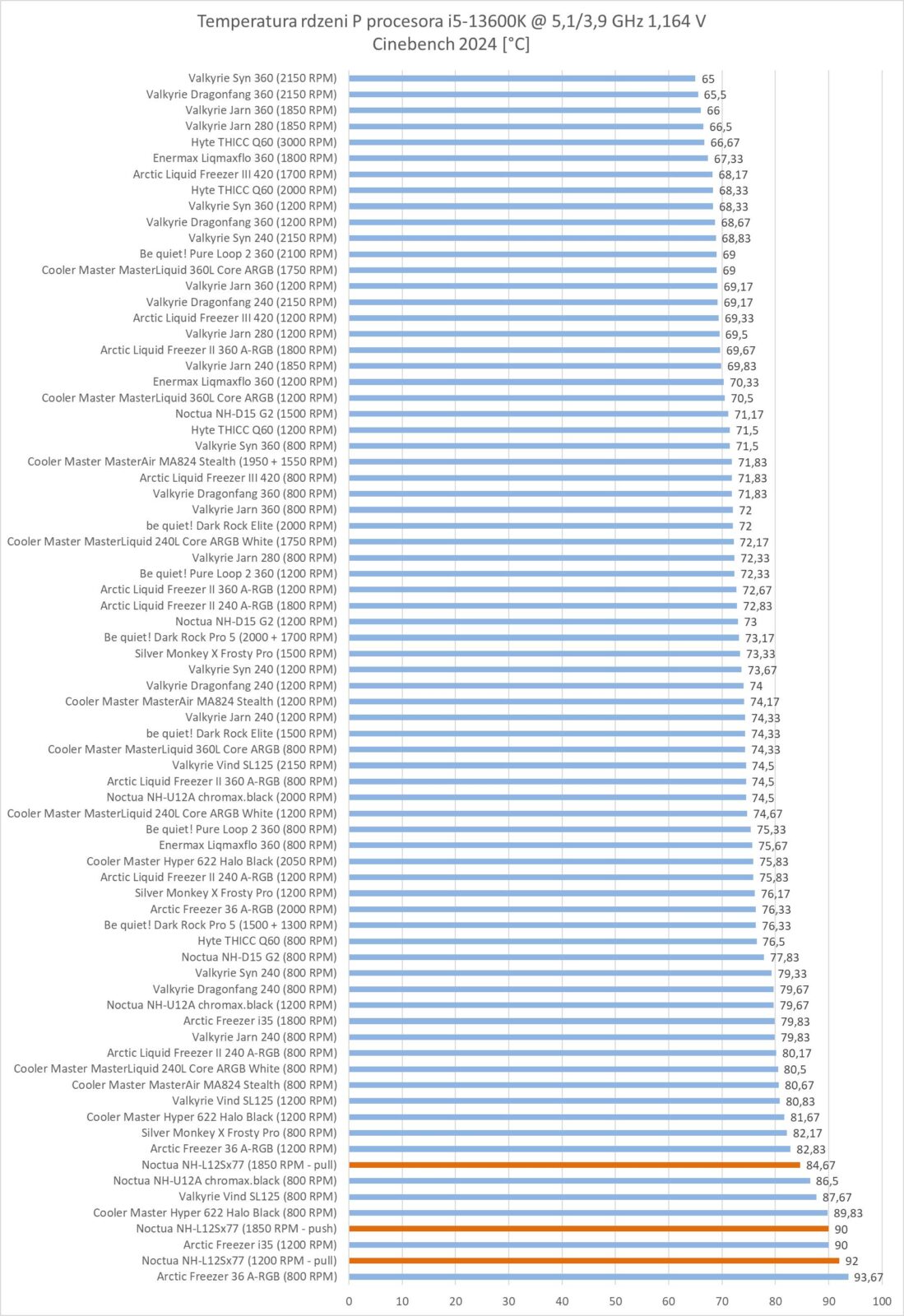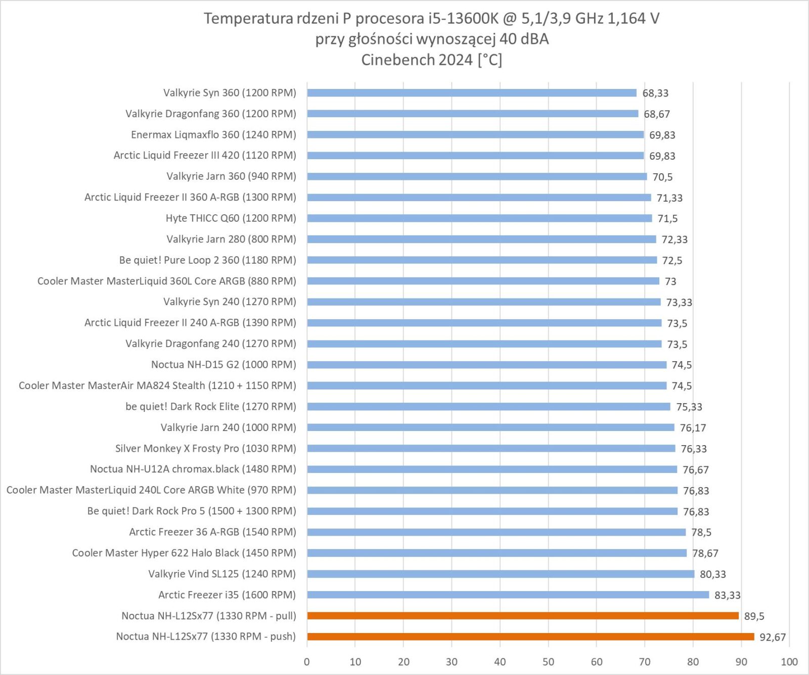 Przy normalizacji Noctua NH-L12Sx77 plasuje się na końcu zestawienia. Tutaj różnice w stosunku nawet do Freezera i35 są spore.