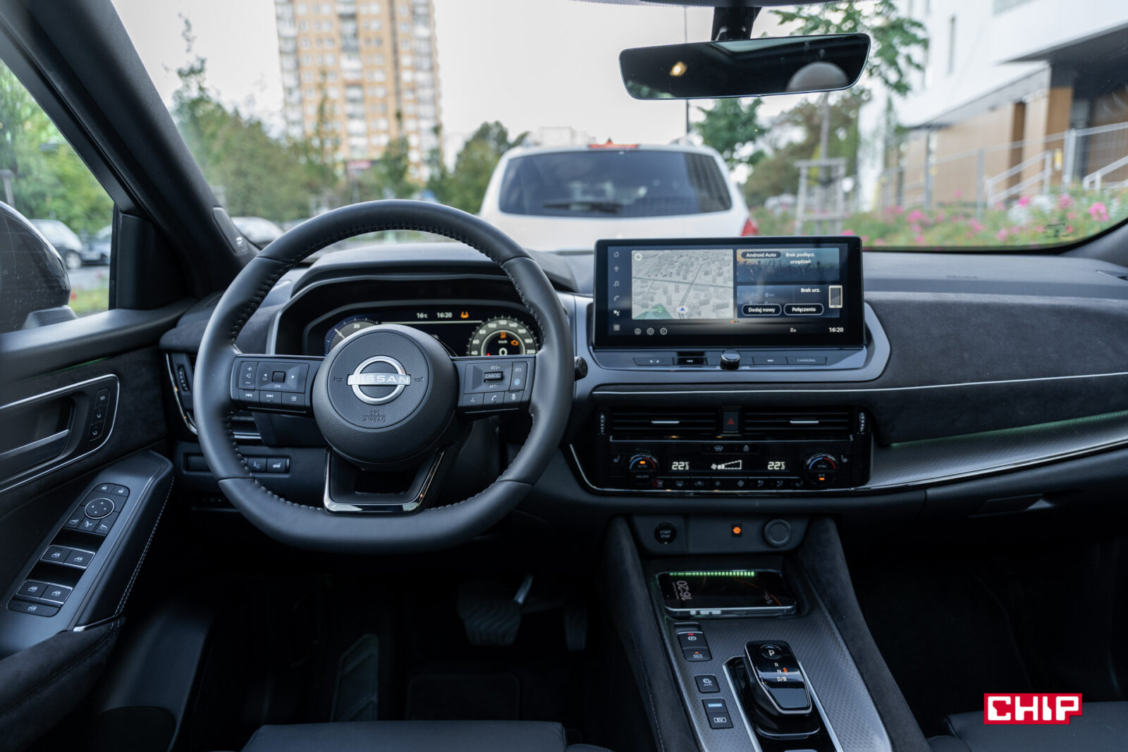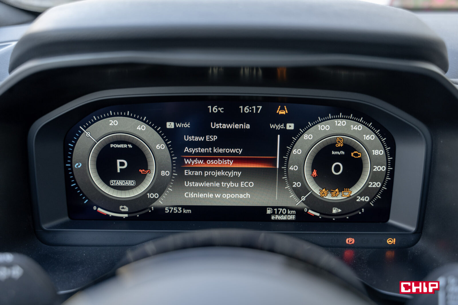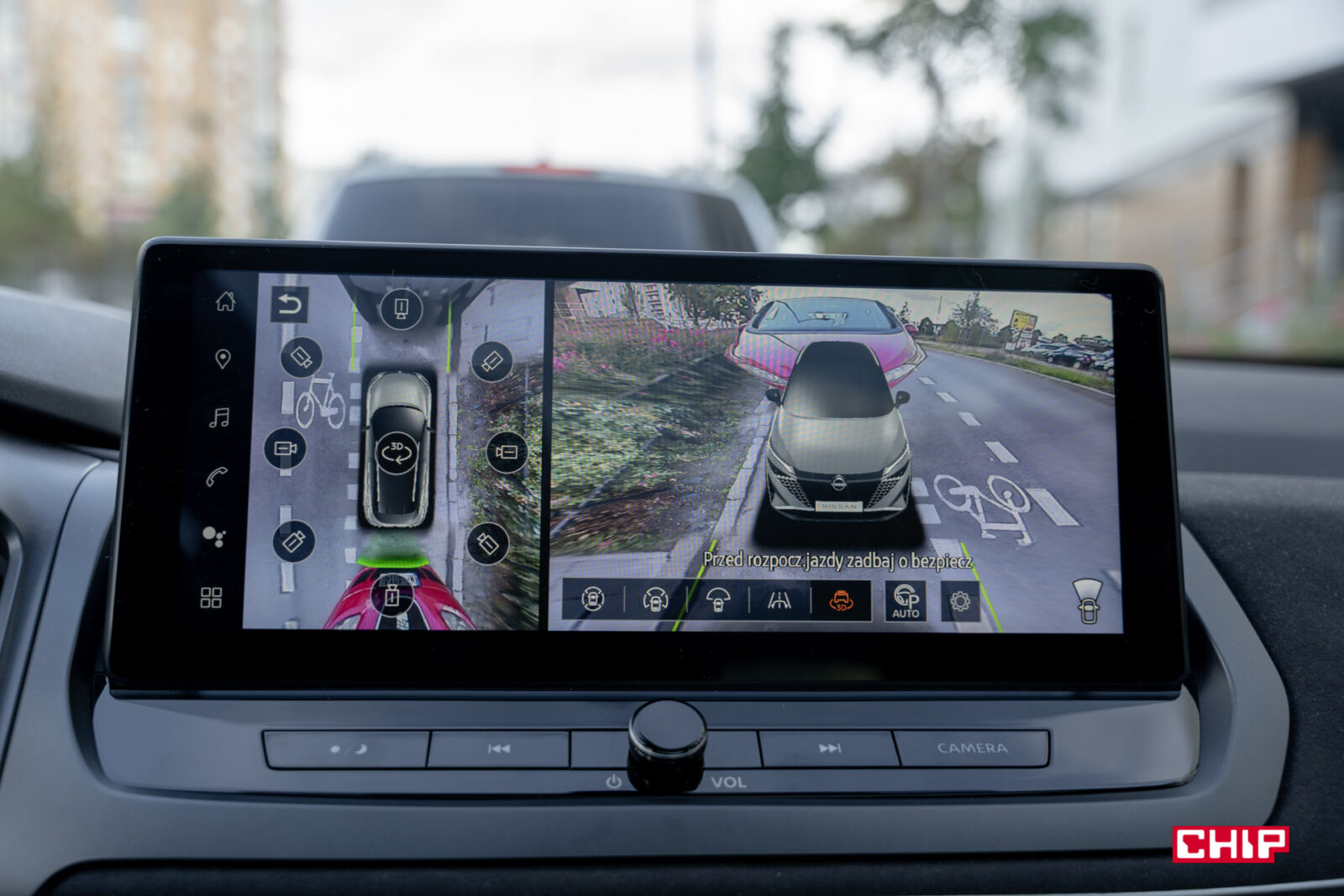 Kolejna rzecz, która na pierwszy rzut oka wygląda na niezmienioną to interfejs. To klasyczny Nissan i klasycznie – fanem nie jestem. Wszystko dlatego, że ekran główny służy w zasadzie tylko do obsługi multimediów, a wszystkie ustawienia związane np. z działaniem asystentów musimy wprowadzać na ekranie kierowcy za pomocą przycisków na kierownicy.