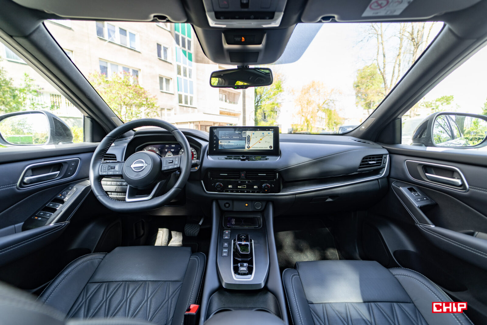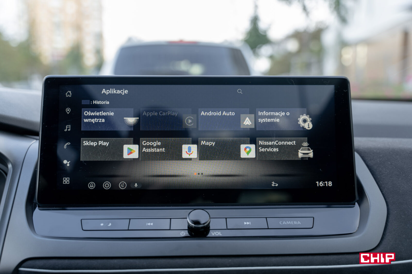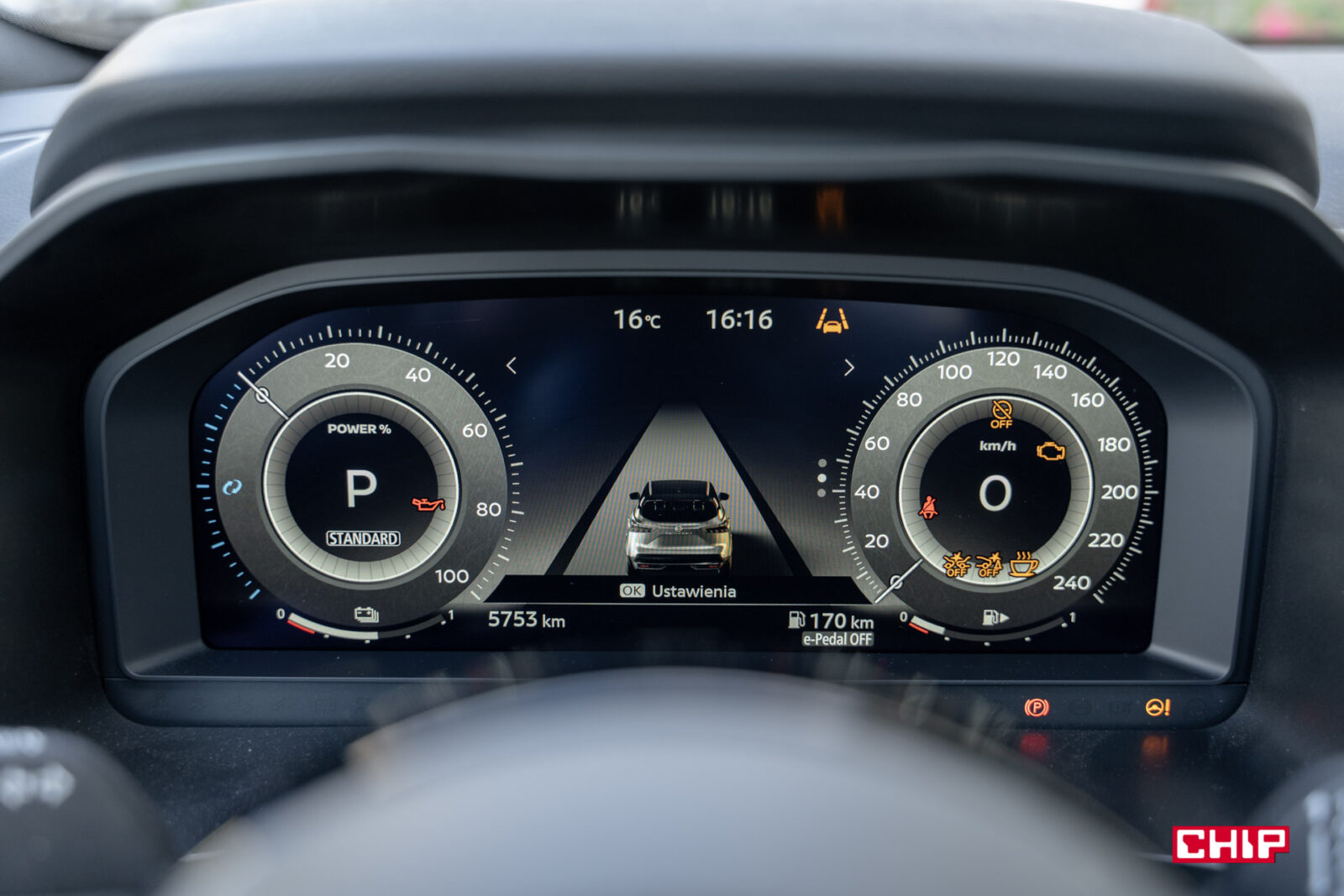 Kolejna rzecz, która na pierwszy rzut oka wygląda na niezmienioną to interfejs. To klasyczny Nissan i klasycznie – fanem nie jestem. Wszystko dlatego, że ekran główny służy w zasadzie tylko do obsługi multimediów, a wszystkie ustawienia związane np. z działaniem asystentów musimy wprowadzać na ekranie kierowcy za pomocą przycisków na kierownicy.