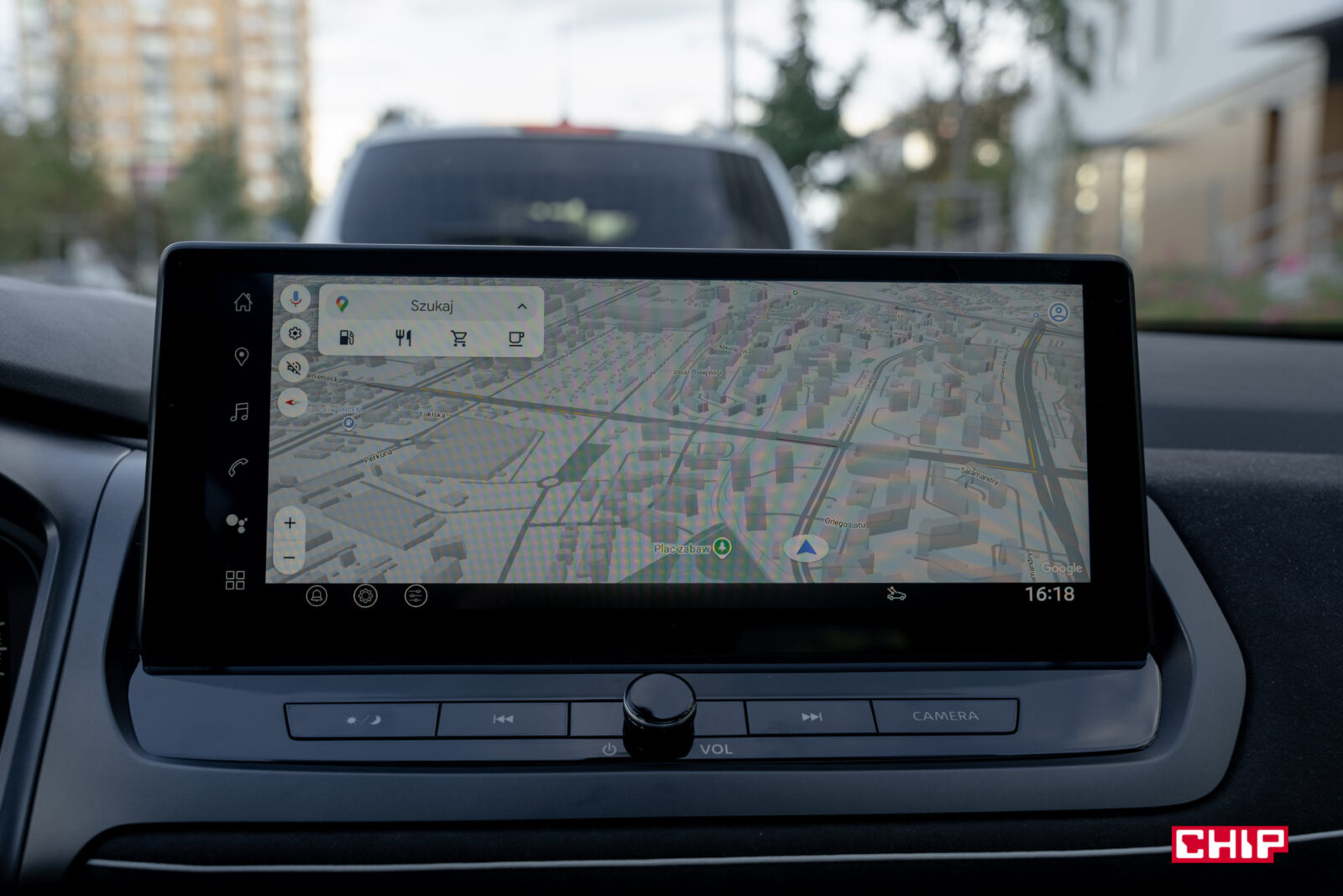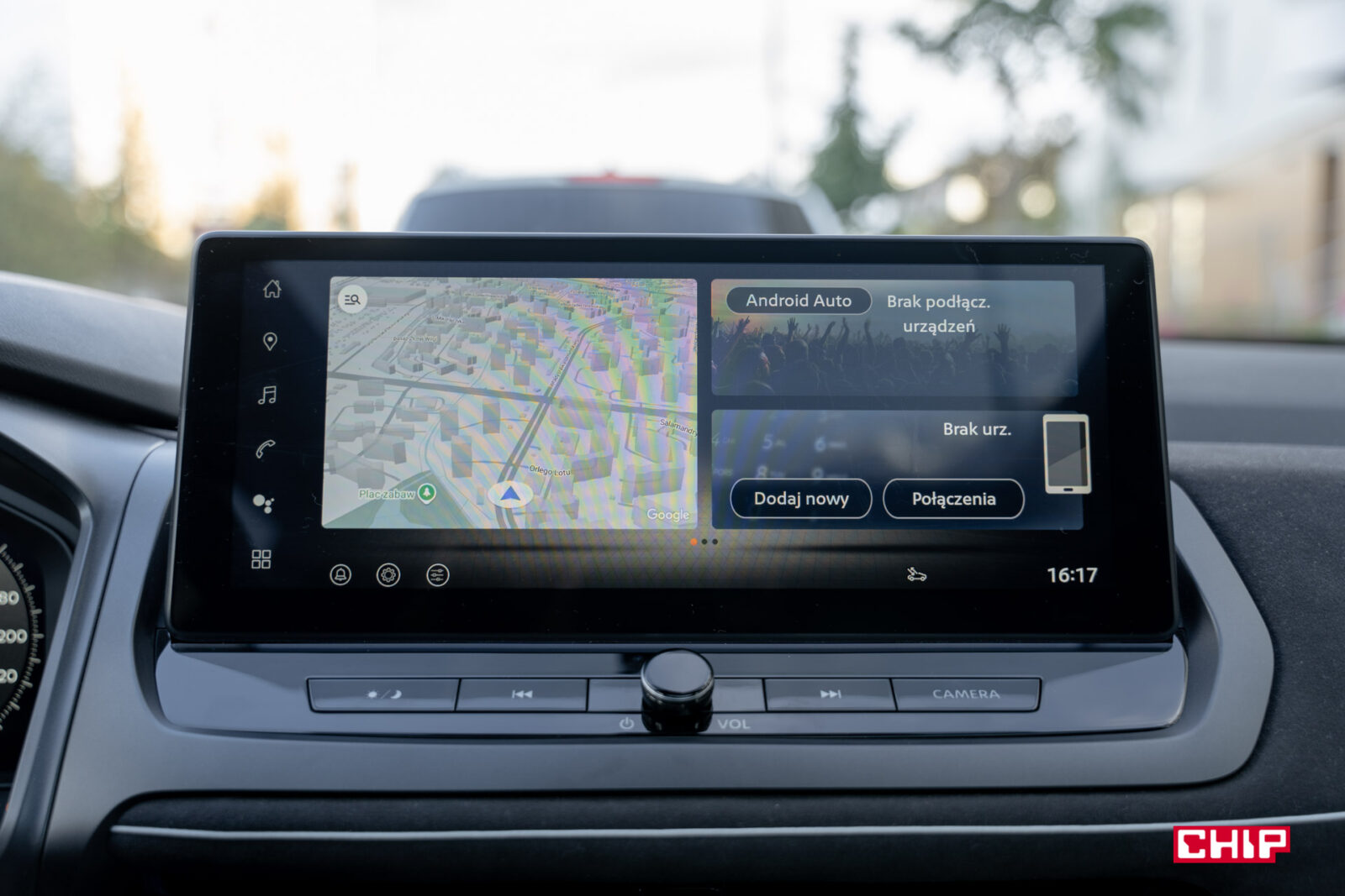 W Menu ekranu głównego widzimy jednak nowe pozycje i są to usługi Google. To ciekawe, że Nissan nie zdecydował się na Android Automotive, ale zaimplementował do swojego interfejsu Asystenta, Mapy oraz dostęp do Sklepu Play. Świetny ruch i przede wszystkim bardzo wygodny dla kierowcy. Można, a wręcz trzeba sparować smartfon z autem dla zestawu głośnomówiącego, ale już z Mapy możemy korzystać bezpośrednio z poziomu interfejsu.