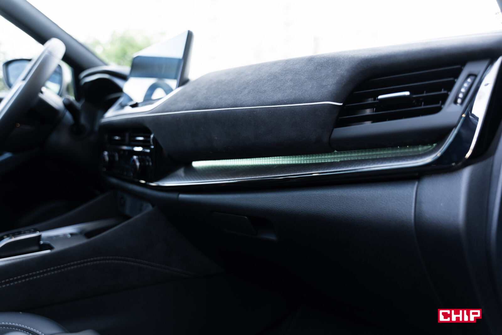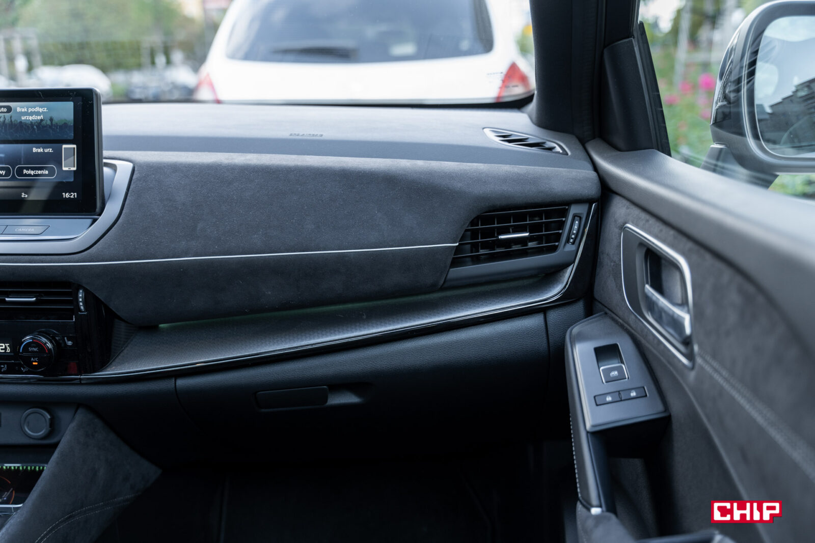 Drugą nowością, która pojawia się w wyższych wariantach wyposażenia jest wykończenie. Na zdjęciach widzicie deskę rozdzielczą pokrytą alcantarą. Znajduje się ona też m.in. na obiciach drzwi i podłokietniku. Na pewno jest to materiał bardziej podatny na poplamienie go względem skóry, ale powoduje, że w środku można poczuć się przyjemnie dzięki otaczającej nas… miękkości.
