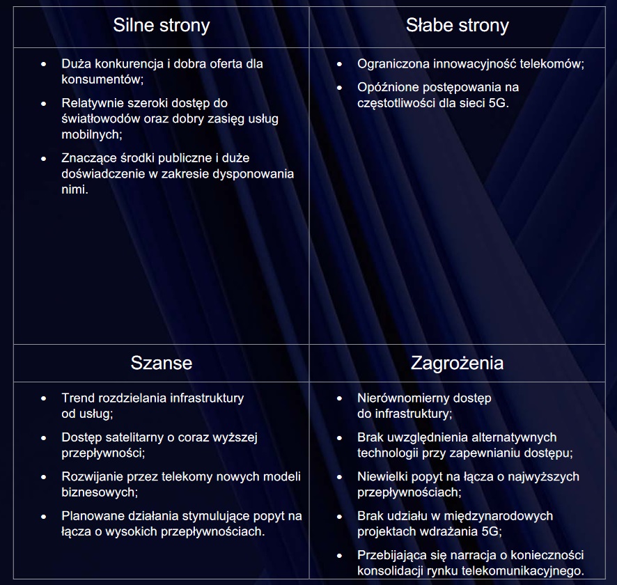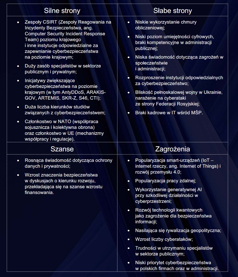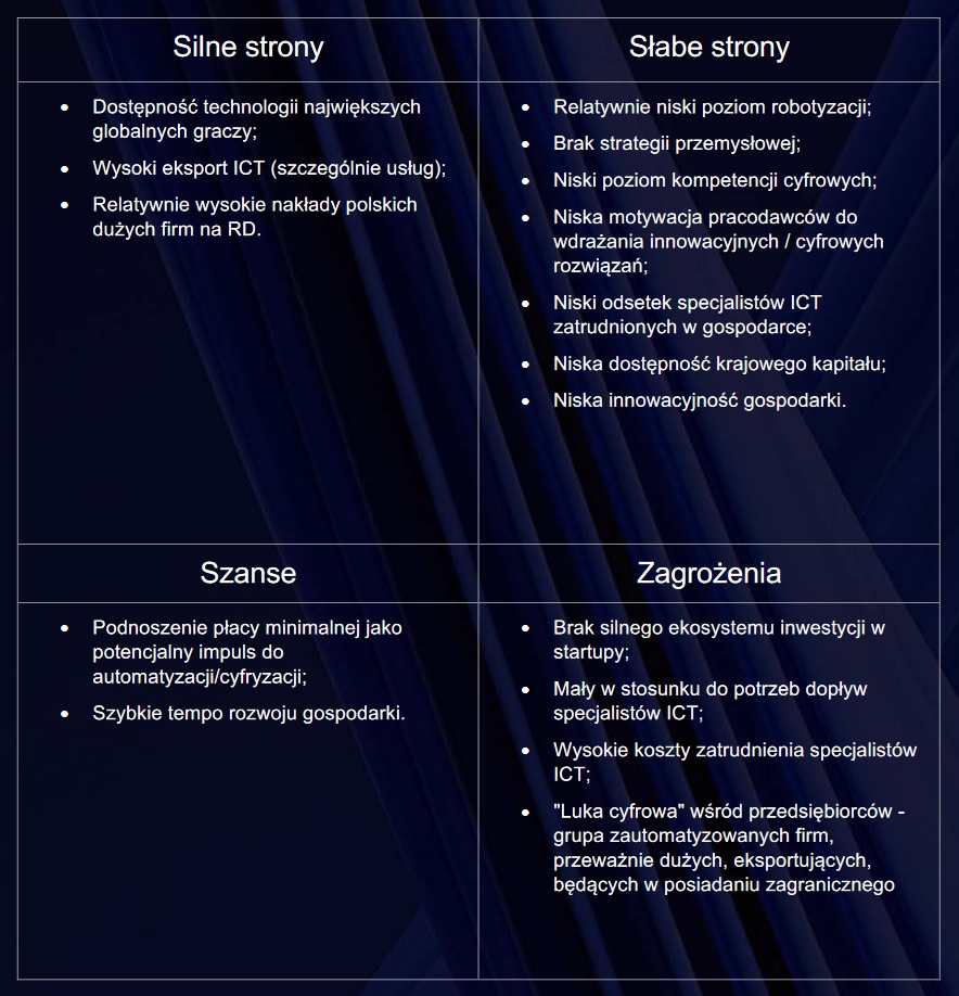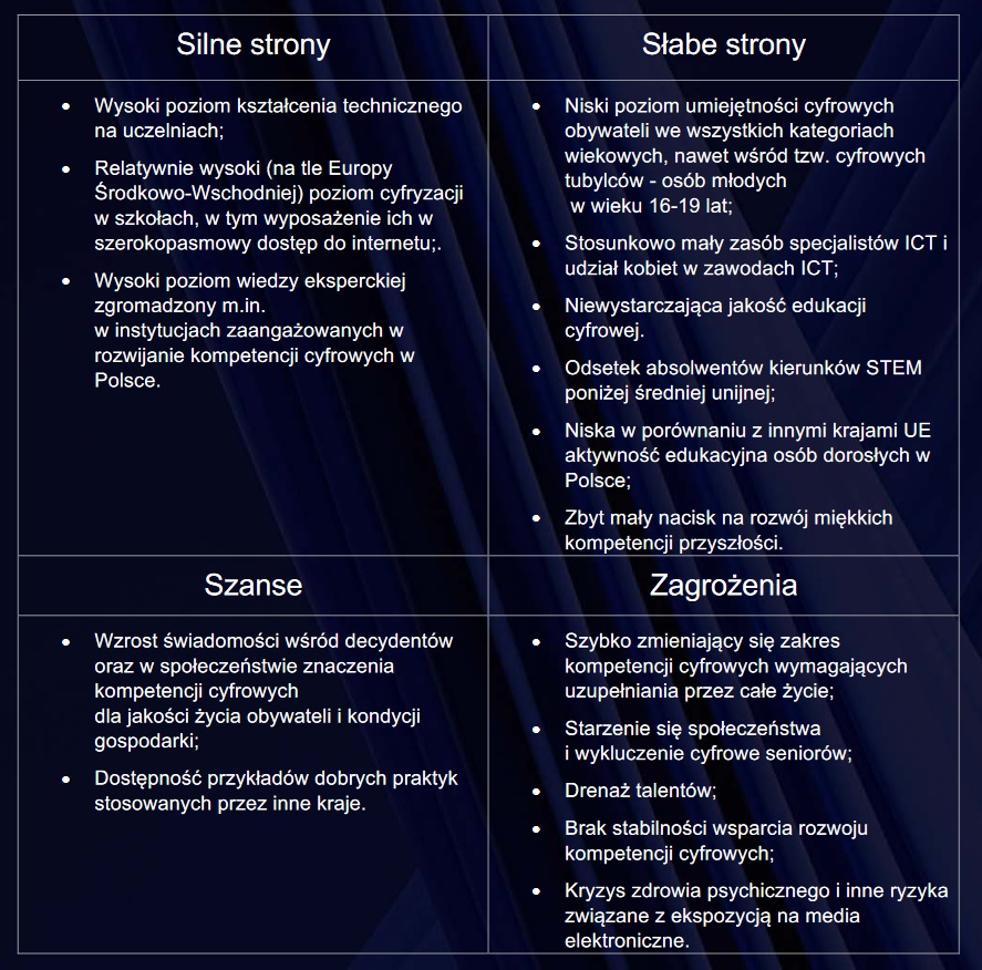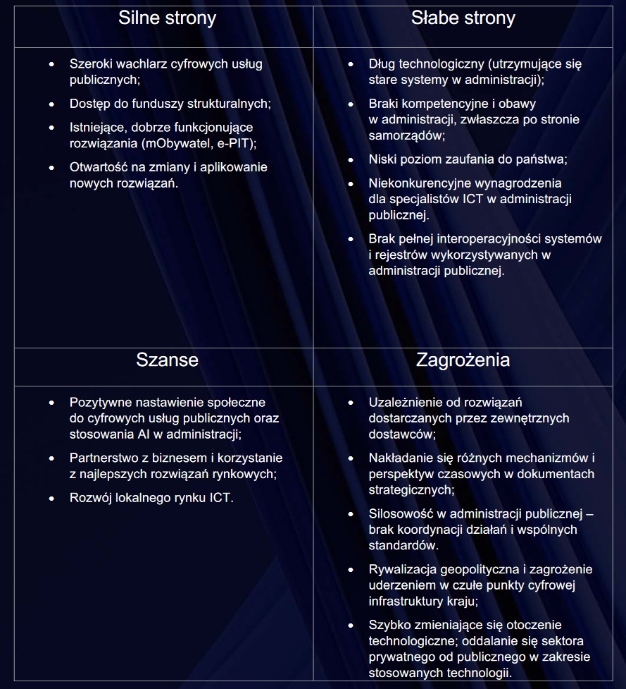 Bardzo ciekawie wygląda analiza SWOT poszczególnych obszarów. Pierwszym z nich jest cyfrowe państwo: