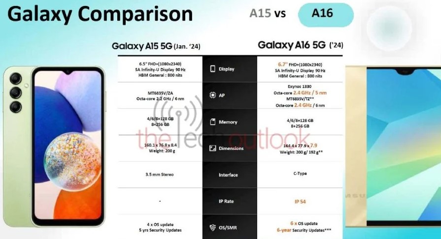 Przy okazji specyfikacja wariantu 5G tego urządzenia również wyciekła do sieci, więc przyjrzyjmy się jej bliżej. Galaxy A16 5G będzie wyposażony w 6,7-calowy ekran z odświeżaniem 90 Hz, przyzwoitą rozdzielczością 1080×2340 pikseli i szczytową jasnością 800 nitów. Jego sercem będzie układ MediaTek Dimensity 6300 (w Indiach i Tajlandii, co potwierdziły urzędy certyfikacyjne) lub Exynos 1330 w pozostałych regionach. Procesor wspierany będzie przez 4, 6 lub 8 GB pamięci RAM i 128 lub 256 GB pamięci masowej. Za zasilanie odpowie pojemny akumulator 5000 mAh, zapewne obsługujący ładowanie z mocą 25 W.