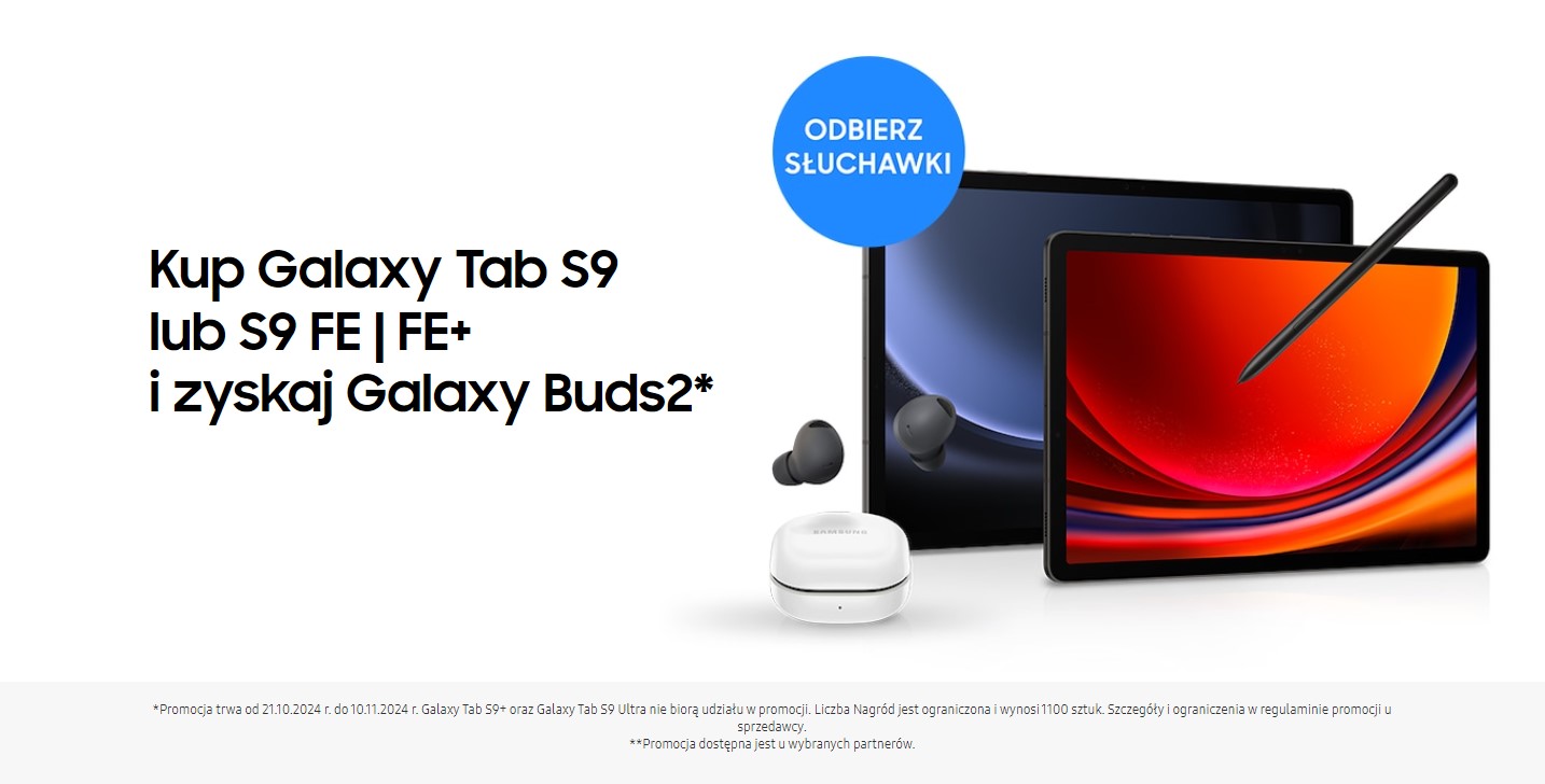 Na tym jednak nie koniec. Zakup modeli z serii Galaxy Tab S10 to duży koszt, bo ich ceny wynoszą od 4699 do 5899 złotych za S10+ i od 5699 do nawet 8099 zł za Ultra, więc to niemały wydatek, nawet z perspektywą otrzymania zwrotu części wydanych środków. Poza tym, nie każdy też potrzebuje takiego urządzenia. Dla osób z mniejszym budżetem i wymaganiami Samsung przygotował też promocję na kilka innych modeli – Galaxy Tab S9, Galaxy Tab S9 FE i Galaxy Tab S9 FE+. Tutaj nie ma co prawda cashbacku, ale kupując jeden ze wspomnianych tabletów, możemy zdobyć grafitowe słuchawki Galaxy Buds 2 za darmo.