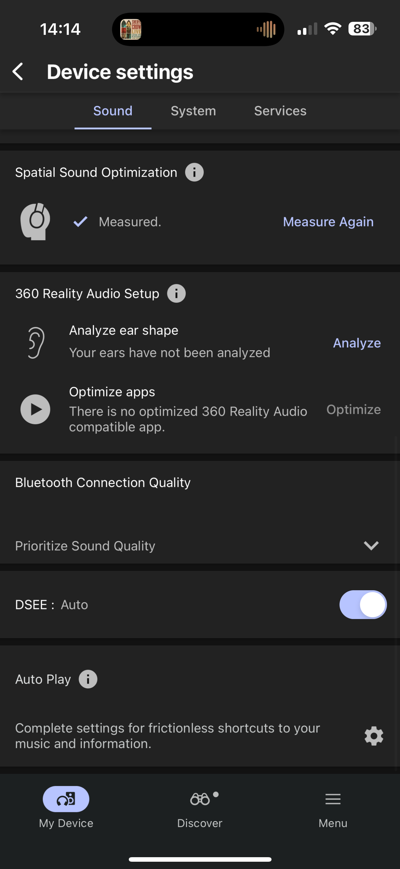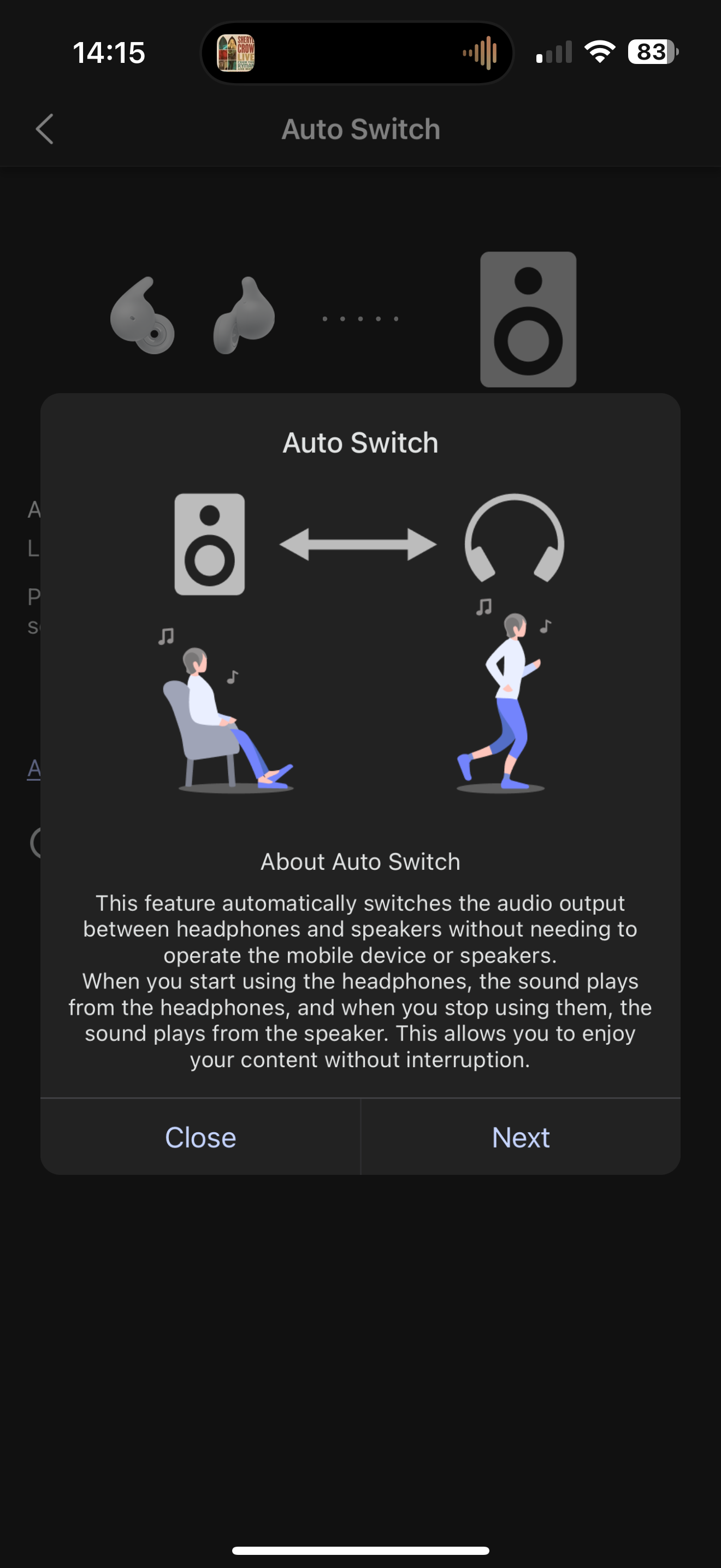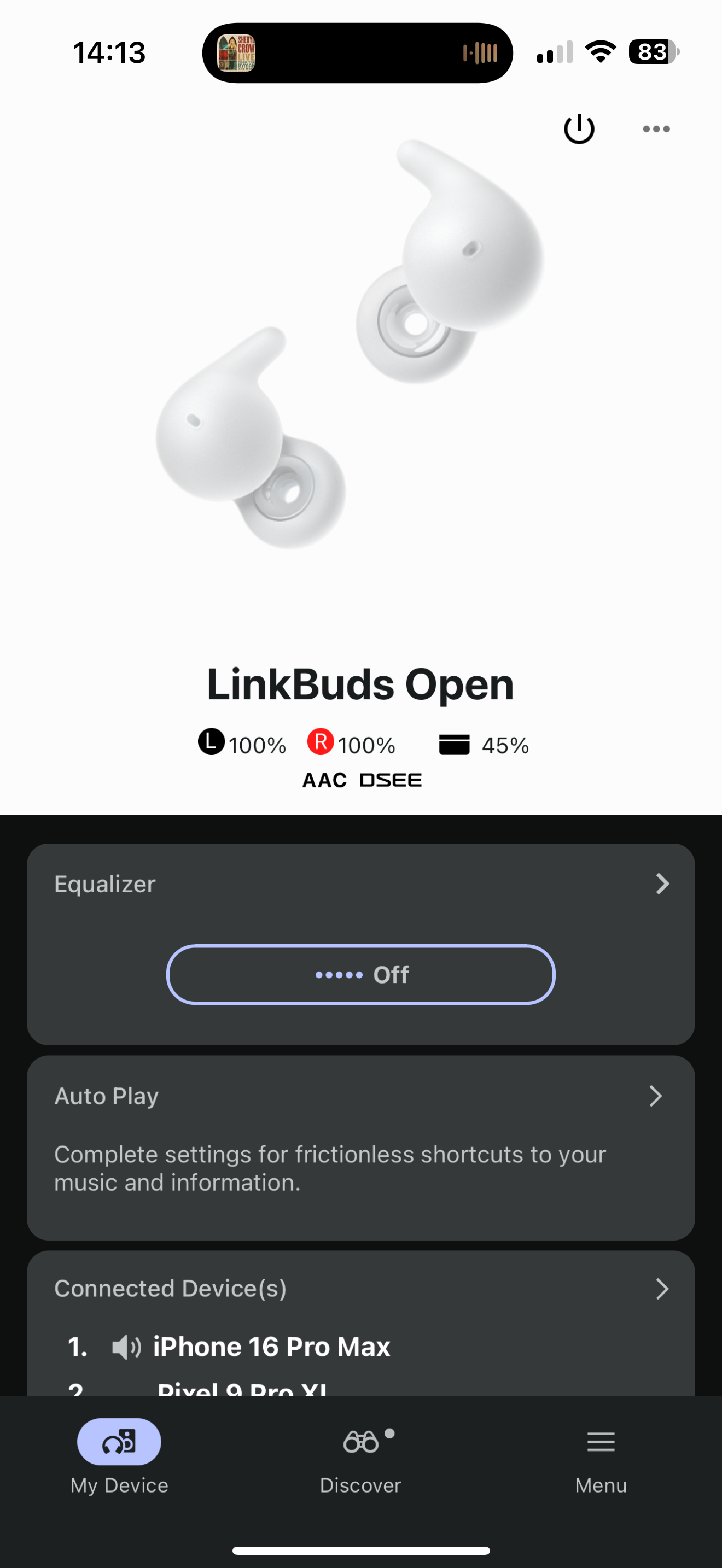Aby w pełni wykorzystać możliwości LinkBuds Open, niezbędne jest oprogramowanie Sony Sound Connect – następca Sony Headphones. Warto tam naprawdę zajrzeć – są tam ustawienia oczywiste, jak np. system DSEE i korektor graficzny z dodatkowym wzmocnieniem basu, tryb multipoint, aktualizacja i mniej oczywiste, jak np. sterowanie przez tapnięcie w pobliżu słuchawek, przełączenie ich w tryb LE Audio, włączenie adaptacyjnej głośności czy funkcja Speak-to-Chat, która wycisza muzykę, gdy wykryje nasz głos.
