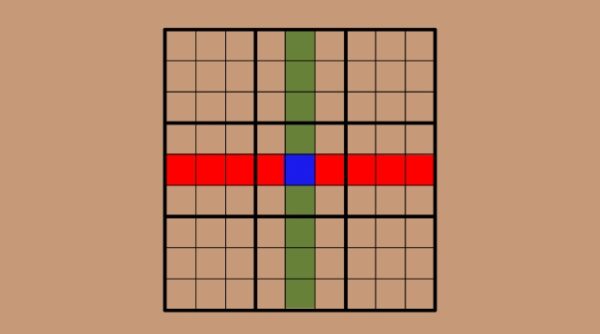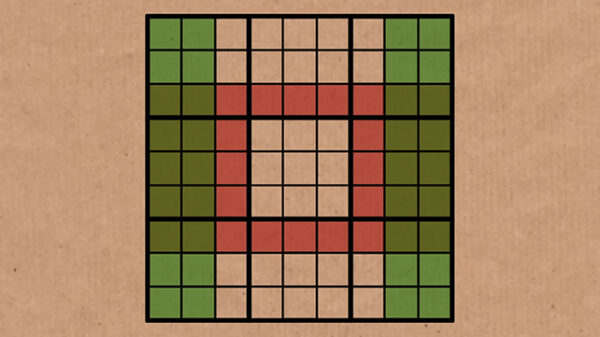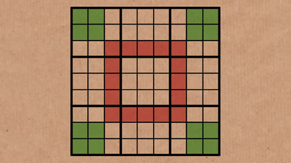Ostatecznie dochodzimy do sytuacji, w której 16 cyfr w czterech narożnych regionach o wymiarach 4 na 4 będzie zgodnych z cyframi w pierścieniu złożonym z 16 kwadratów otaczających centralny region o wymiarach 3 na 3. I choć nie zdradza to konkretnych rozwiązań, to pokazuje wzór występujący przy rozwiązywaniu tej interesującej łamigłówki.