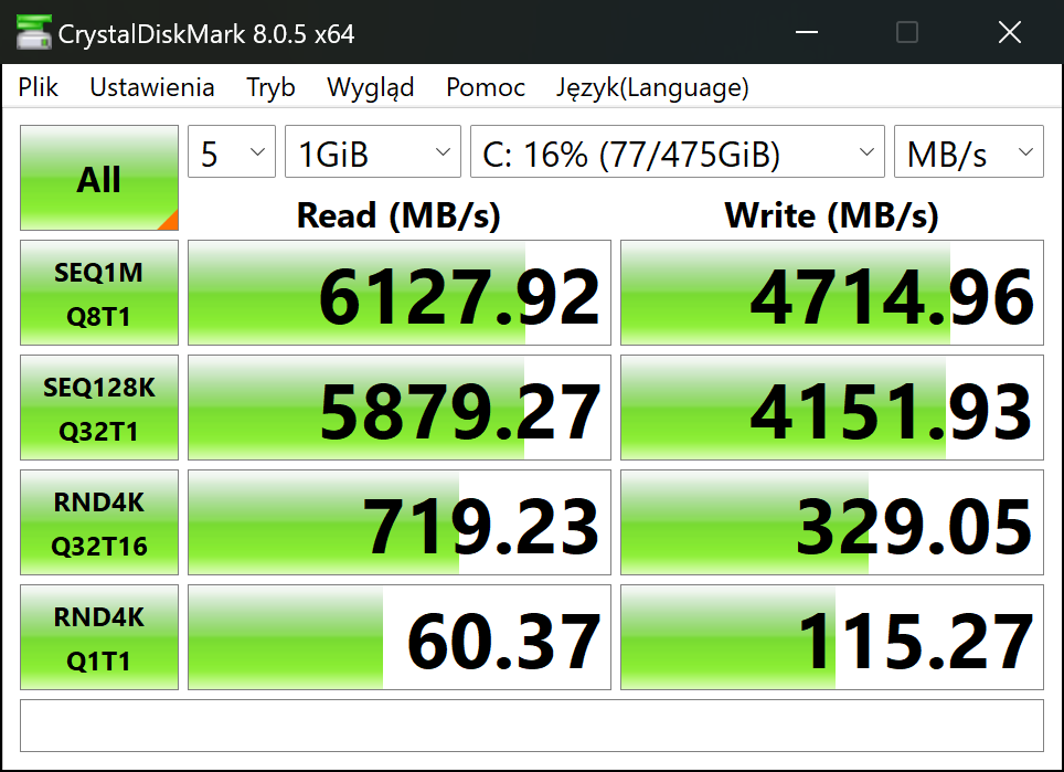 - CrystalDiskMark: 6128 MB/s odczyt sekwencyjny / 4714 MB/s zapis sekwencyjny