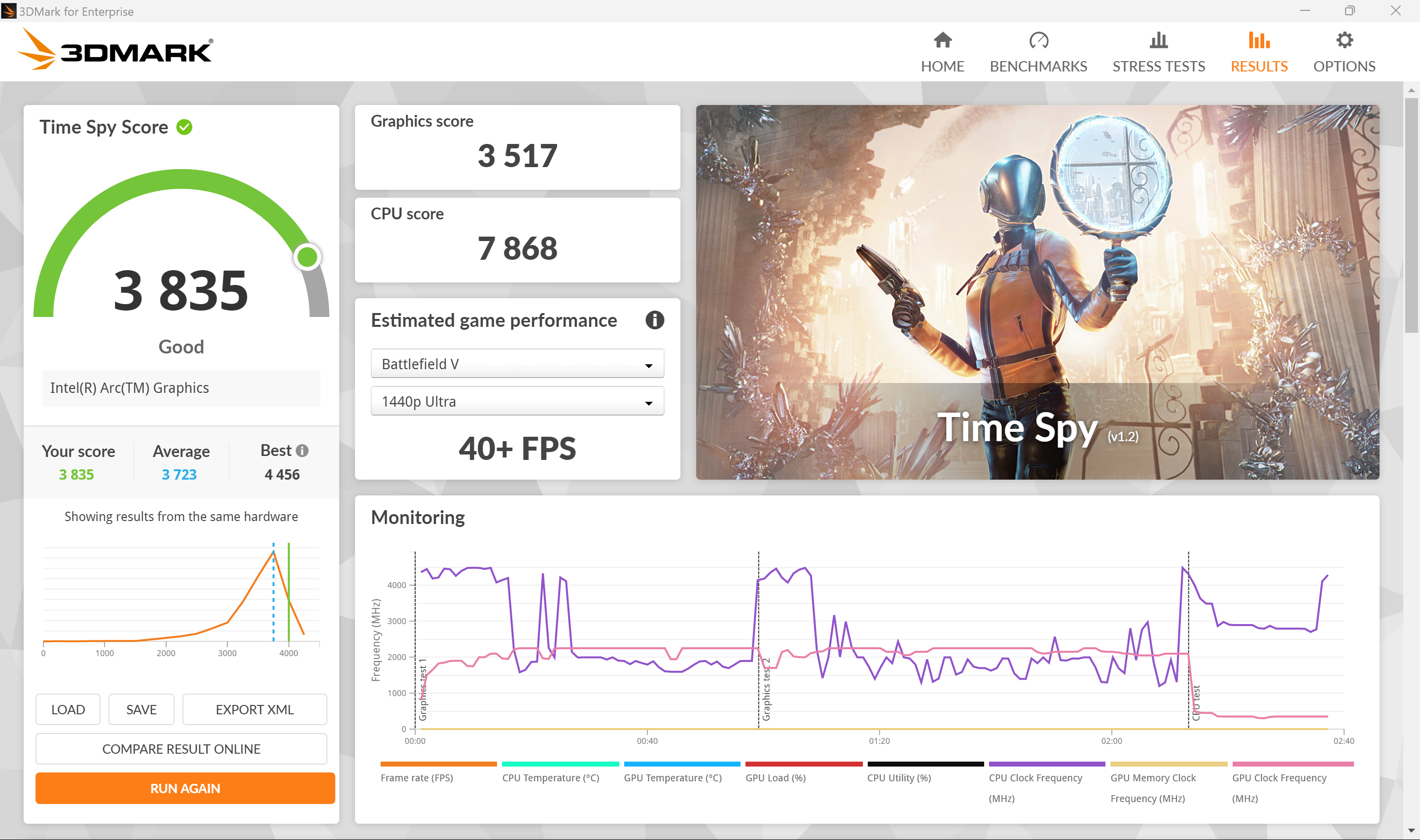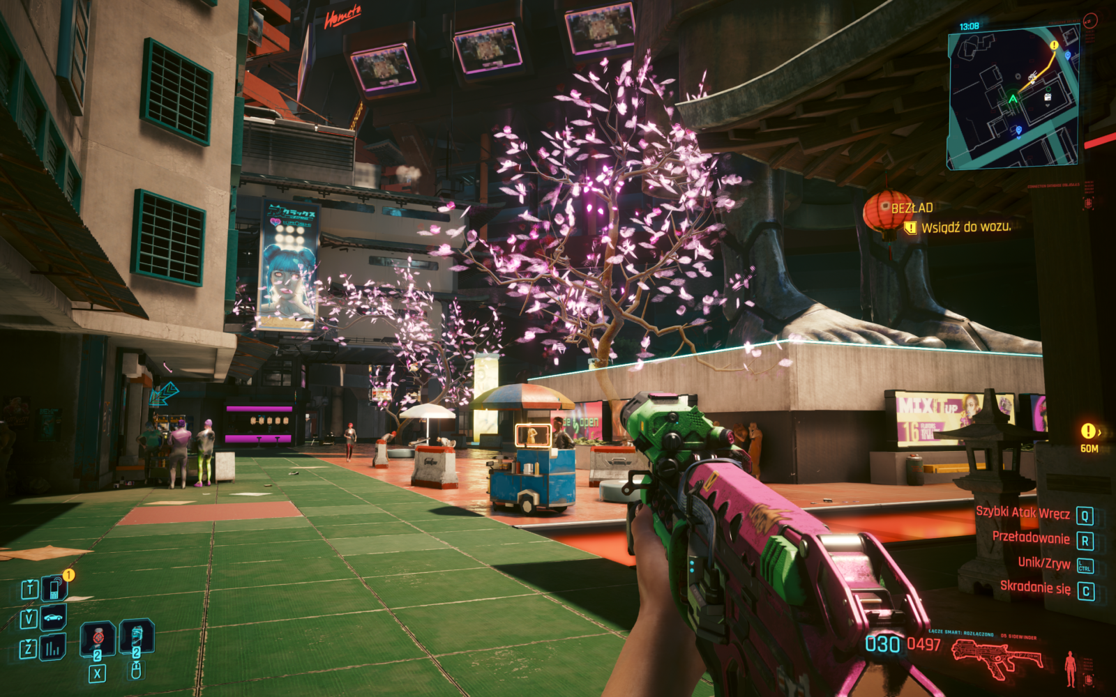 Najbardziej wymagający z uruchamianych przeze mnie gier był niewątpliwie Cyberpunk 2077, który działał zadowalająco na ustawieniach średnich z Intel Xe Super Sampling 1.3 – lepiej, niż z użyciem FSR 3 i generatora klatek. Podczas obciążenia CP2077 temperatura górnej części obudowy nad klawiaturą sięgnęła 52°C, nie miało to jednak wpływu na komfort użytkowania, gdyż sama klawiatura pozostawała chłodna. Godne uwagi jest także i to, że pod takim obciążeniem komputer wcale jakoś specjalnie nie hałasował, co wskazuje na bardzo dobrze przemyślaną konstrukcję układu chłodzenia.
