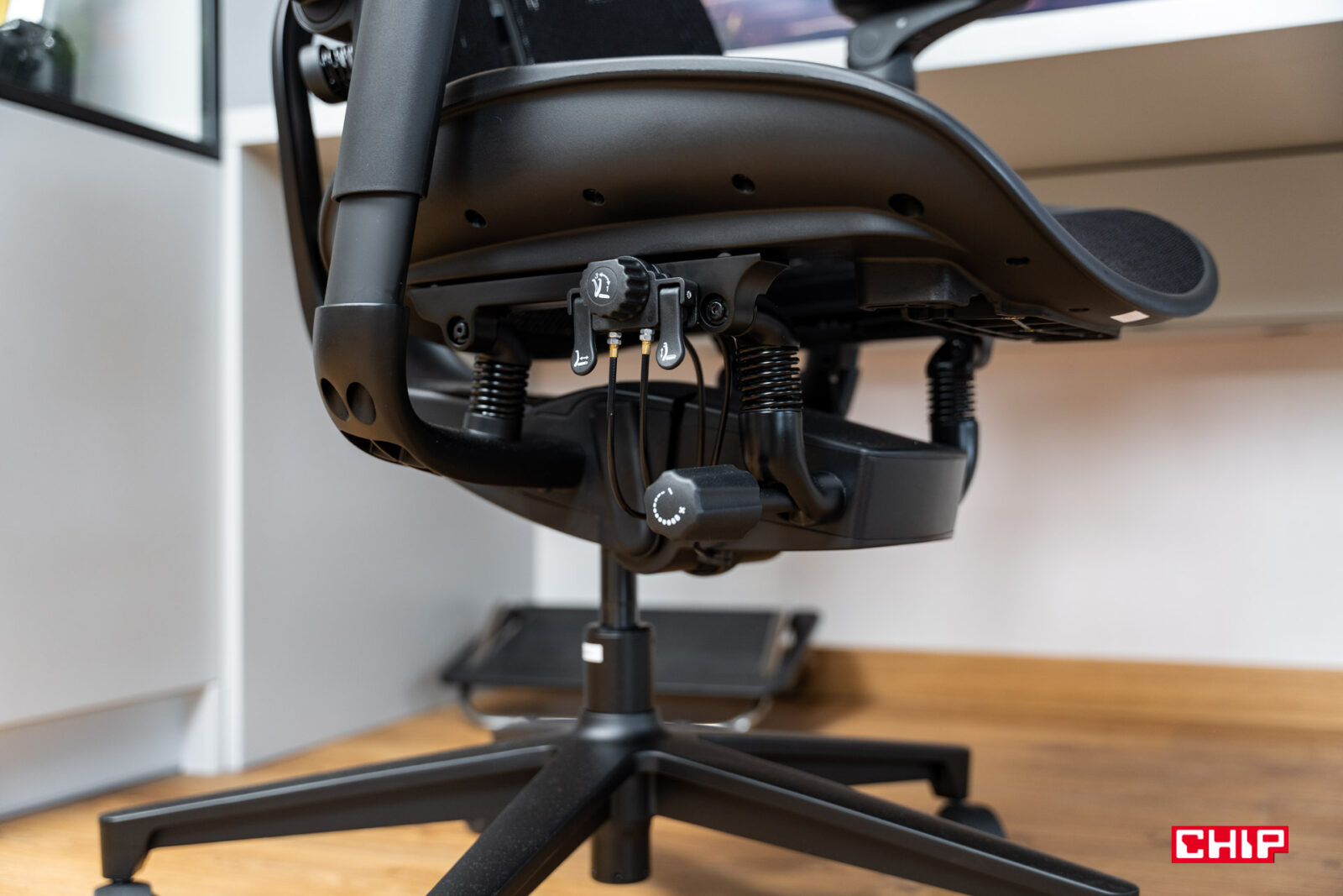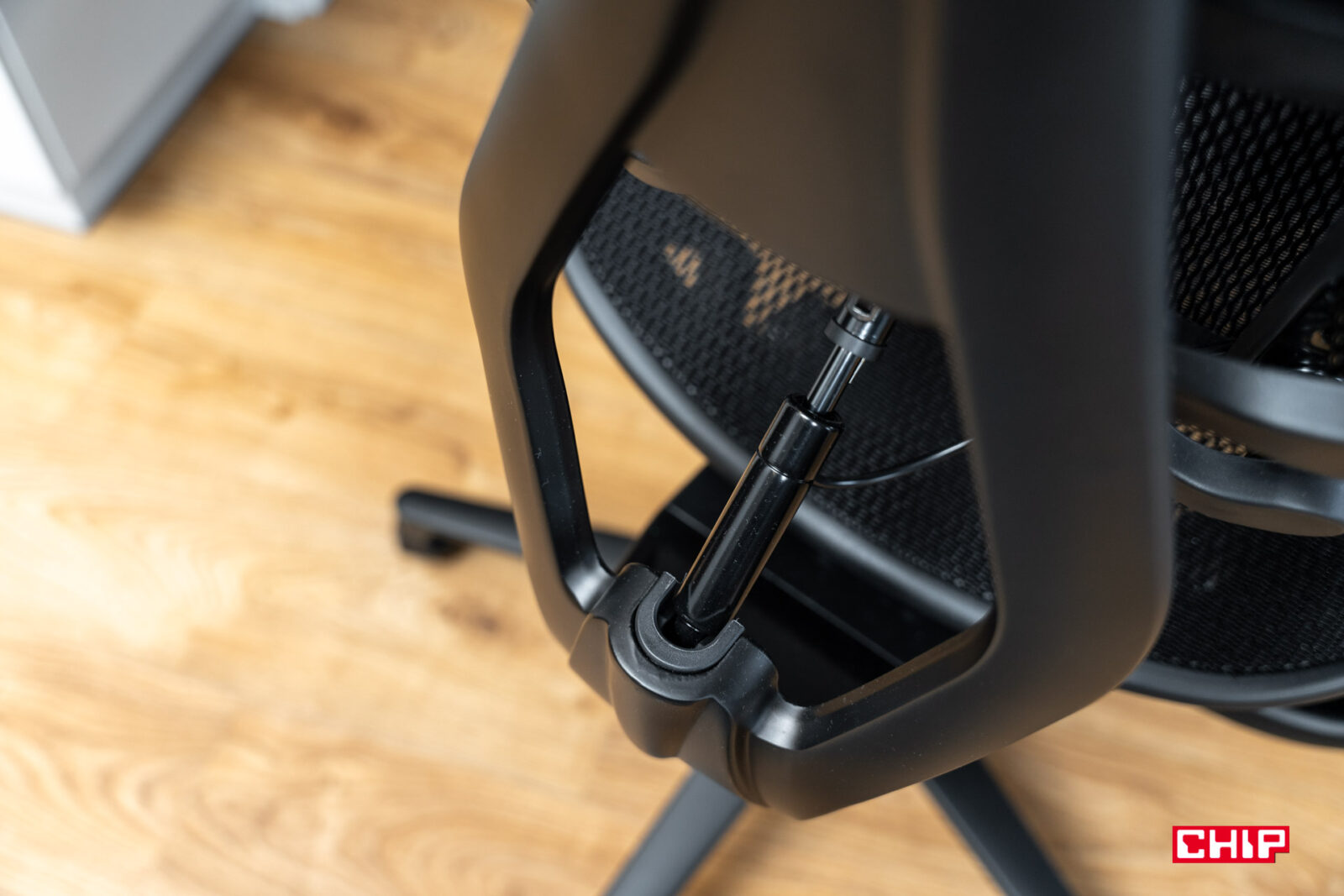 To tyle, jeśli chodzi o bardziej szczegółowe elementy, a jako całość fotel można wygodnie odchylić i mamy do wyboru trzy pozycję. Całkowicie wyprostowaną, lekko odchyloną lub półleżącą. Poziom sprężystości odchylenia oparcia też możemy wyregulować i do tego służy pokrętło pod siedziskiem. Cały rozbudowany system regulacji fotela producenta nazwał ErgoMultiControl.