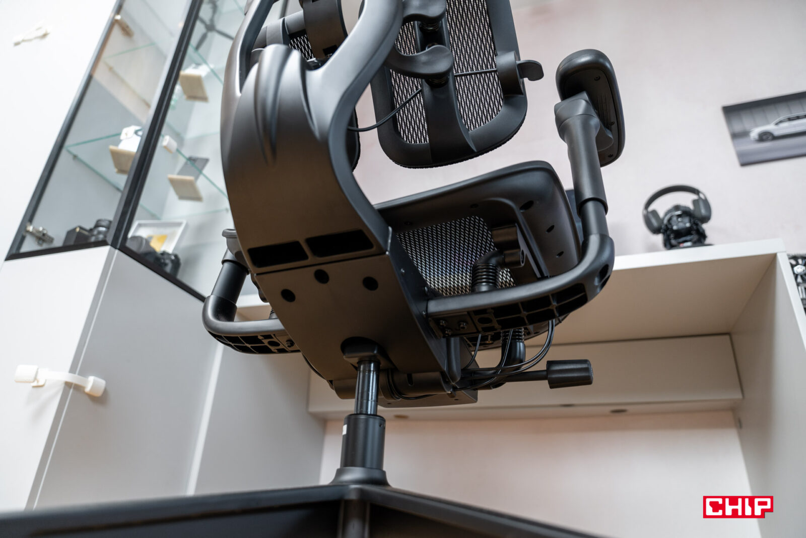 Poza tym, że TECHMesh sam w sobie jest miękki, wspiera go szereg mechanizmów opartych na sprężynach. Pierwsze znajdziemy pod siedziskiem i nie, wbrew pozorom nie poskaczemy tutaj jak na fotelu wysłużonego traktora. Pełnią one rolę bardziej stabilizującą, niż sprężynującą. W przeciwieństwie do oparcia HarmonMove. Odcinek lędźwiowy to osobna część oparcia, która nie tylko pozwala na regulację pozycji przód-tył, ale też dosłownie żyje w trakcie użytkowania. Dopasowuje się do naszych pleców i porusza się z nimi w trakcie użytkowania. Dzięki temu cały czas plecy mają oparcie i to naprawdę procentuje podczas wielogodzinnej pracy.
