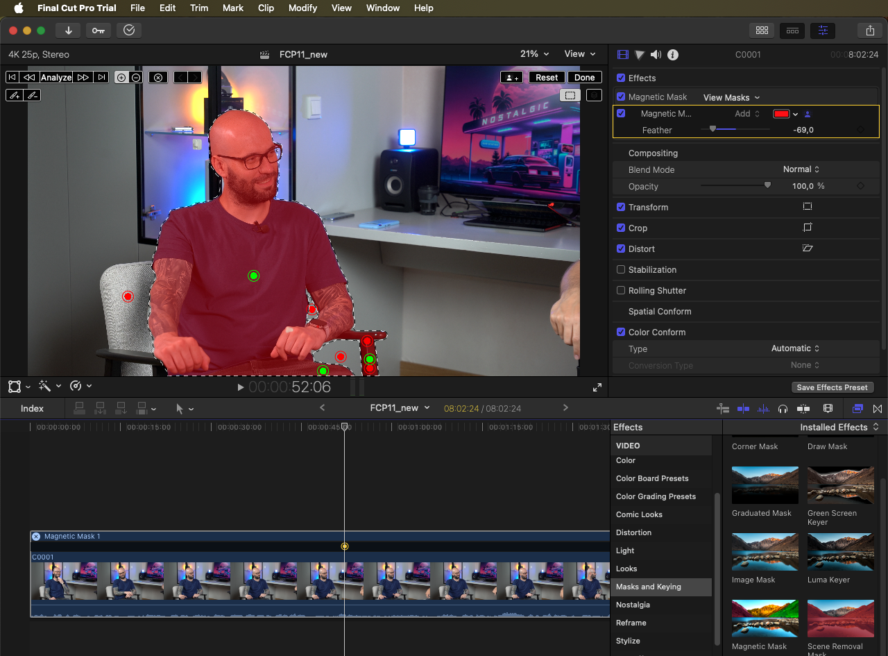 Najnowsza odsłona Final Cut Pro udostępnia dwa nowe, potężne narzędzia oparte na uczeniu maszynowym i sztucznej inteligencji – Magnetic Mask i Transcribe to Captions. Magiczna Maska pozwala – w skrócie – na precyzyjne oznaczenie i wyodrębnienie z materiału video konkretnych ludzi lub obiektów bez użycia technik takich jak green screen lub rotoskopia. Dzięki automatycznym analizom i precyzji, nowe narzędzie umożliwia znacznie szybsze i wygodniejsze dodawanie efektów, manipulację tłem. Magnetic Mask można łączyć także z zaawansowaną korekcją kolorów.