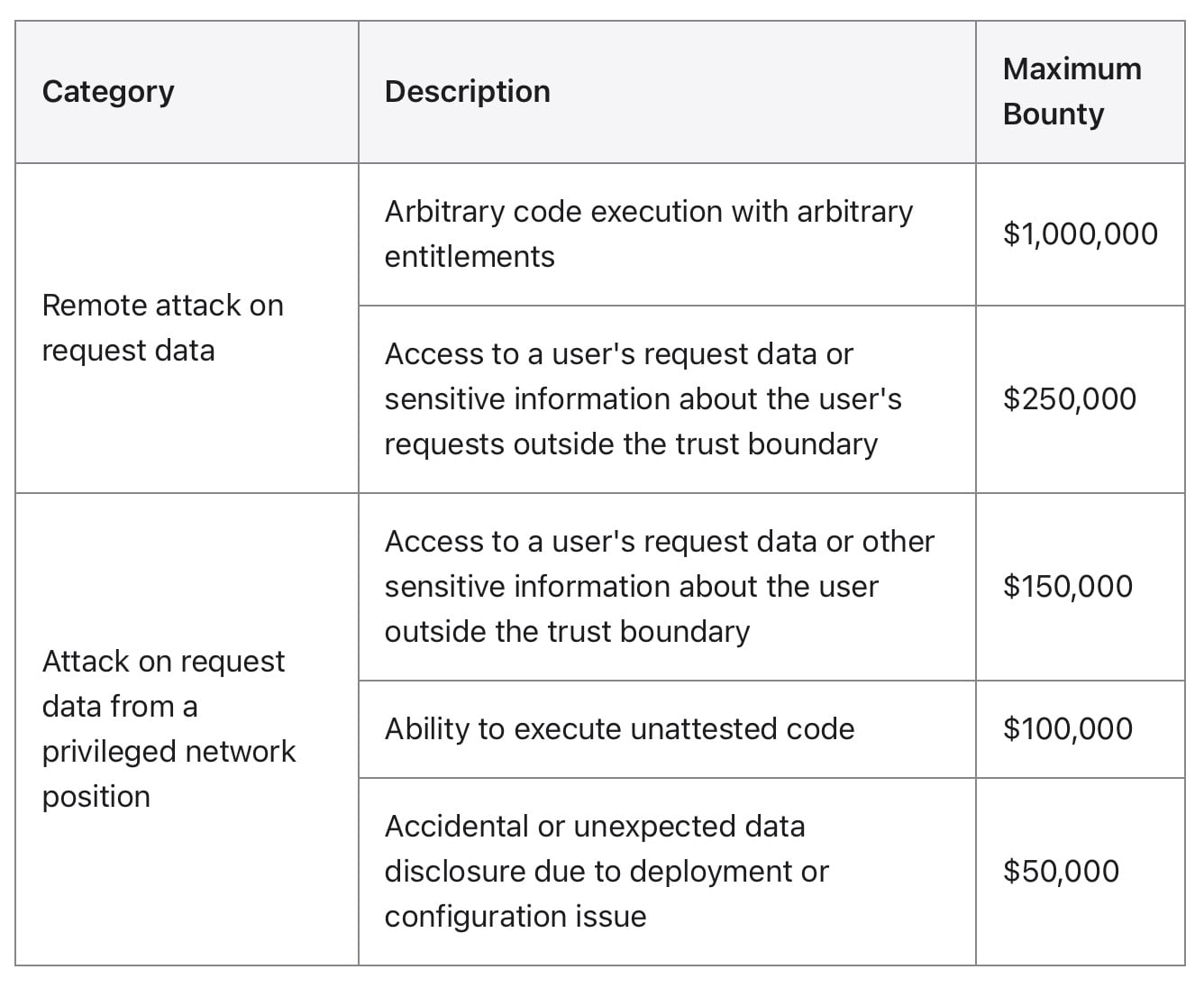 Apple na swoim blogu ogłosiło, że w ramach programu nagród za zgłaszanie luk w zabezpieczeniach, firma obiecuje wynagrodzenie sięgające nawet 1 miliona dolarów dla każdego, kto dostarczy informacje o exploitach umożliwiających zdalne uruchamianie złośliwego kodu. Dodatkowo, chętni badacze będą mogli również zgłaszać luki, które prowadzą do wydobywania poufnych informacji użytkowników. Za takie zgłoszenia Apple przewiduje nagrody do 250 tysięcy dolarów.