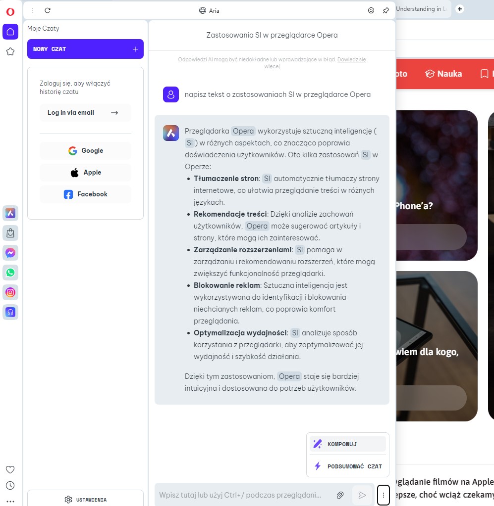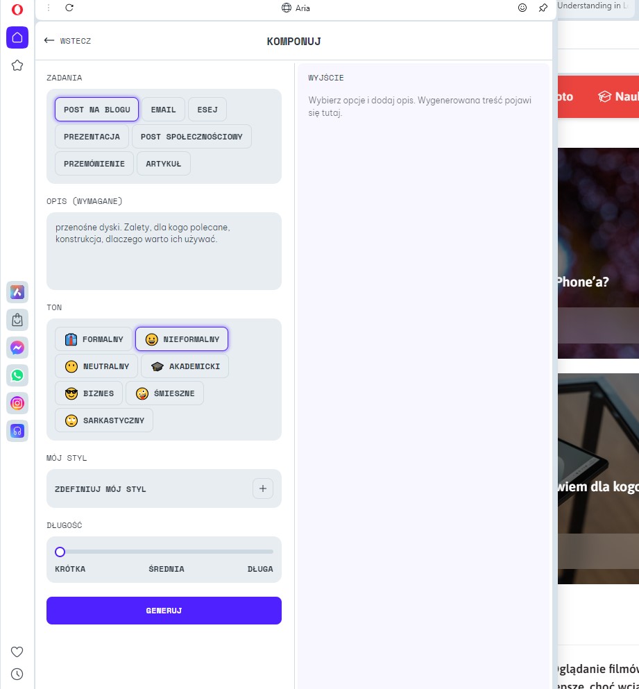 Ale skoro SI może nam generować obrazy, to czemu nie miałaby również treści? Tutaj wystarczy wpisać, co się tylko chce, a następnie wybrać spomiędzy licznych opcji dostosowania treści do zamysłu. Jako przykład niech posłuży nam tekst o… wykorzystaniu SI w przeglądarce Opera. Bez wyznaczania ilości znaków Aria napisze nam tyle, ile uważa za stosowne. Ale… gdy po wygenerowaniu tekstu klikniesz na “Komponuj”, otwiera się przed Tobą ogrom możliwości!