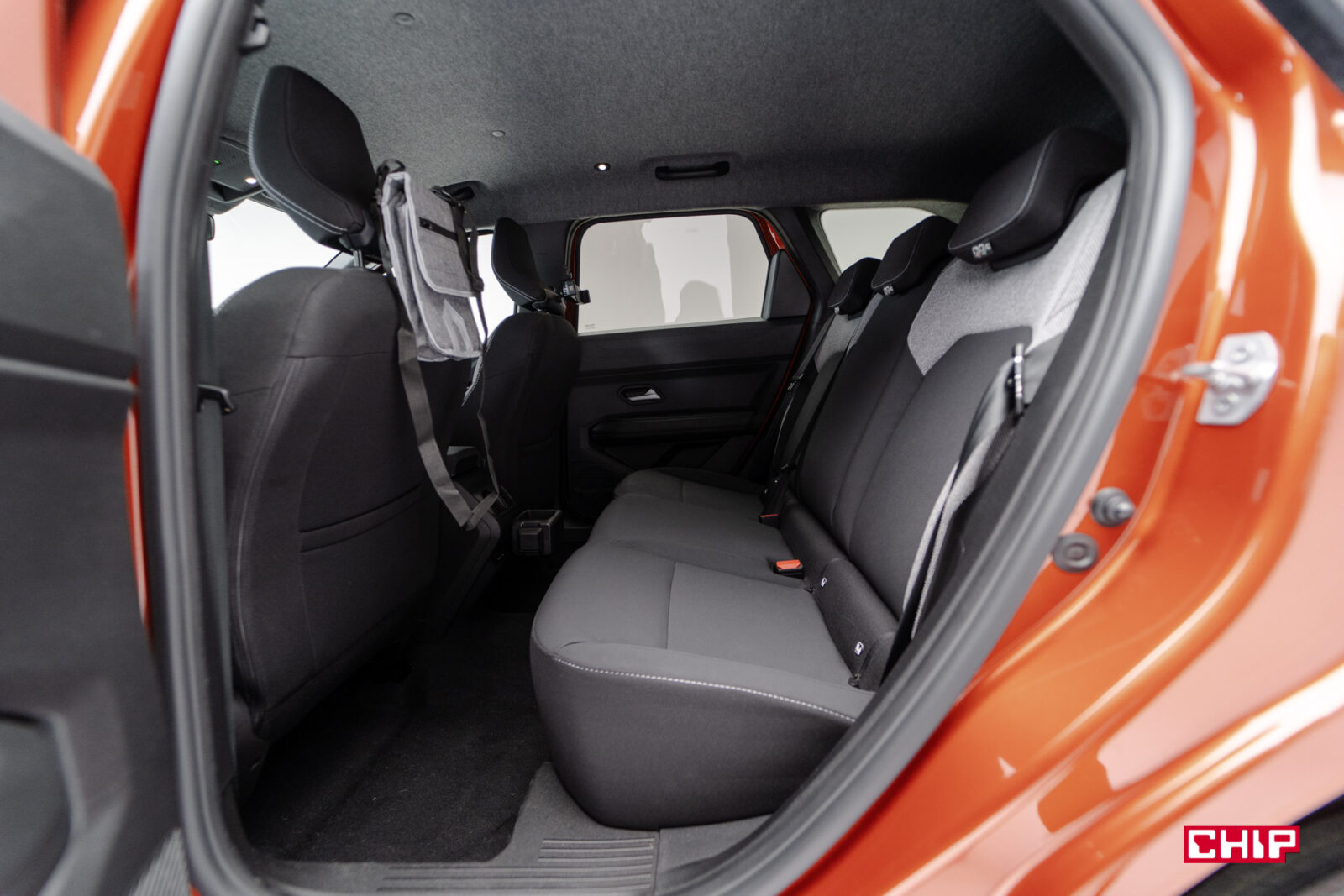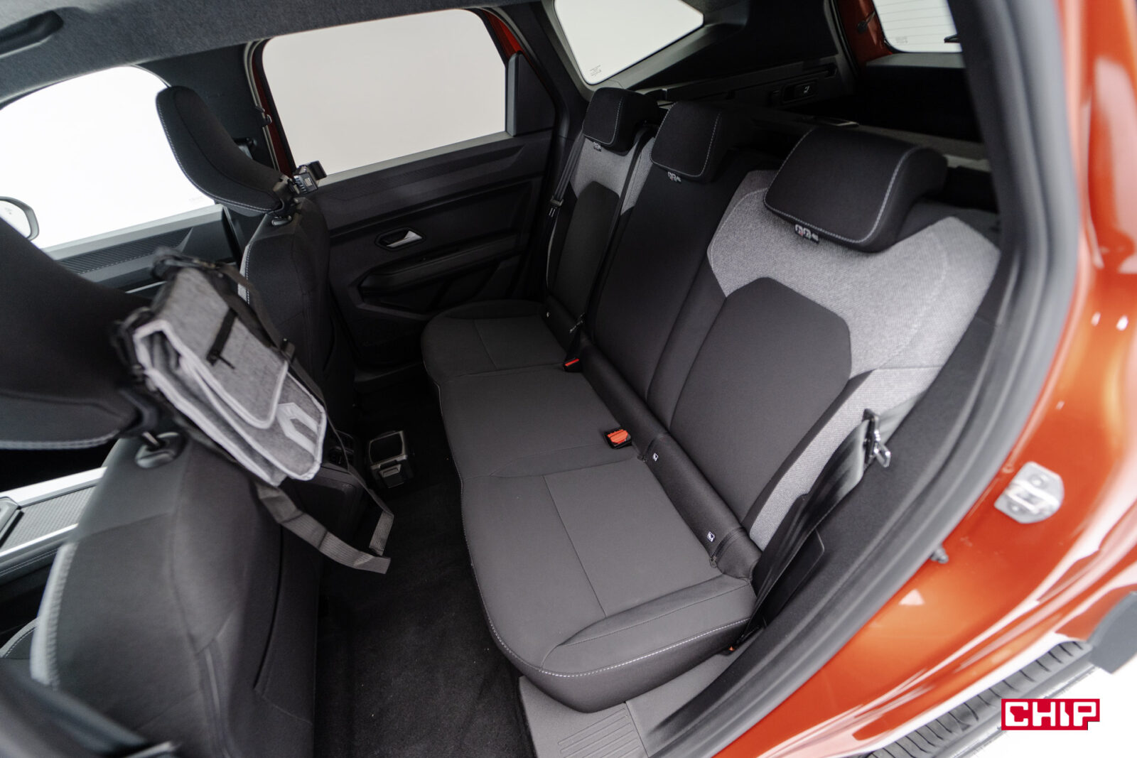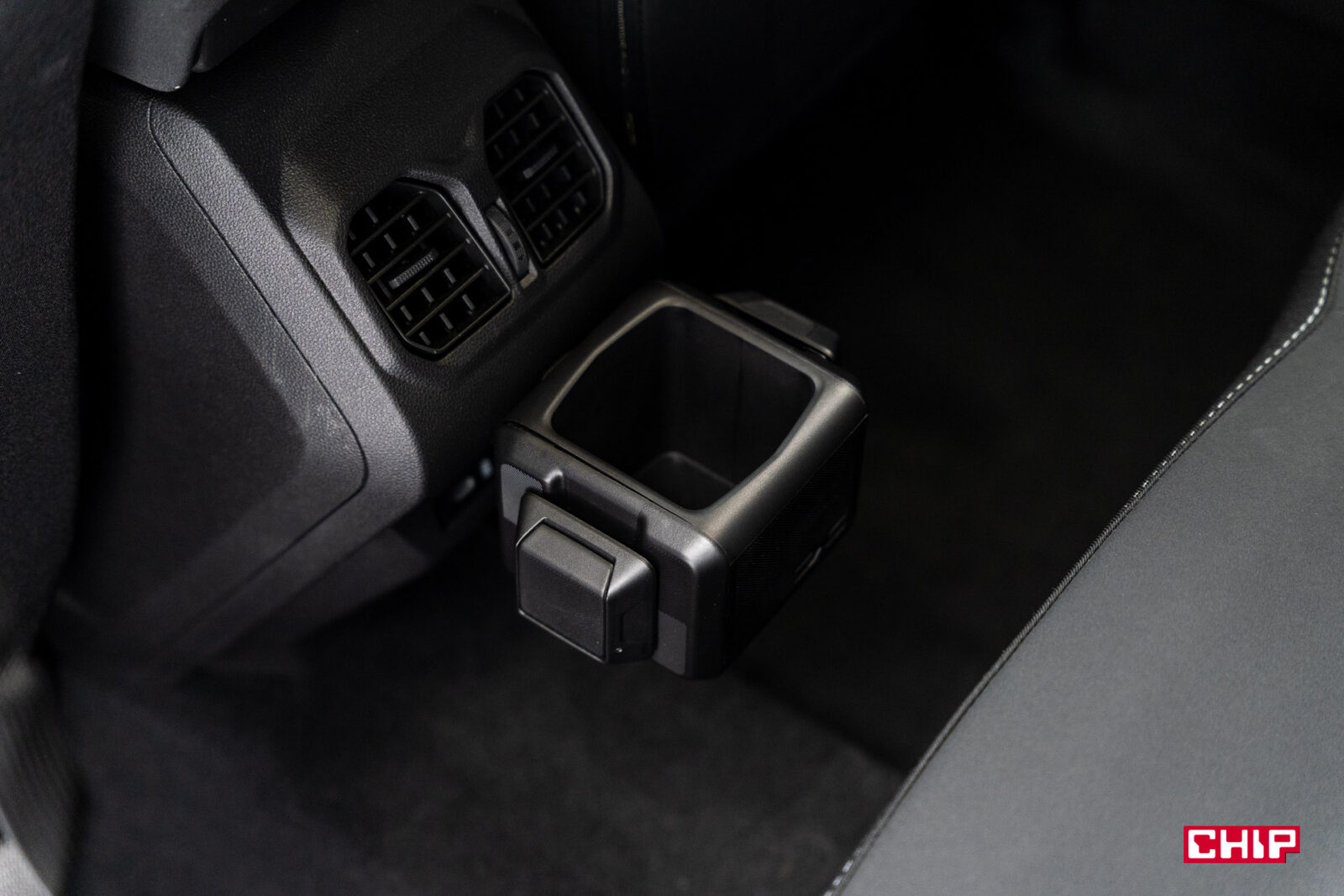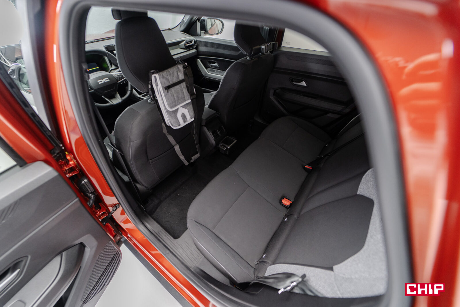 Ze względu na praktycznie taką samą szerokość co w Dusterze, nadal uważam, że dla trzech osób na tylnej kanapie Bigstera będzie ciasno, za to dłuższa bryła daje więcej miejsca na nogi. Choć i w Dusterze go nie brakowało, ale teraz jest zwyczajnie jeszcze bardziej komfortowo. Dwie osoby mogą tu podróżować bardzo wygodnie. Opcjonalnie możemy tu mieć dwa porty USB-C pod nawiewem klimatyzacji oraz rozkładany… teoretycznie podłokietnik, praktycznie jest to położone oparcie środkowego miejsca, więc możemy zajrzeć do bagażnika.