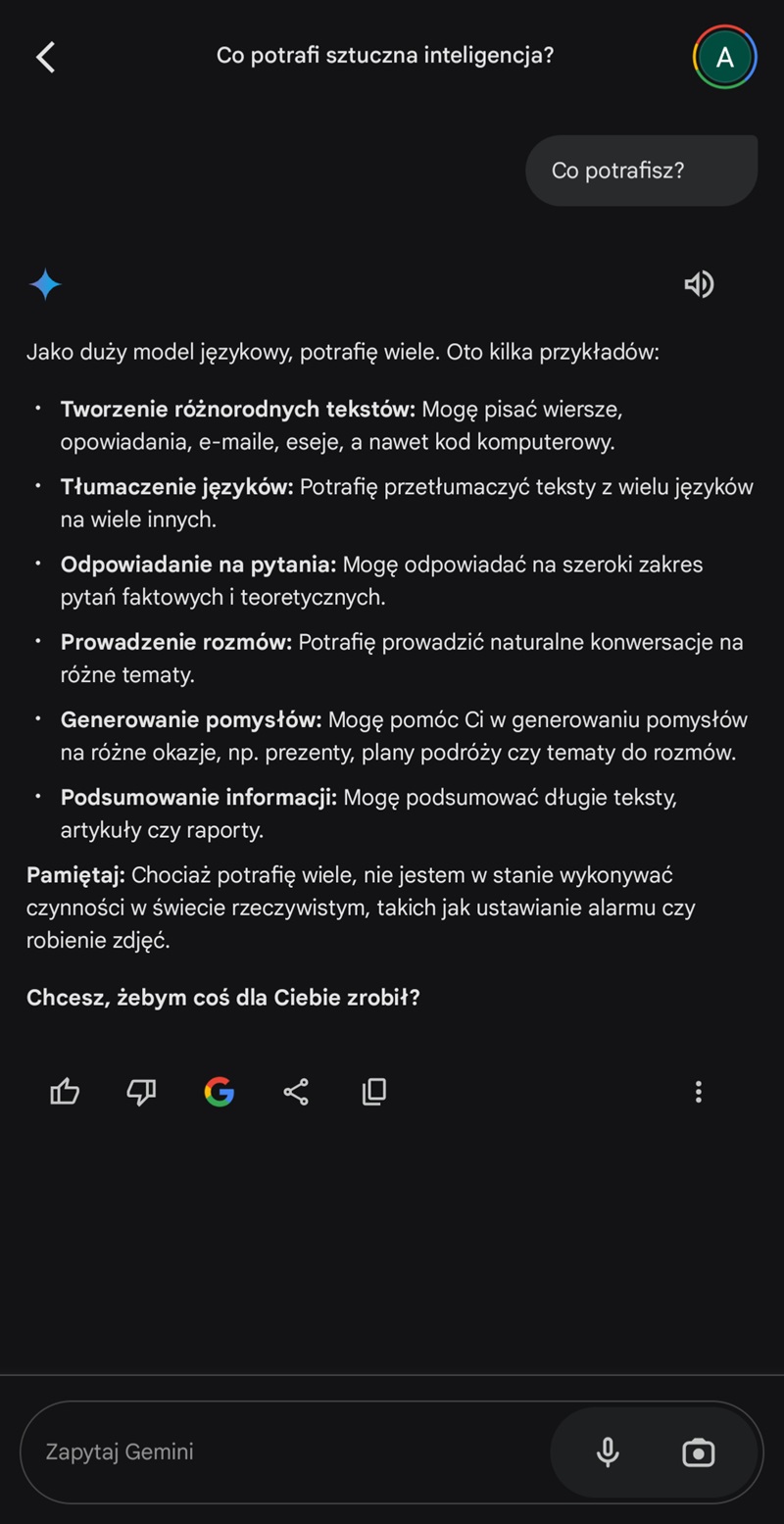 Dalej mamy asystanta Gemini. Co potrafi? Dajmy mu odpowiedzieć samodzielnie: