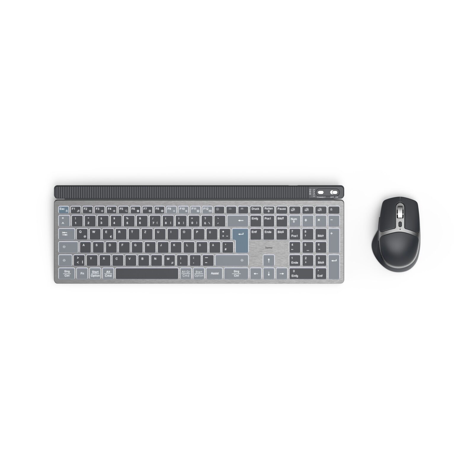 Do pary z klawiaturą Hama WKM-750 producent proponuje myszkę Bluetooth z sześcioma przyciskami i chowanym wewnątrz obudowy odbiornikiem USB. Dzięki połączeniu radiowemu 2,4 GHz i dwóm kanałom Bluetooth w wersji 5.2, przełączanie między urządzeniami jest proste i wygodne za pomocą jednego przycisku. Pełne naładowanie litowo-jonowej baterii klawiatury pozwala na około 20 dni pracy. Akumulator myszy pozwala na ciągłe jej użytkowanie przez nawet 90 dni.