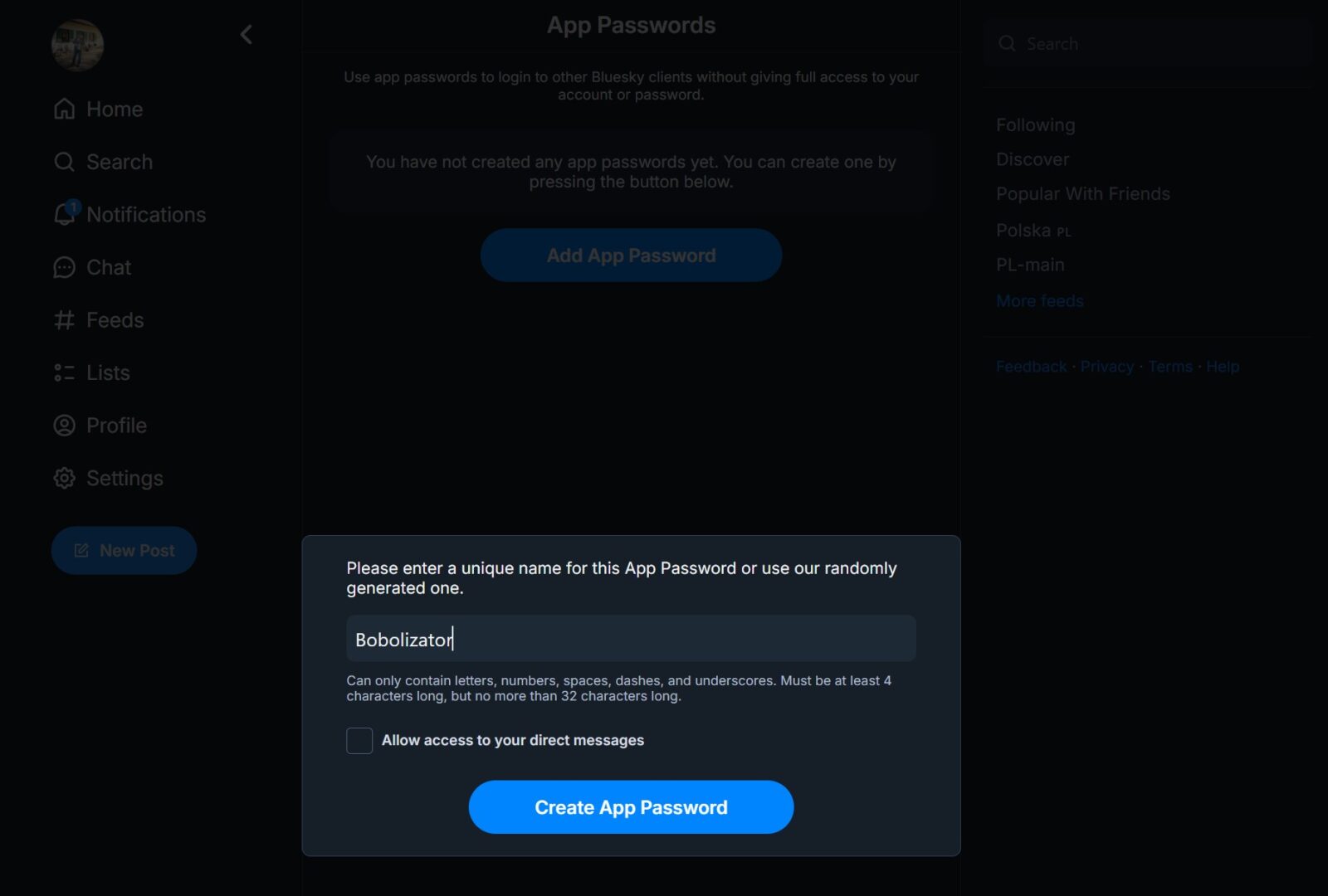 BlueSky obrosło też w liczne aplikacje wspomagające korzystanie z serwisu. Wymagają one rzecz jasna dostępu do naszego konta i tu przestrzegam przed podawaniem naszego hasła – niektóre korzystają z autoryzacji OAuth (jak serwis Unfollow.blue) i te są w pełni bezpieczne, jeśli jednak aplikacja wymaga hasła, to korzystajmy WYŁĄCZNIE z haseł aplikacji, które można stworzyć w ustawieniach. Hasło aplikacji domyślnie nie pozwala także na zajrzenie do naszych prywatnych chatów, czyli wiadomości bezpośrednich.