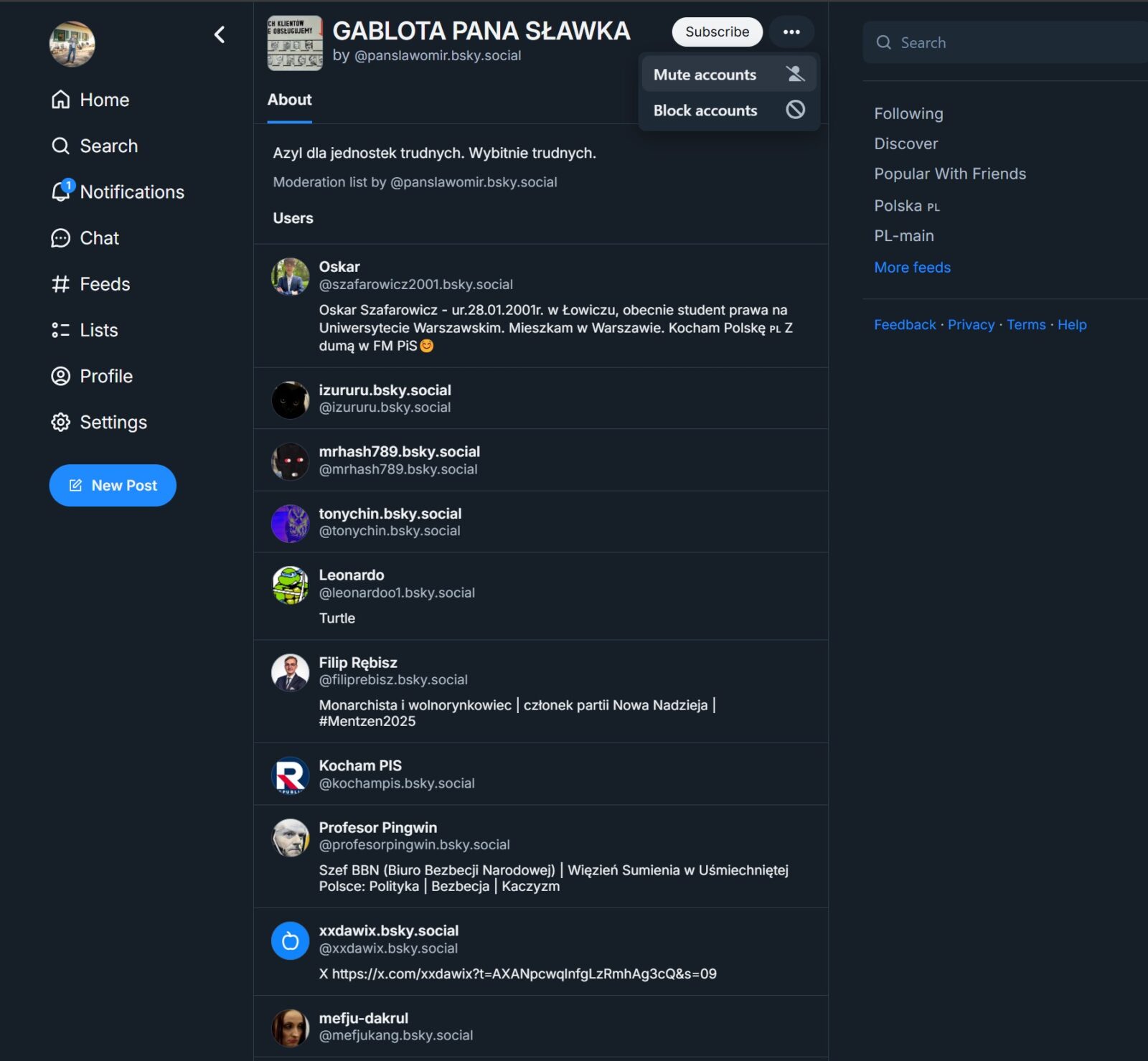 Dodanie przez twórcę kolejnych pozycji do takiej listy oznacza, że automatycznie u nas TAKŻE zostanie on dodany do zablokowanych lub wyciszonych, jeśli tak ją ustawiliśmy, warto więc korzystać z takich, co do których mamy zaufanie. Masowy przypływ użytkowników z Polski na BlueSky przyciągnął oczywiście także konta siejące dezinformację i zajmujące się trollowaniem, co w reakcji spowodowało powstanie oddolnych mechanizmów i list, mających izolować takie jednostki.