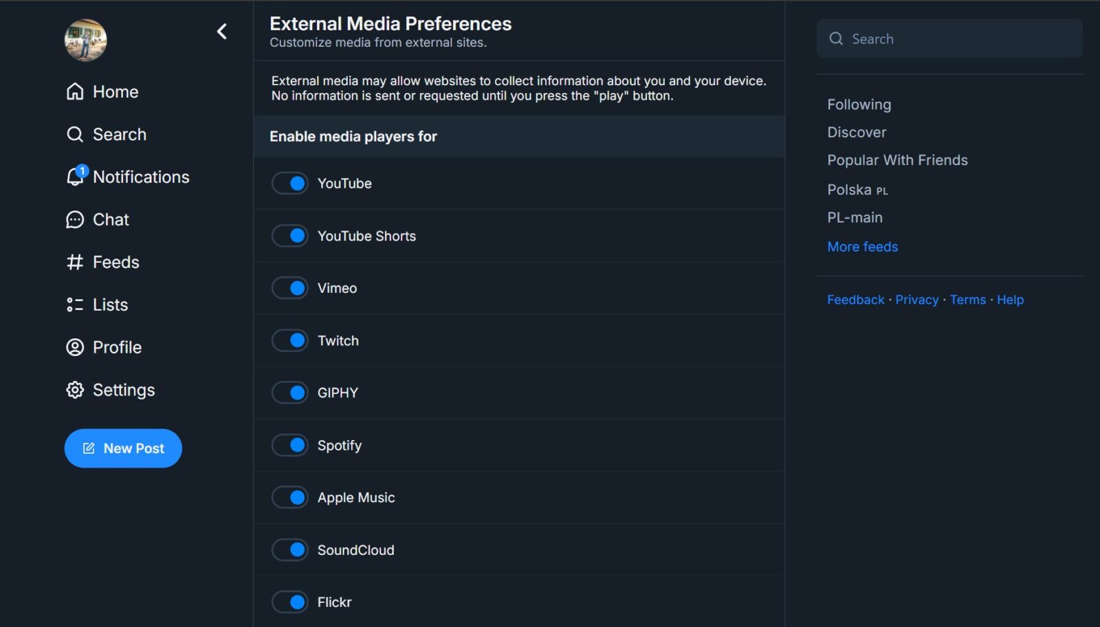 Kluczowe dla jak najprzyjemniejszego korzystania z serwisu jest to, że możemy sobie stworzyć własny feed lub skorzystać ze stworzonego przez innych użytkowników i przypiąć go jako zakładkę do strony głównej. Można też każdy z domyślnych usunąć – BlueSky nam niczego tu nie narzuca, to jest nasz feed i tylko od nas zależy, co będziemy tu oglądać. Sposób prezentacji informacji także można skonfigurować – od nas zależy, czy stare odpowiedzi będą wyświetlane na górze, czy znajdziemy tam nowe wpisy. Na wygląd feeda wpływa także i to, czy damy zgodę BlueSky na wykorzystanie wbudowanych odtwarzaczy mediów – jeśli nie, to by zobaczyć zawartość multimedialną, trzeba będzie kliknąć link. A jeśli nie wiemy jeszcze, co chcemy oglądać i kogo śledzić, BlueSky udostępnia publiczny katalog tzw. starter packów, czyli kont polecanych przez społeczność. Możecie także przygotować własny.