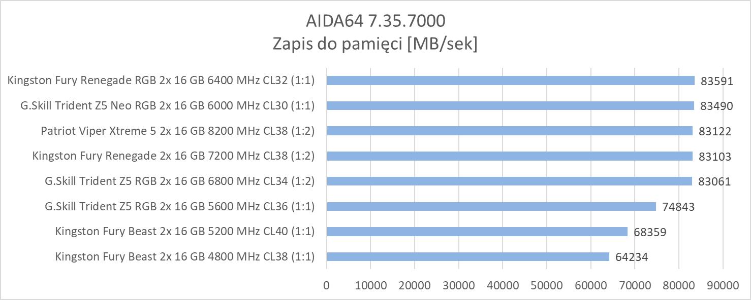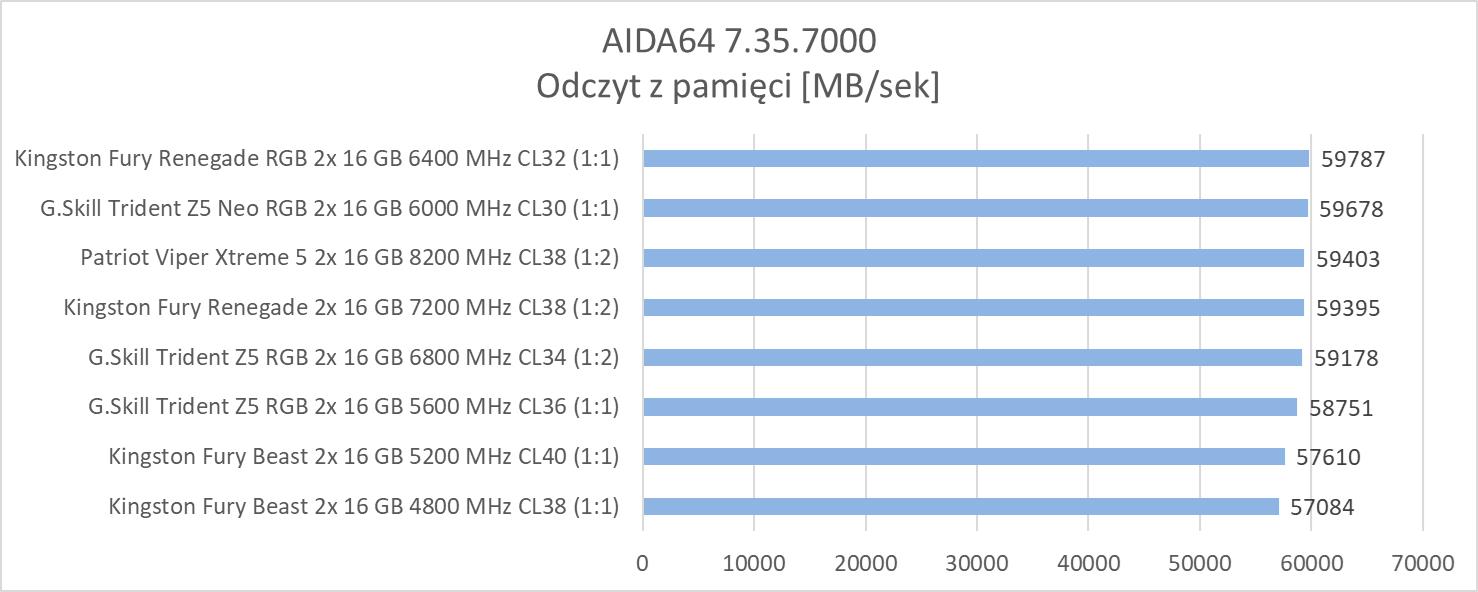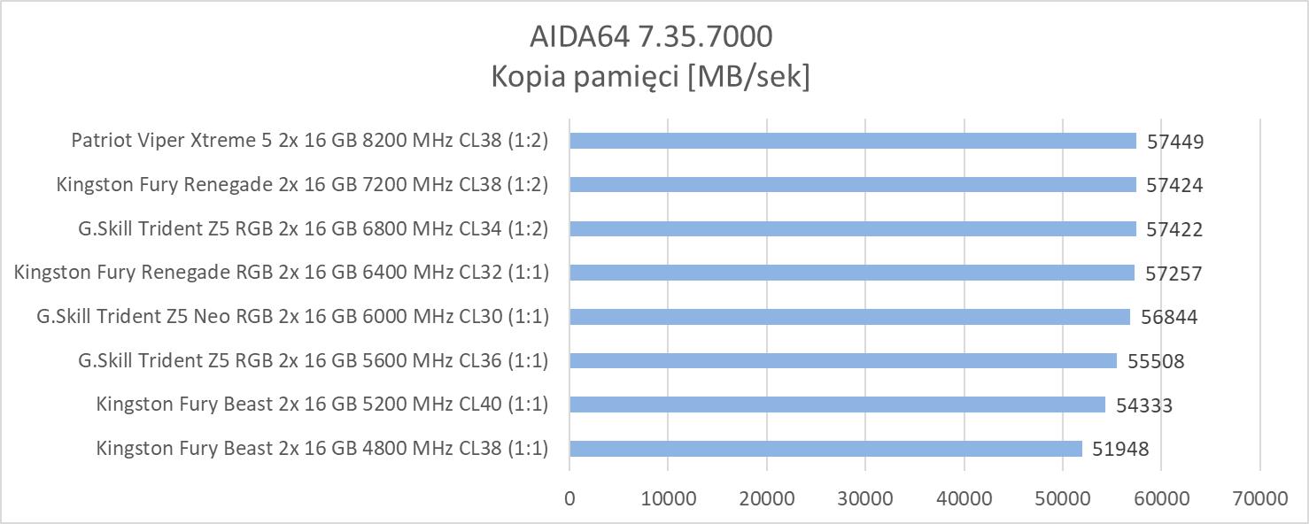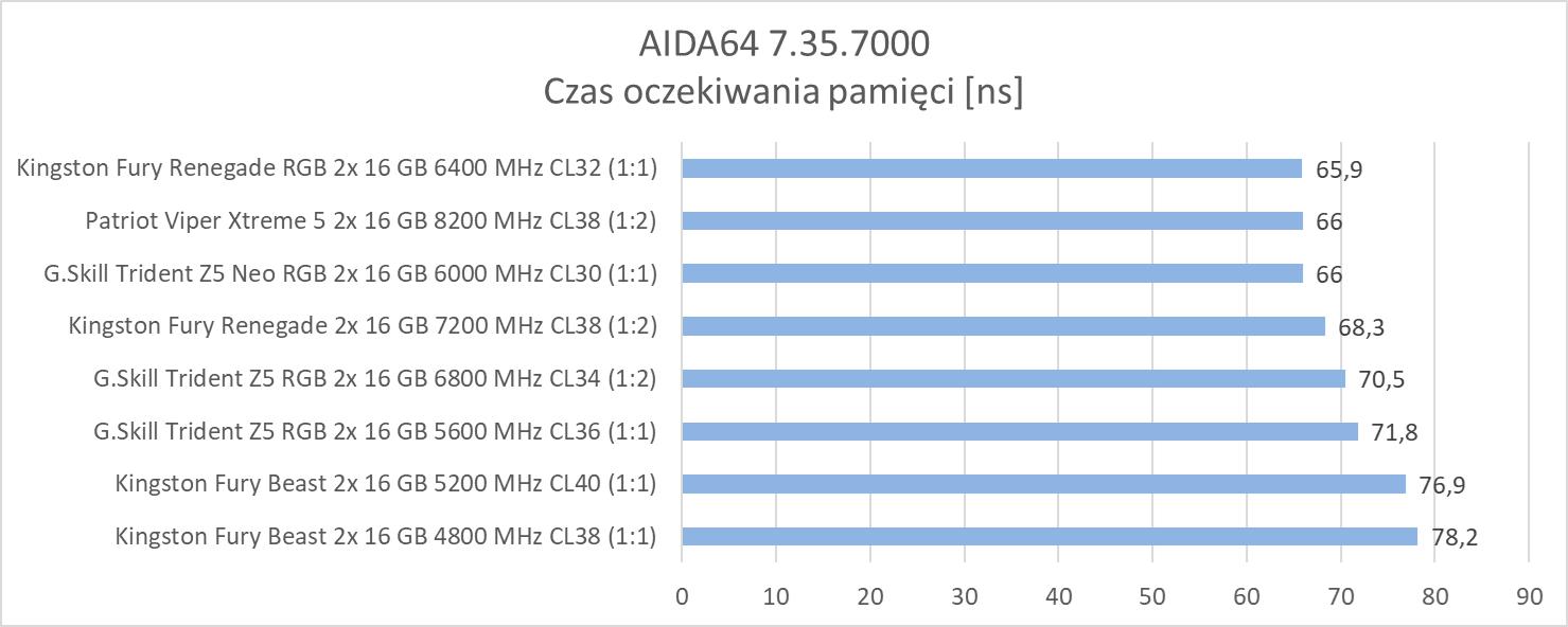 AIDA64 to jeden z najpopularniejszych programów służących do diagnostyki komputera. W programie przeprowadzone zostały testy odczytu z pamięci, zapisu do pamięci, kopi pamięci oraz czasu oczekiwania pamięci.