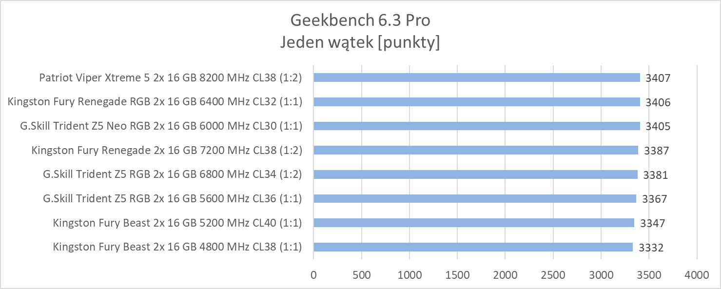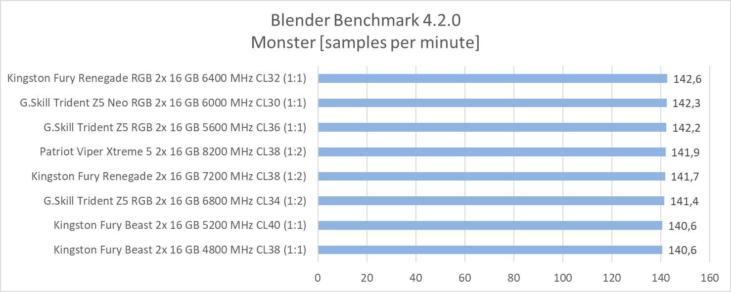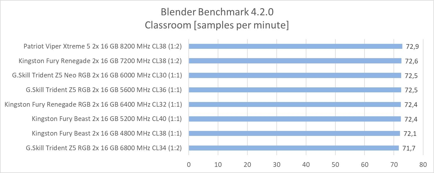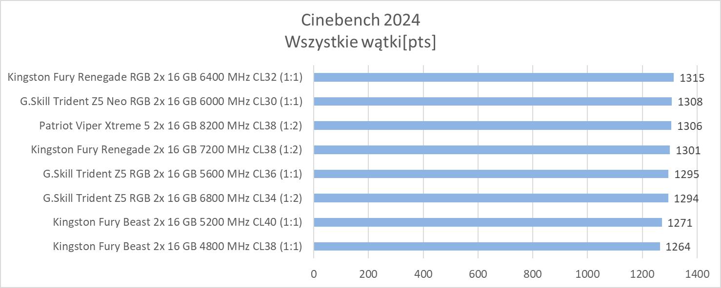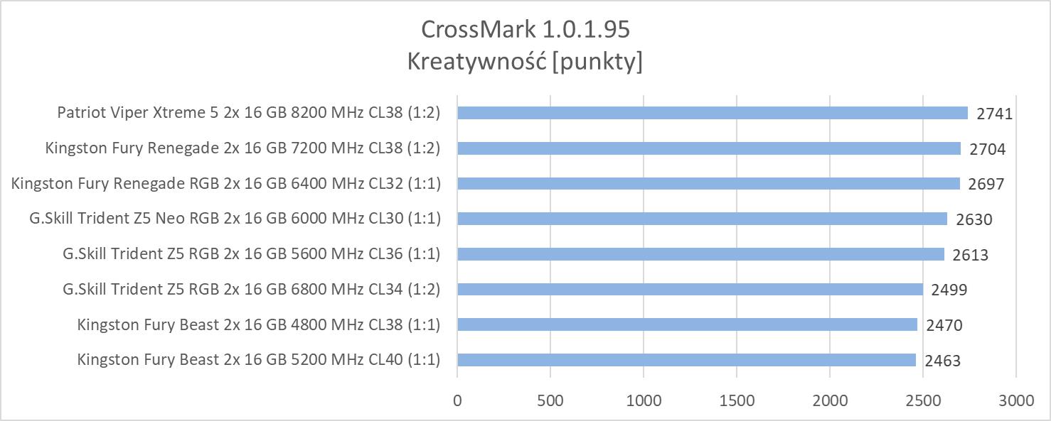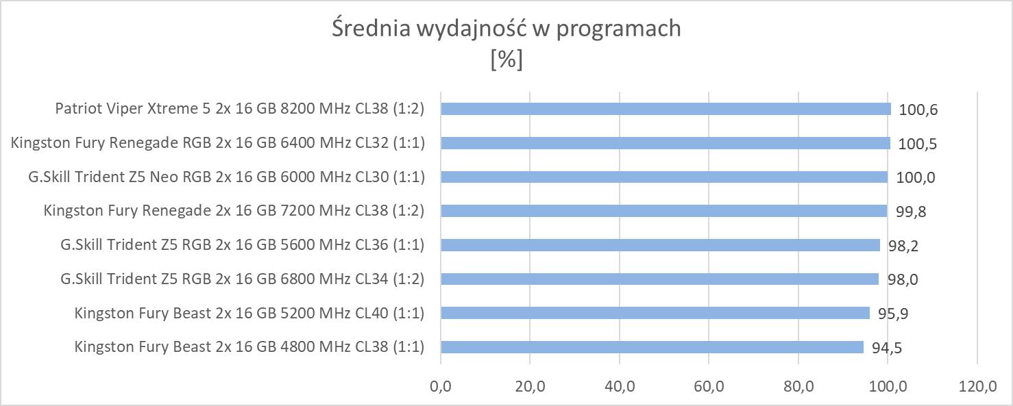 W programach dużych różnic pomiędzy pamięciami nie widać. Oczywiście – jeśli weźmiemy pod uwagę najwolniejsze i najszybsze to różnica będzie widoczna, ale tak naprawdę od pamięci 6000 MHz 1:1 czy 7200 1:2 różnic nie ma przy średniej. Warto też zauważyć, że słabo wypadają pamięci 6800 MHz w trybie 1:2 – wynik na poziomie 5600 MHz jest naprawdę niski. Pamięci 7200 MHz 1:2 wypadają podobnie do 6000 MHz 1:1, a 8200 MHz 1:2 są podobne do 6400 1:1.