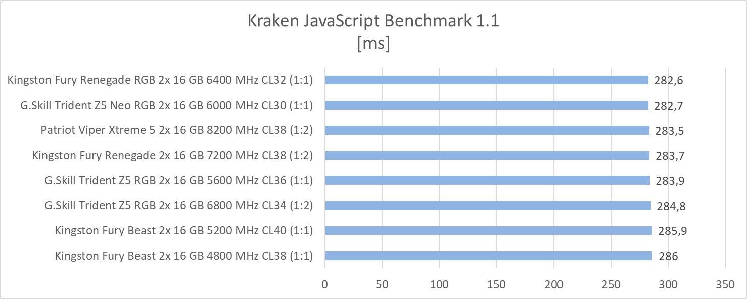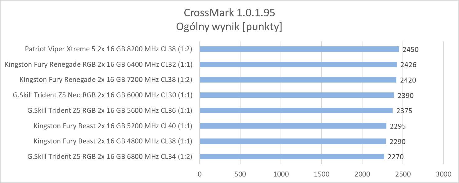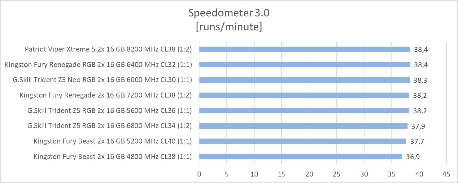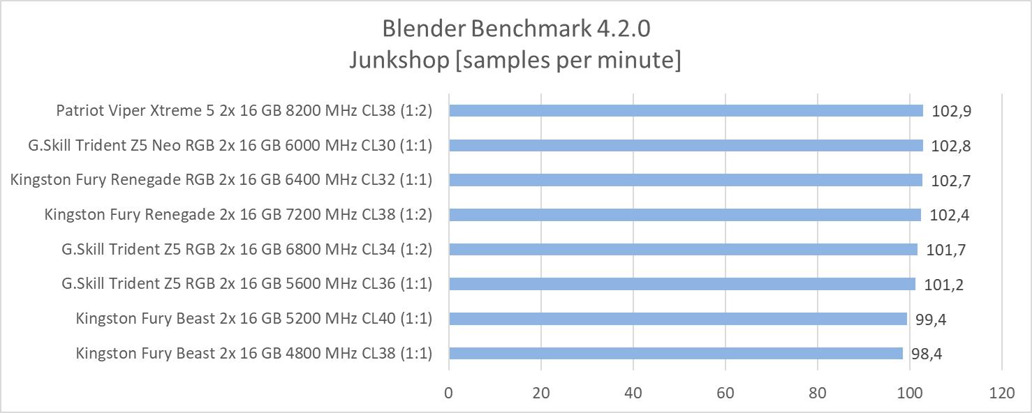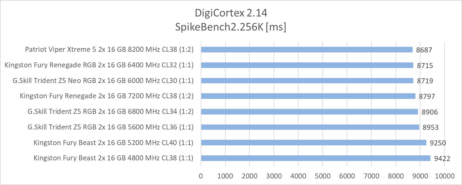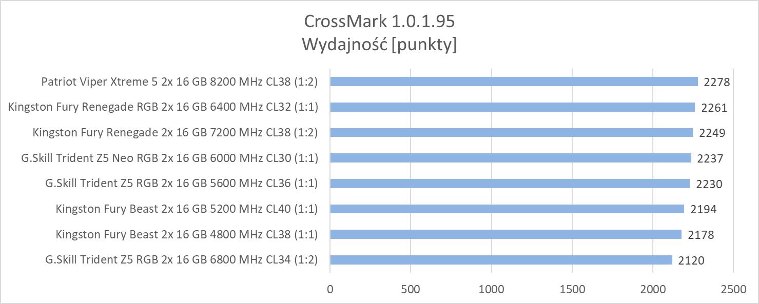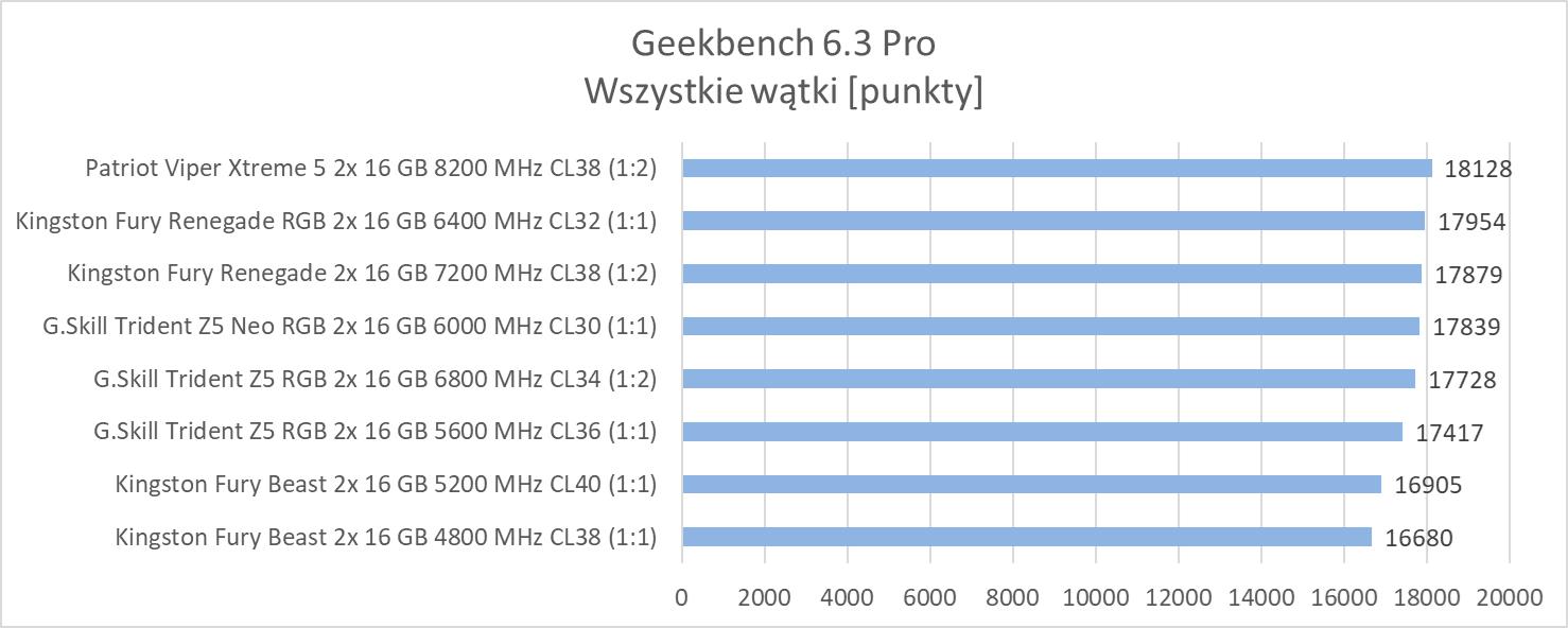 W programach dużych różnic pomiędzy pamięciami nie widać. Oczywiście – jeśli weźmiemy pod uwagę najwolniejsze i najszybsze to różnica będzie widoczna, ale tak naprawdę od pamięci 6000 MHz 1:1 czy 7200 1:2 różnic nie ma przy średniej. Warto też zauważyć, że słabo wypadają pamięci 6800 MHz w trybie 1:2 – wynik na poziomie 5600 MHz jest naprawdę niski. Pamięci 7200 MHz 1:2 wypadają podobnie do 6000 MHz 1:1, a 8200 MHz 1:2 są podobne do 6400 1:1.