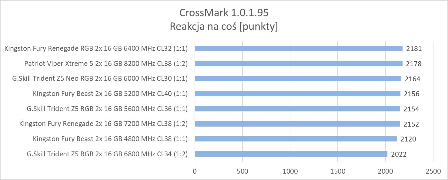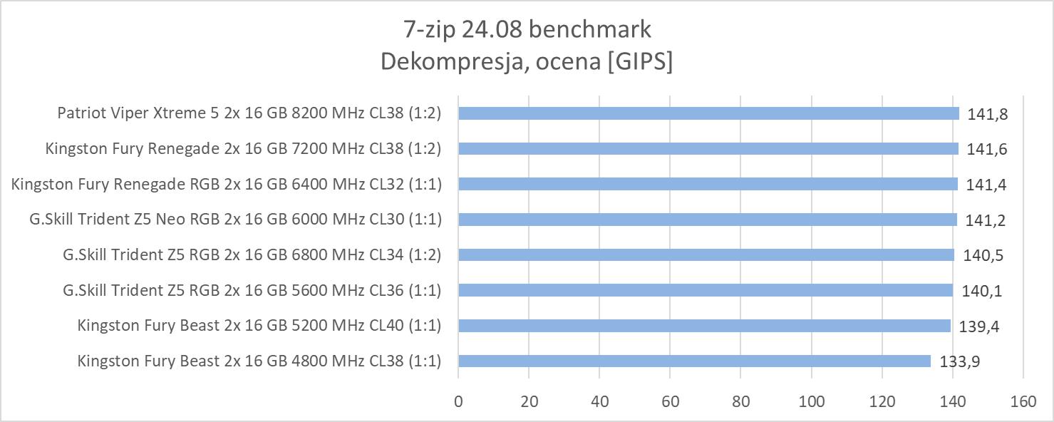 Patrząc na ceny z pewnością nie warto rozważać kości 4800, 5200 czy 5600 MHz. Tutaj różnice w stosunku do 6000 MHz CL30 są widoczne, choć nadal nie należą do dużych. Natomiast biorąc pod uwagę podobne ceny to nie ma co nawet rozważać wolniejszych. Z pewnością też 6800 MHz działające przy 1:2 nie są kompletnie warte rozważania. Kości 7200 MHz 1:2 wypadają podobnie do 6000 MHz 1:1, więc ich zakup też ma mniejszy sens. 8200 MHz 1:2 wypadają podobnie do 6400 MHz 1:2, więc sytuacja jest podobna. Plus 8200 MHz nie musi Wam ruszyć na każdej płycie. Natomiast jeśli planujecie rozbudowę w przyszłości sprzętu, liczycie, że kolejne generacje procesorów AMD mogą coś zmienić w kwestii częstotliwości przy 1:1, może będziecie rozważać przejście na Intela, to szybsze kości mogą okazać się bardziej przyszłościowe. W takim wypadku można rozważyć ich zakup, ale na ten moment zdecydowanie najlepiej wypadają kości 6000 MHz CL30 i 6400 MHz CL32 (o ile Wam ruszą bez problemów w trybie 1:1), a różnicę do droższych lepiej przeznaczyć na inne podzespoły.
