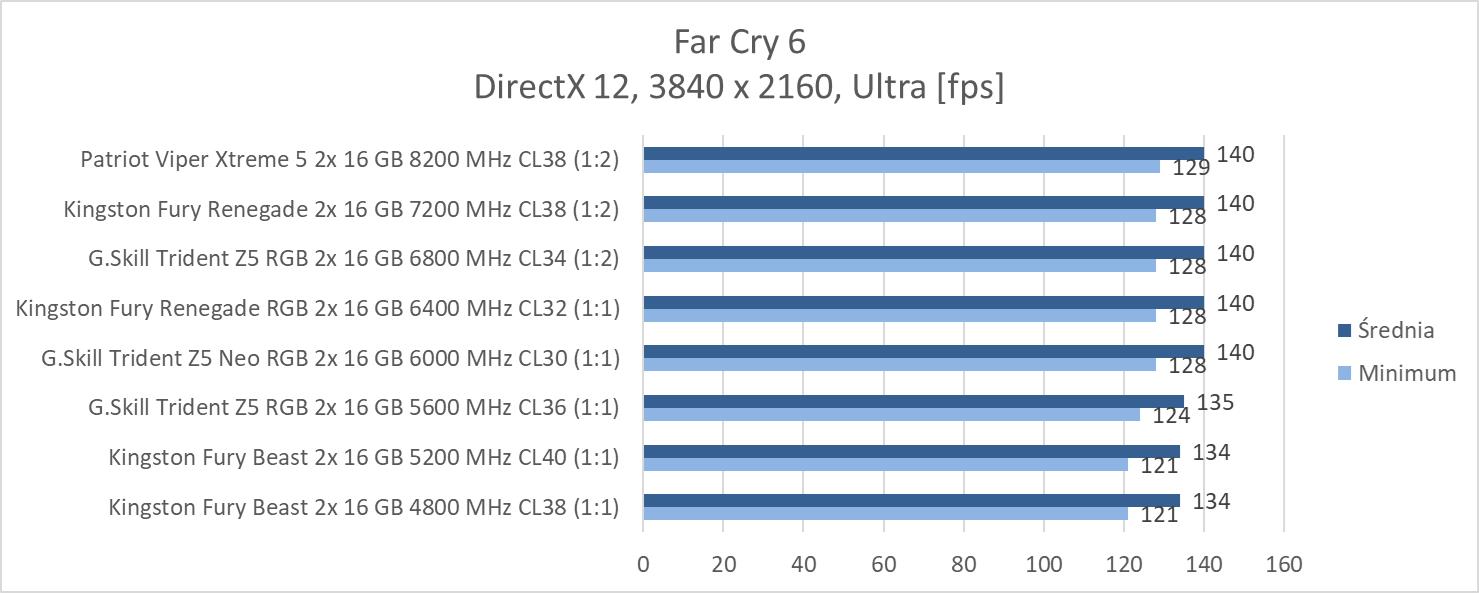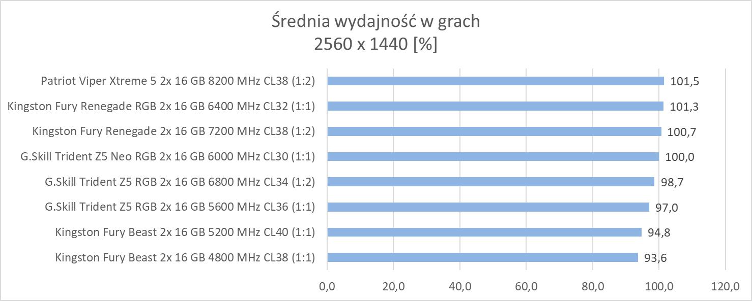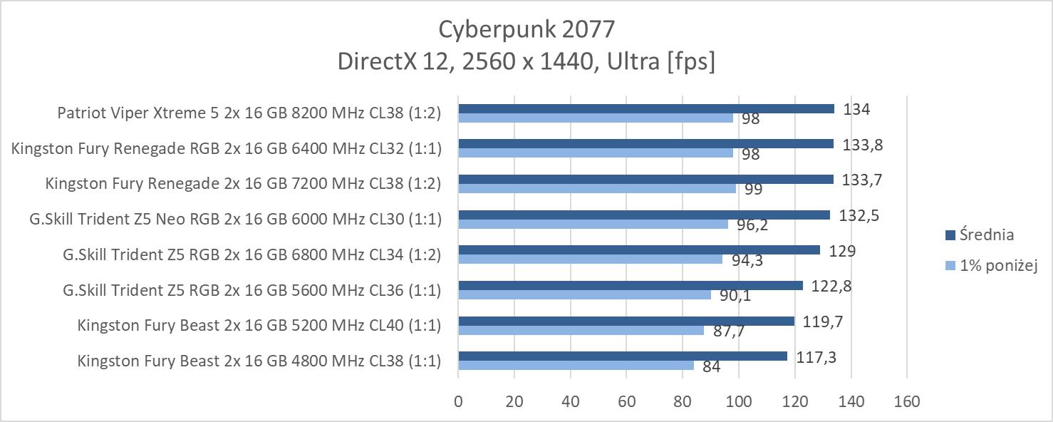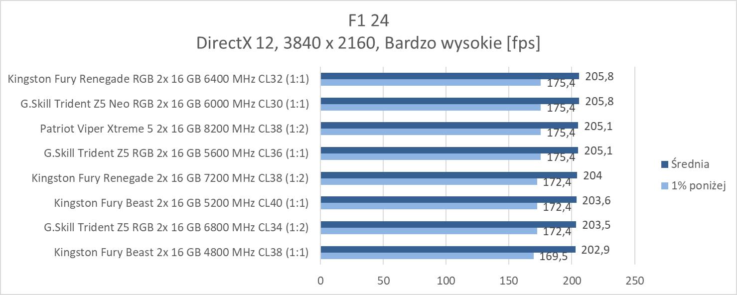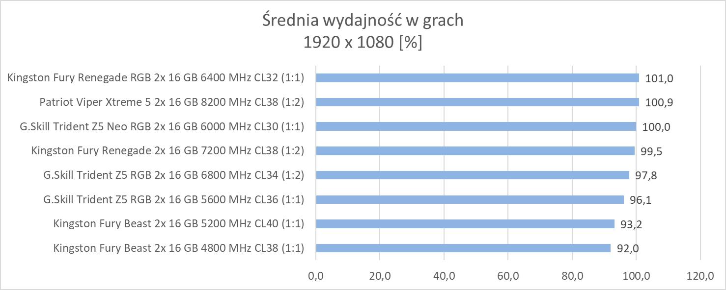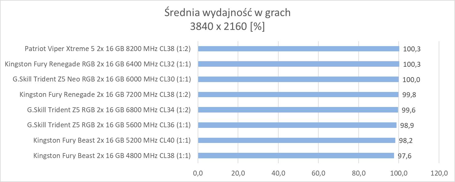 W grach jest podobna sytuacja. Tutaj różnice pomiędzy najtańszymi a najdroższymi będą widoczne w 1920 x 1080 i 2560 x 1440 – dopiero w ostatniej są znacznie mniejsze, co jest zgodne z oczekiwaniami. Ponownie pamięci 6800 MHz 1:2 wypadają blisko 5600 MHz 1:1, więc tutaj ich zakup kompletnie mija się z celem. 7200 MHz 1:2 notują wyniki bliskie 6000 MHz 1:1, a 8200 MHz 1:2 walczą o prowadzenie z 6400 1:1 -tutaj różnice nie są duże.
