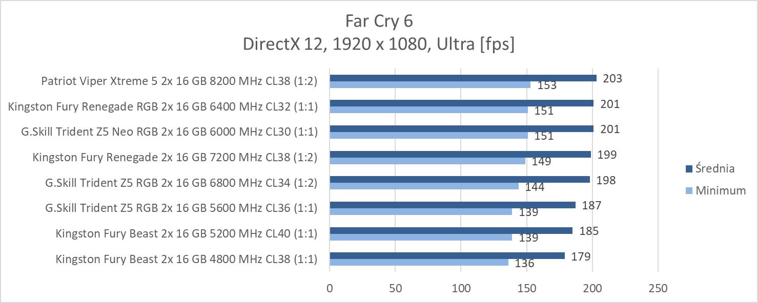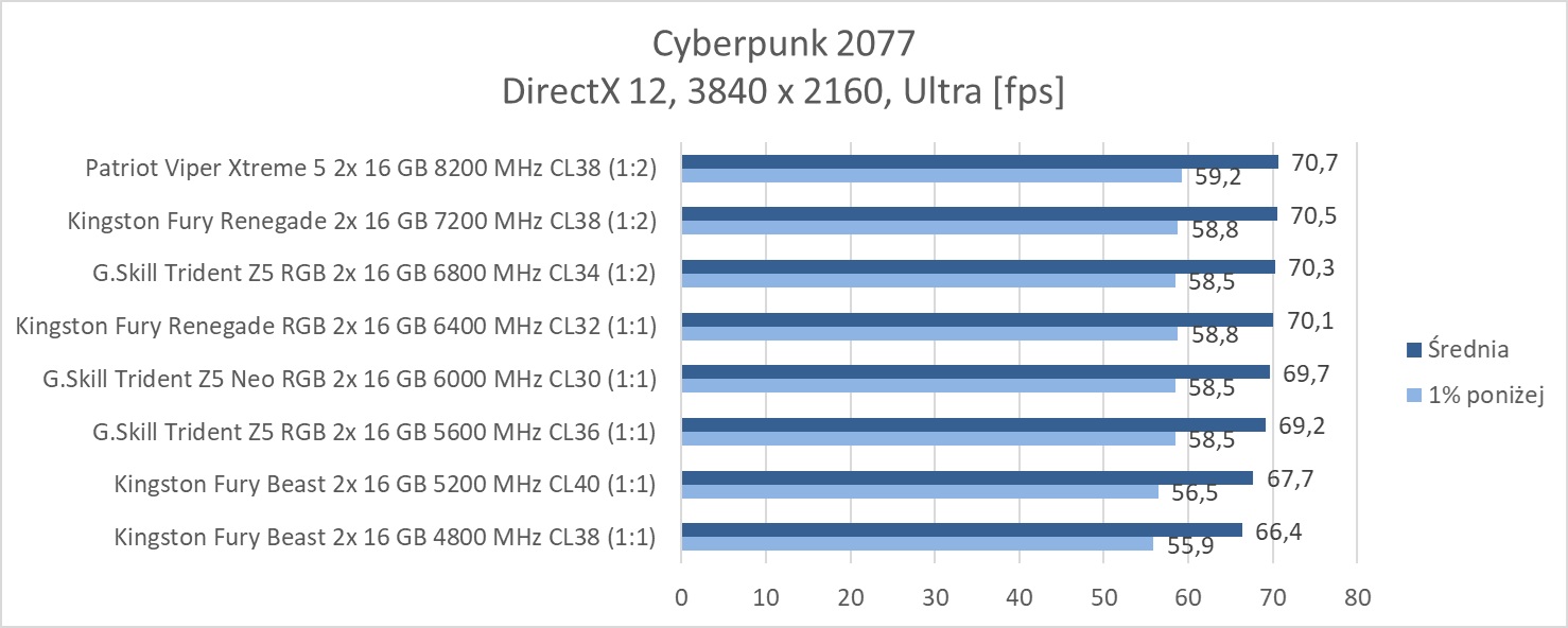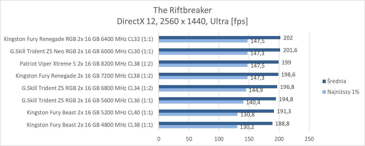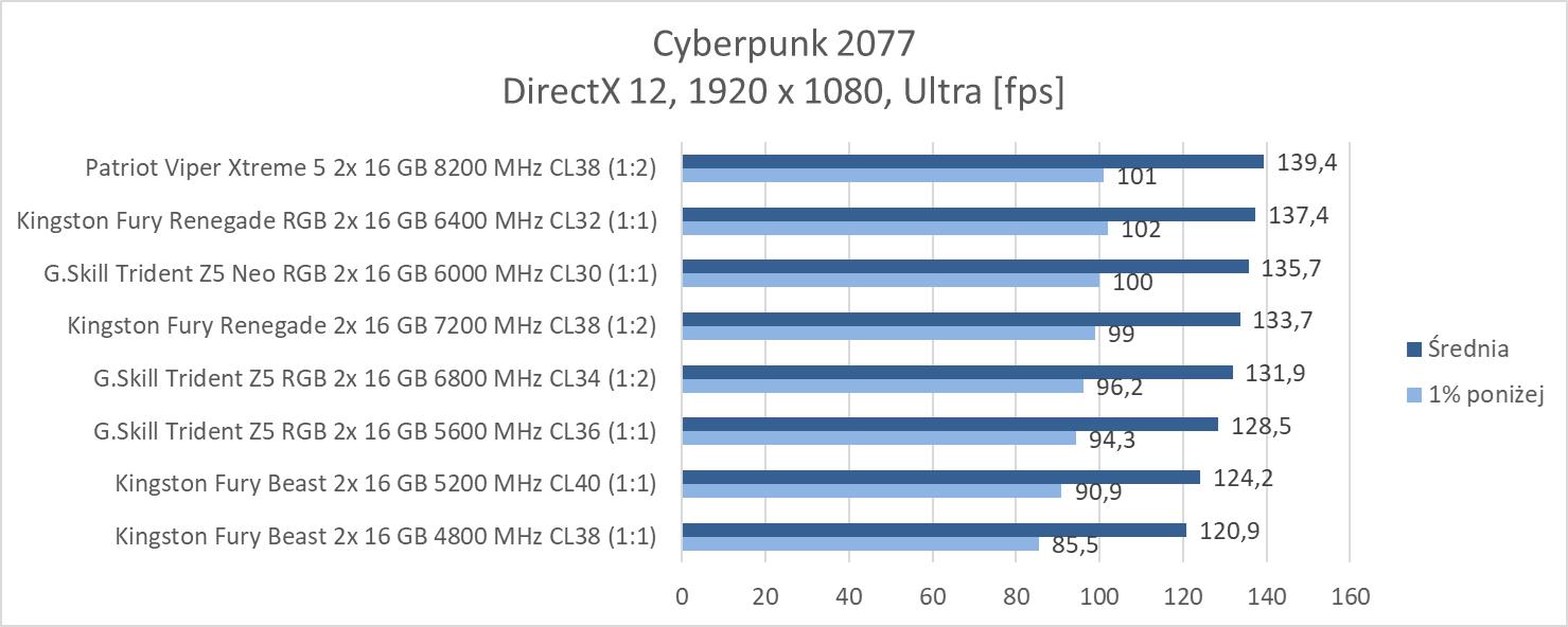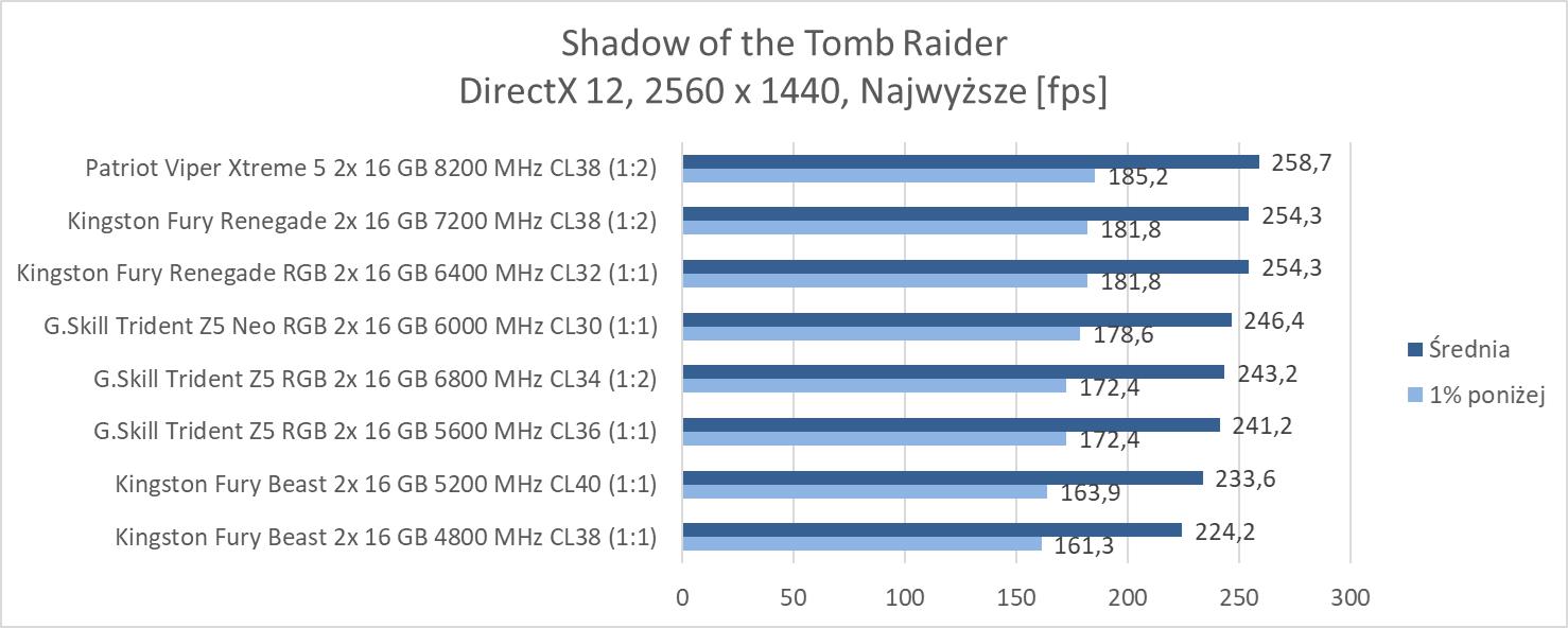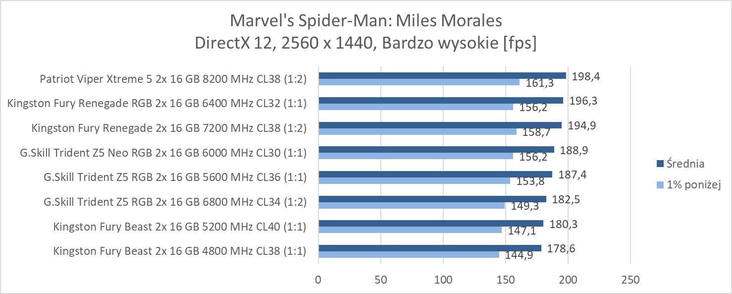 W grach jest podobna sytuacja. Tutaj różnice pomiędzy najtańszymi a najdroższymi będą widoczne w 1920 x 1080 i 2560 x 1440 – dopiero w ostatniej są znacznie mniejsze, co jest zgodne z oczekiwaniami. Ponownie pamięci 6800 MHz 1:2 wypadają blisko 5600 MHz 1:1, więc tutaj ich zakup kompletnie mija się z celem. 7200 MHz 1:2 notują wyniki bliskie 6000 MHz 1:1, a 8200 MHz 1:2 walczą o prowadzenie z 6400 1:1 -tutaj różnice nie są duże.