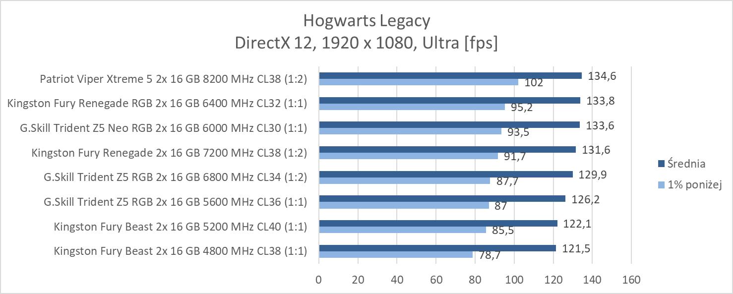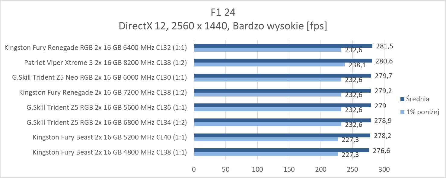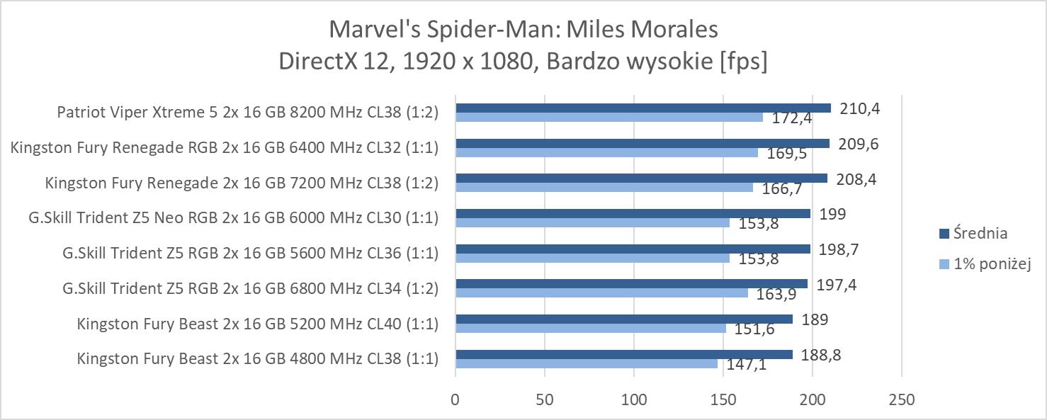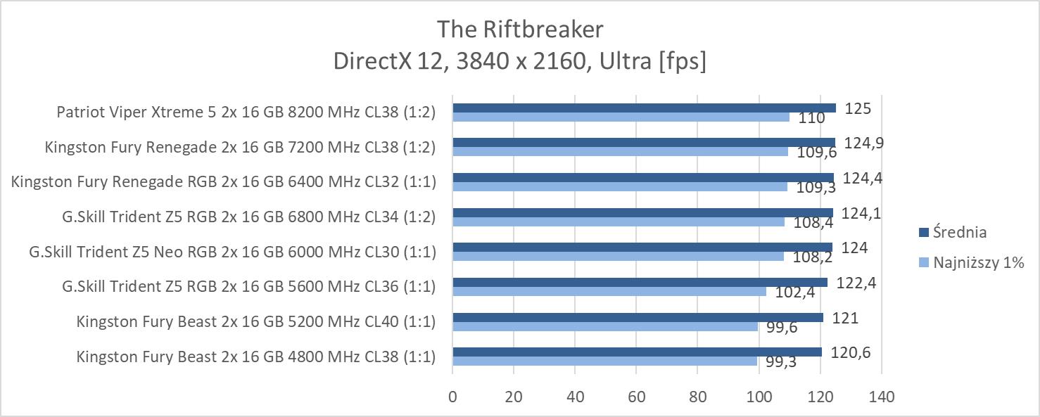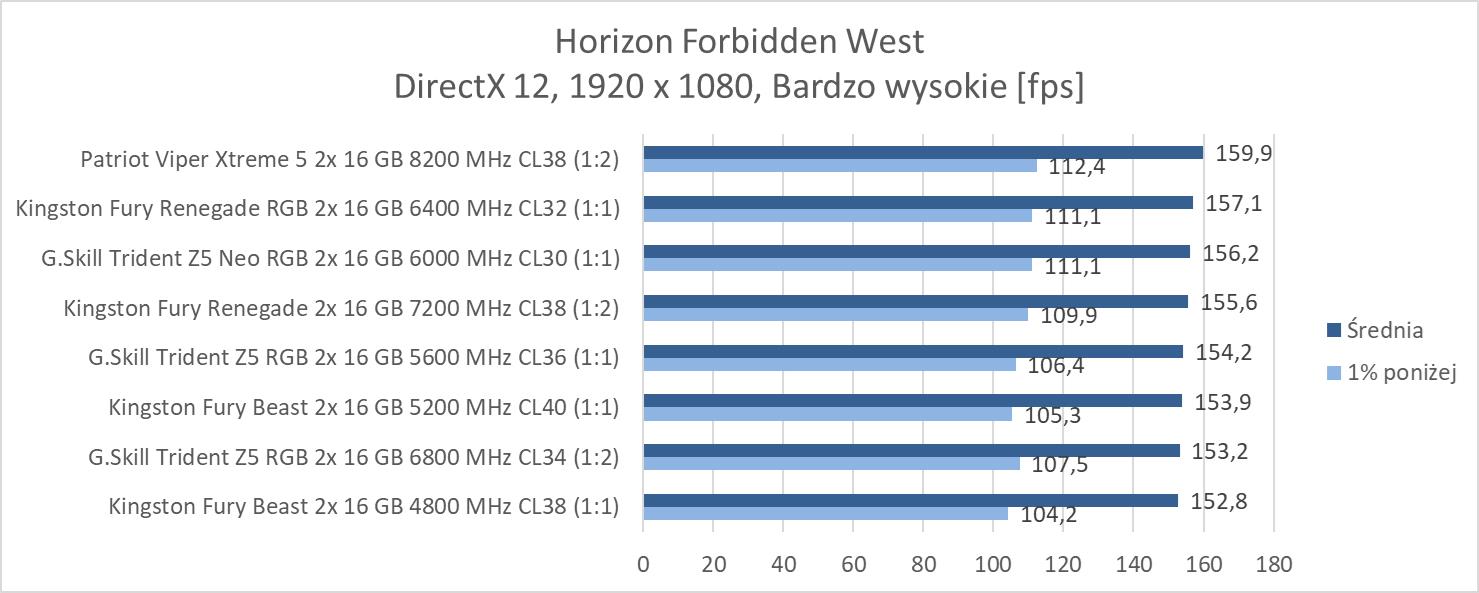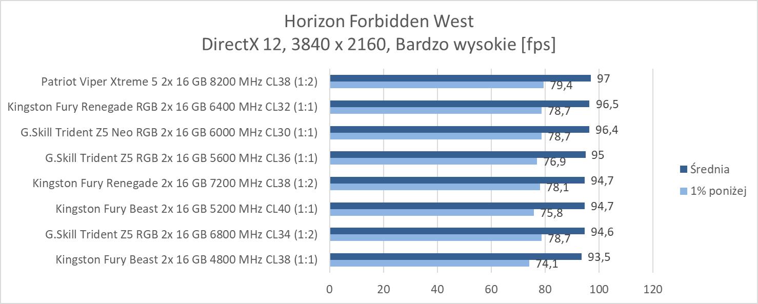 W grach jest podobna sytuacja. Tutaj różnice pomiędzy najtańszymi a najdroższymi będą widoczne w 1920 x 1080 i 2560 x 1440 – dopiero w ostatniej są znacznie mniejsze, co jest zgodne z oczekiwaniami. Ponownie pamięci 6800 MHz 1:2 wypadają blisko 5600 MHz 1:1, więc tutaj ich zakup kompletnie mija się z celem. 7200 MHz 1:2 notują wyniki bliskie 6000 MHz 1:1, a 8200 MHz 1:2 walczą o prowadzenie z 6400 1:1 -tutaj różnice nie są duże.
