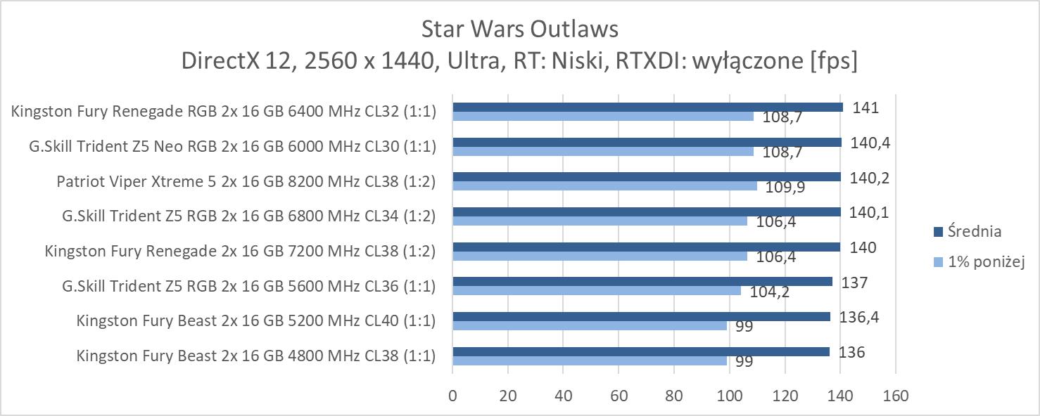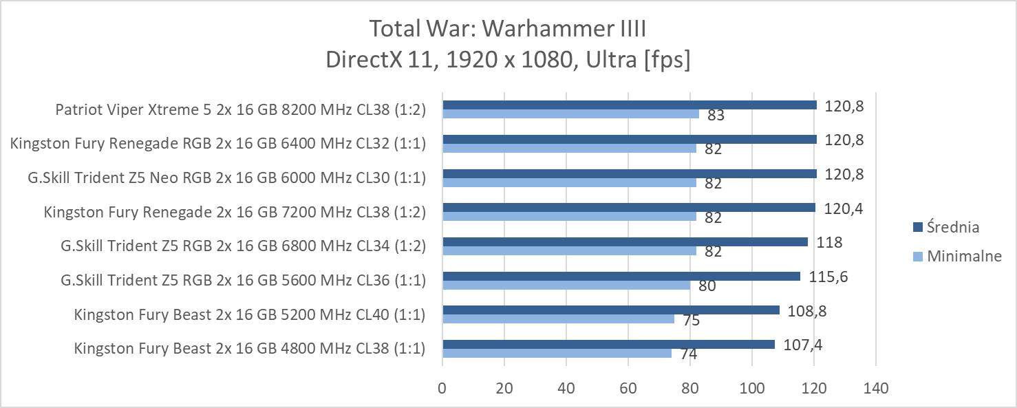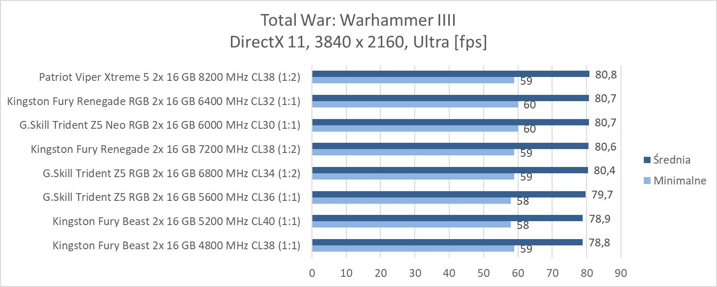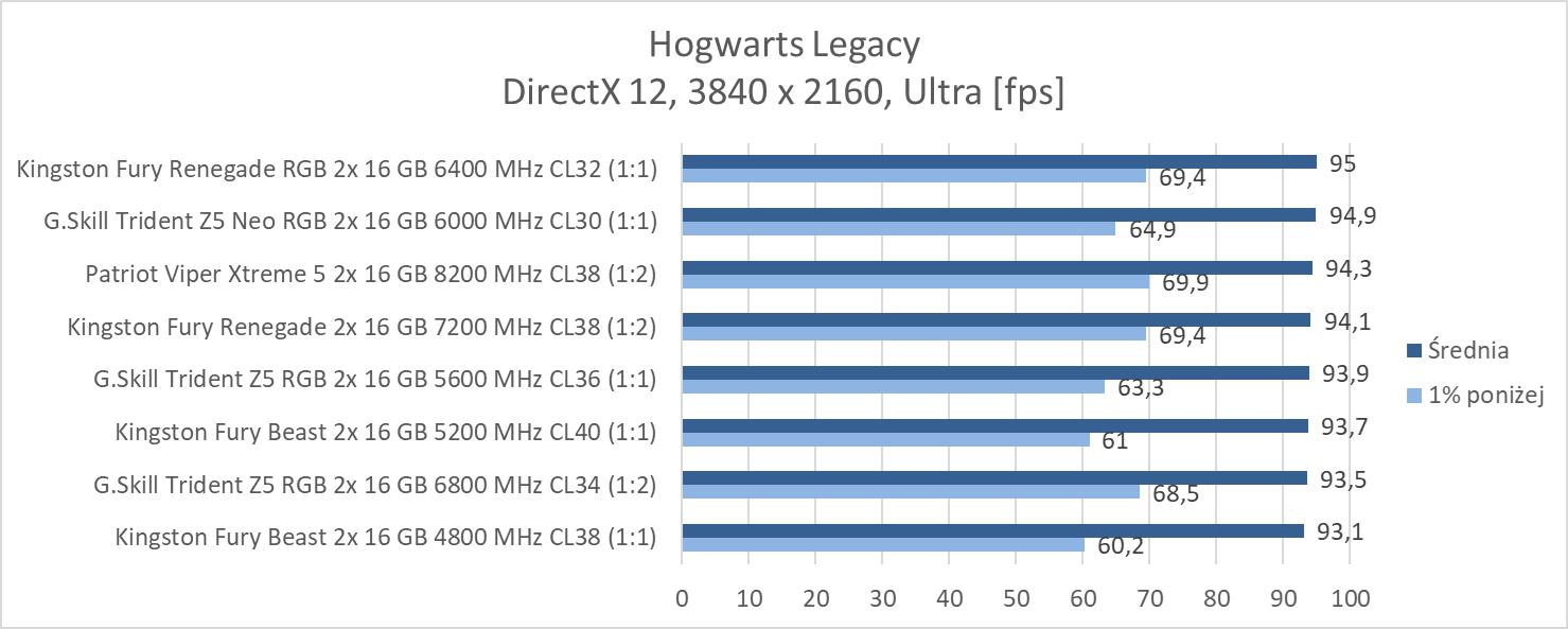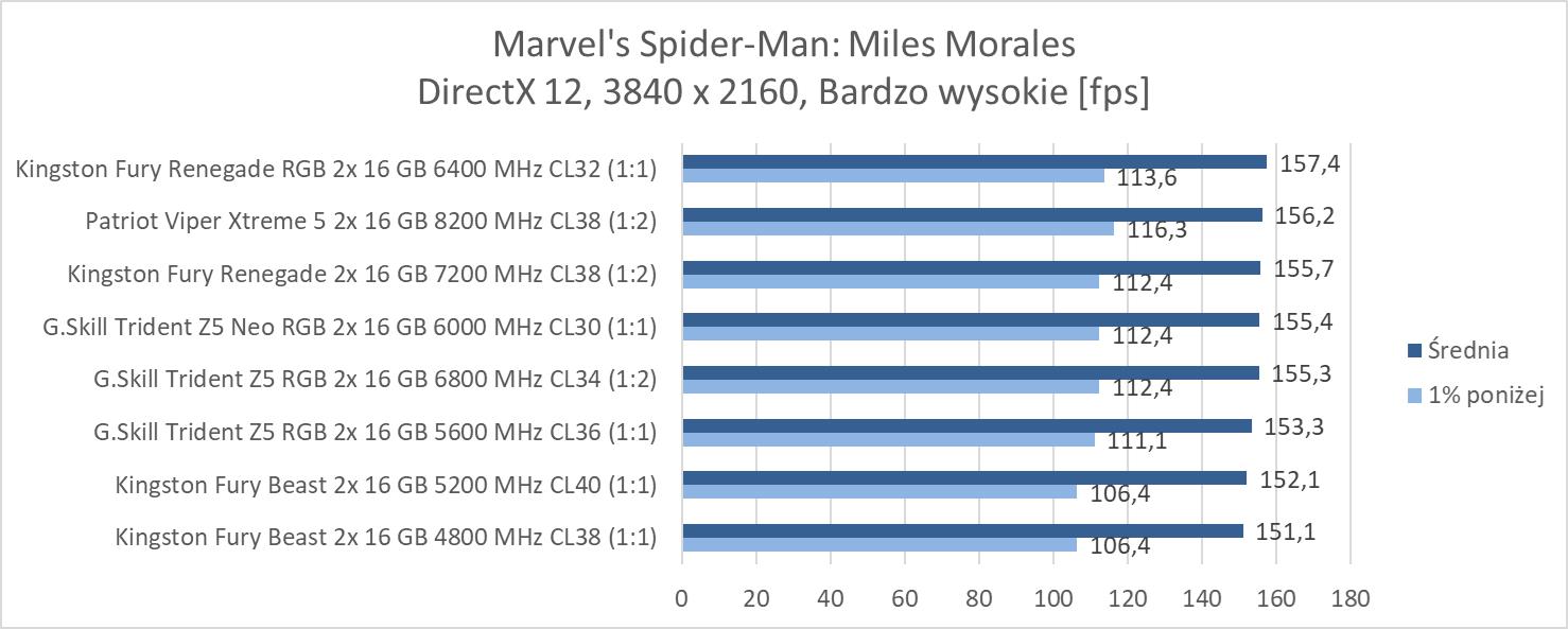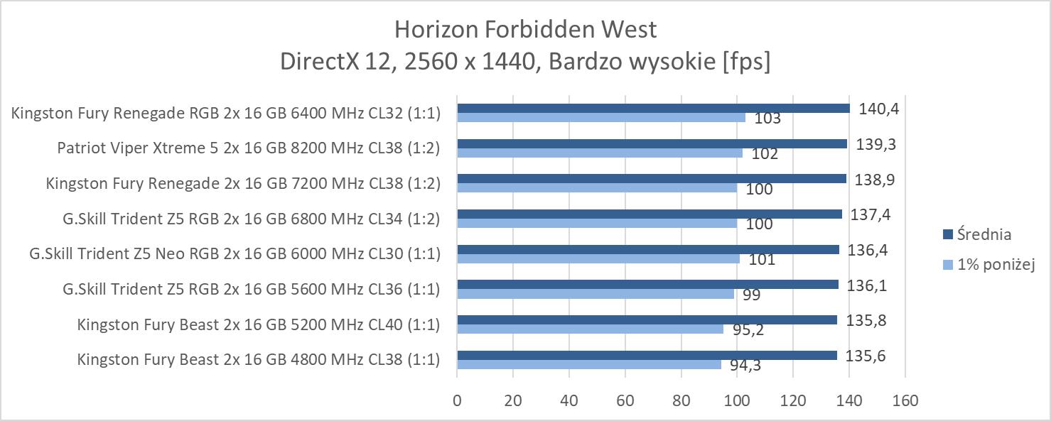 W grach jest podobna sytuacja. Tutaj różnice pomiędzy najtańszymi a najdroższymi będą widoczne w 1920 x 1080 i 2560 x 1440 – dopiero w ostatniej są znacznie mniejsze, co jest zgodne z oczekiwaniami. Ponownie pamięci 6800 MHz 1:2 wypadają blisko 5600 MHz 1:1, więc tutaj ich zakup kompletnie mija się z celem. 7200 MHz 1:2 notują wyniki bliskie 6000 MHz 1:1, a 8200 MHz 1:2 walczą o prowadzenie z 6400 1:1 -tutaj różnice nie są duże.