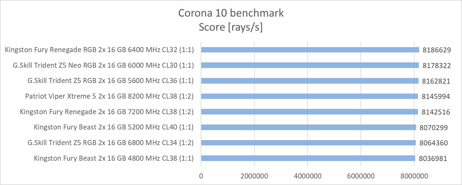 Silnik renderujący Corona dostępny jest Autodesk 3ds Max oraz Cinema 4D. Co ważne, nie wspiera on GPU, więc wydajność CPU jest tutaj kluczowa. W testach skorzystaliśmy z benchmarka przygotowanego przez twórców, który dobrze sprawdza się w praktyce.
