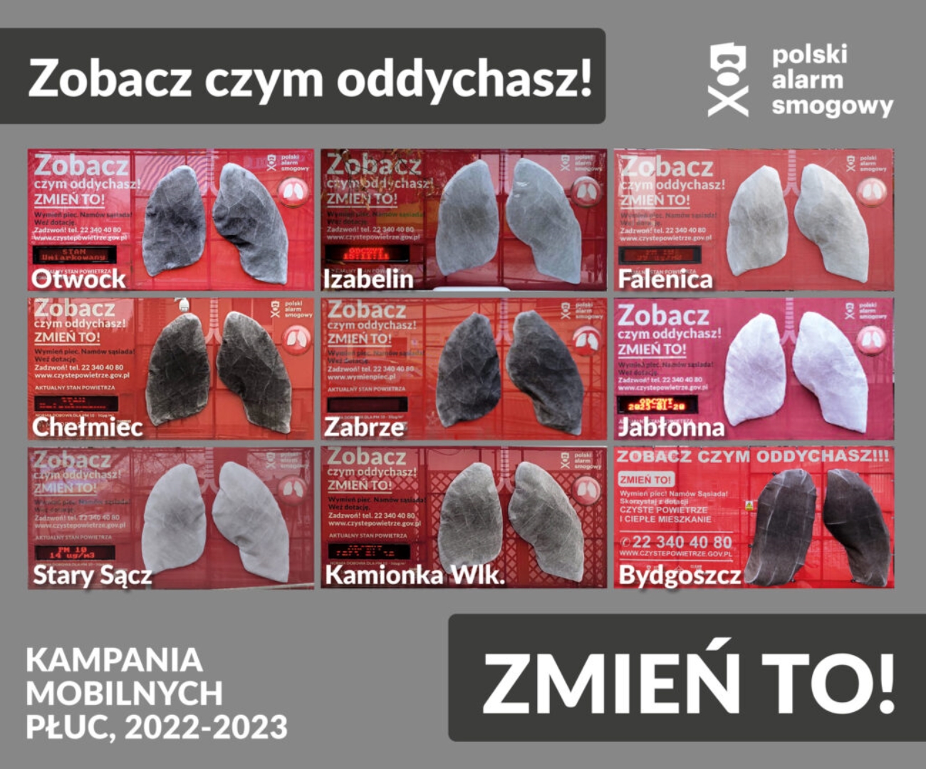 Mobilne płuca to instalacje, które „oddychają” powietrzem w danej lokalizacji. Pokryte białym materiałem modele są wystawione na działanie zanieczyszczeń, które osiadają na ich powierzchni, przez co z biegiem czasu przybierają kolor od jasnoszarego do ciemnego, grafitowego, a w najgorszym przypadku czarnego, obrazując tym samym skalę problemu. Instalacje trafiają głównie do miejscowości, gdzie brakuje aktualnie stacji pomiarowych, przez co mieszkańcy nie zdają sobie sprawy z rzeczywistego stanu powietrza. Celem tej akcji jest uświadamianie mieszkańców o jakości powietrza, którym oddychają, a tym samym zachęcanie ich do wymiany przestarzałych pieców węglowych, które stanowią jedno ze źródeł smogu w Polsce.