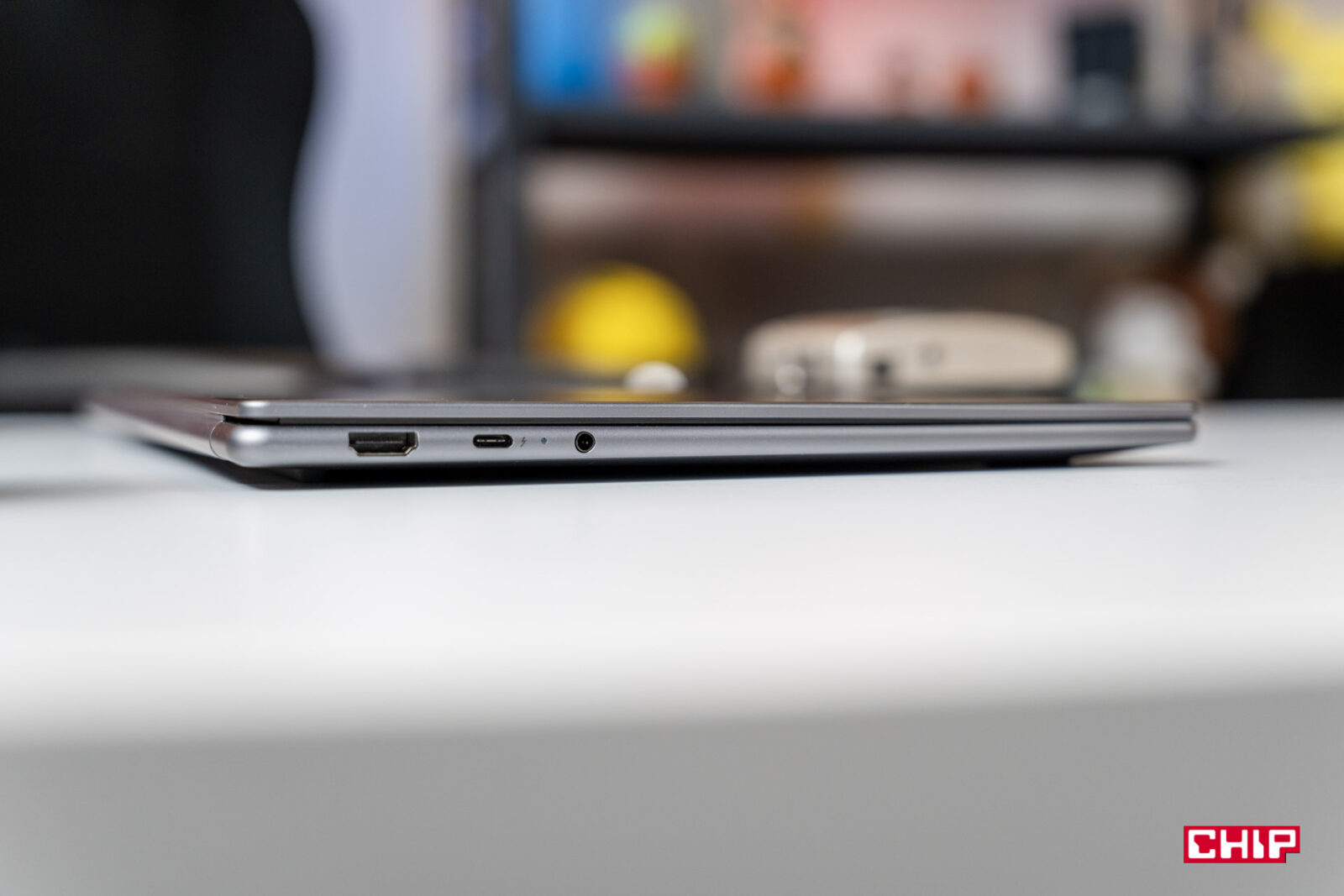 Pod względem portów Lenovo Yoga Slim 7 15 Aura Edition to jeden z bardziej kompletnych laptopów. Na lewym boku znajdziemy HDMI 2.1 oraz USB-C 4.0 zgodne z Thunderbolt 4 (Display Port 2.1 i Power Delivery 3.1) i gniazdo Jack 3.5mm.