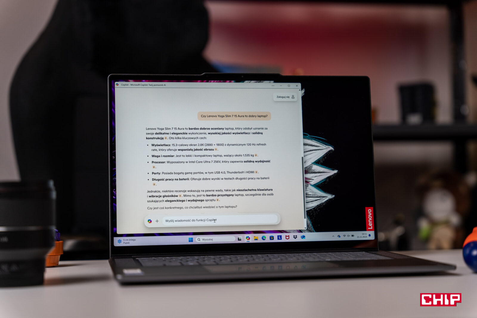 Lenovo, jak dzisiaj niemal każdy producent dowolnej elektroniki, chwali się wykorzystaniem AI w swoim laptopie. Yoga Slim 7 15 Aura Edition to urządzenie z Coopilot+ PC, więc do dyspozycji dostajemy dedykowany przycisk na klawiaturze do wywołania asystenta Microsoftu. Czyli coś, co można uruchomić na dowolnym komputerze z poziomu przeglądarki internetowej. Oczywiście mamy tu dodatkowe funkcje w postaci choćby generowania napisów na żywo w trakcie rozmowy, ale sam Coopilot jako asystent nie jest, póki co, wybitnym narzędziem.
