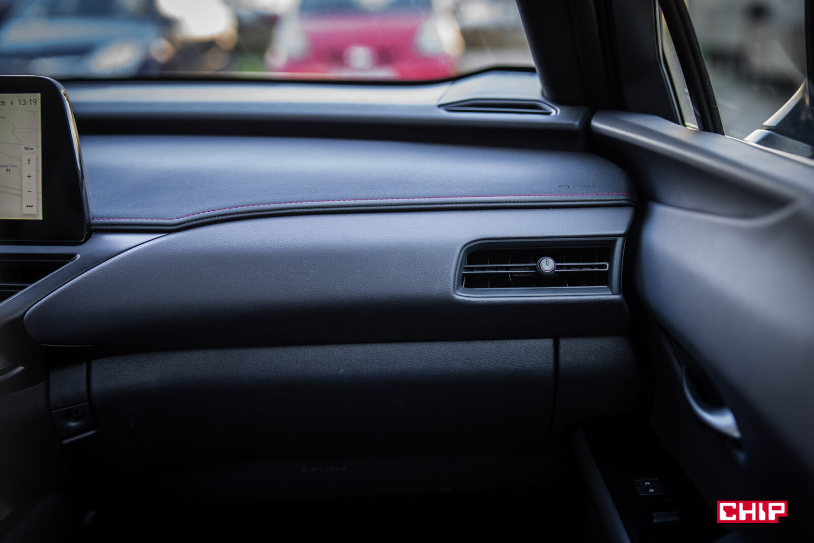 Wnętrze w czarnym kolorze syntetycznej skóry na pierwszy rzut oka wydaje się ciemne. Dokładając do tego stosunkowo niewielkie szyby faktycznie trochę tak jest. Ale z drugiej strony nie jest tu aż tak ciemno jak w popularnej Toyocie C-HR. Mimo wszystko aż prosi się, żeby nieco rozjaśnić je nawet skromny podświetleniem którejś z listw, ale niestety. Podświetlenie jest tylko nad stopami z przodu i na tym koniec, więc w nocy jest tu bardzo ascetycznie.