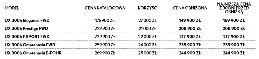Katalogowe ceny Lexusa UX 300h są dosyć spore. W podstawowej i powiedzmy sobie szczerze – bardzo gołej wersji Elegance z napędem na cztery koła kosztuje 176 900 zł. Najbogatsza wersja Omotenashi z napędem na cztery koła to aż 269 900 zł. Ale obecnie, na dzień publikacji testu, wyglądają one następująco: