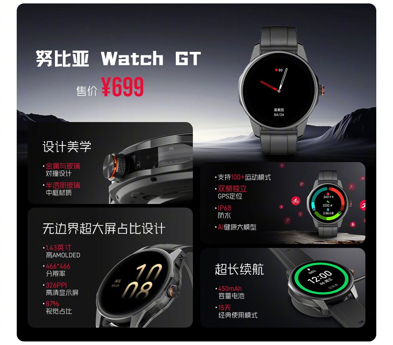 Nubia Watch GT oferuje zajmujący 87% frontu urządzenia wyświetlacz AMOLED o średnicy 1,43-cala oraz rozdzielczości 466 x 466 px (zyskujemy w ten sposób gęstość pikseli o wartości 326 PPI). Skoro taka technologia ekranu, nie zabrakło funkcji Always-On czyli stałej widoczności z wygaszeniem, zachowując stałą dostępność do najważniejszych informacji. Konstrukcja uzyskała certyfikat IP68, a zatem można się z nią pakować w różne nie do końca komfortowe dla elektroniki warunki. Akumulator o pojemności 450 mAh ma teoretycznie dostarczać do 15 dni pracy, ale tu oczywiście dużo zależy od aktywności użytkownika.