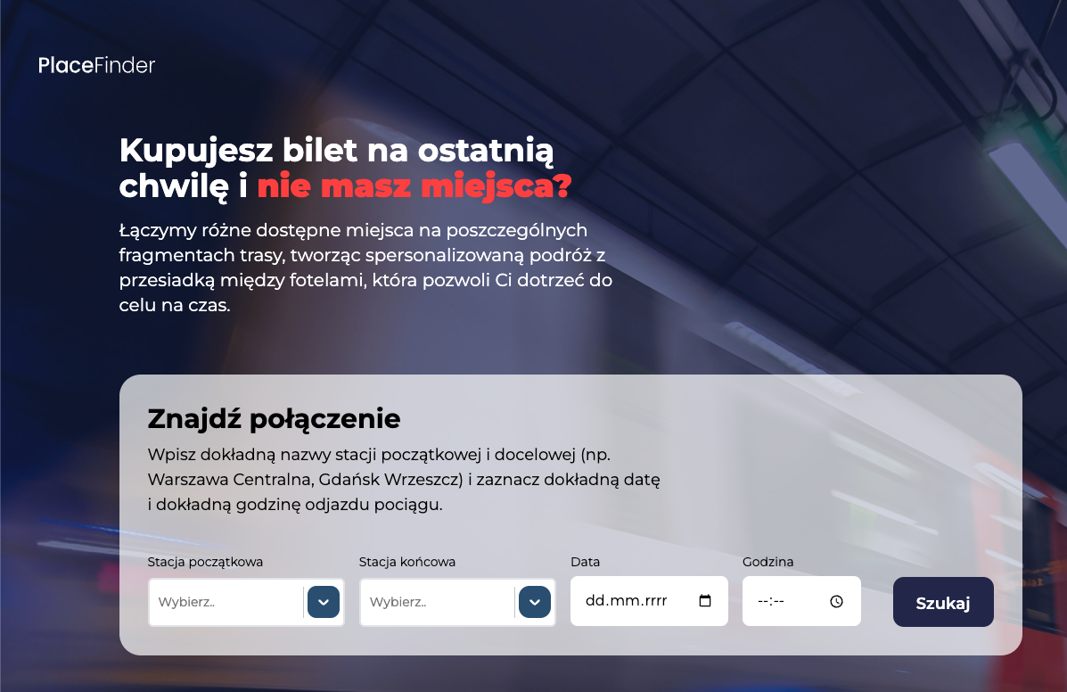 Za rozwiązaniem o nazwie PlaceFinder stoi dwójka studentów. Kazimierz Lipski, student ostatniego roku informatyki na Politechnice Warszawskiej jest odpowiedzialny za stronę techniczną, zaś Weronika Pieniak, studentka grafiki na Akademii WIT wzięła na siebie stronę wizualną projektu. Założenie systemu jest banalnie proste: wpisujemy stację początkową, stację końcową, datę i godzinę odjazdu, a system sprawdza liczbę dostępnych miejsc na poszczególnych odcinkach danej trasy i jak długo można na każdym z nich siedzieć, tworząc niejako spersonalizowany plan przesiadek między fotelami.