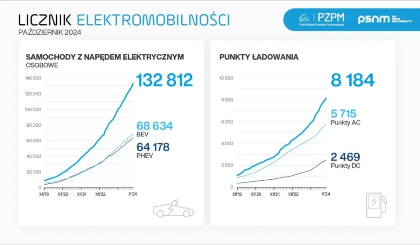 Z najnowszych danych Licznika Elektromobilności, uruchomionego przez Polski Związek Przemysłu Motoryzacyjnego (PZPM) i Polskie Stowarzyszenie Nowej Mobilności (PSNM) wynika, że liczba samochodów elektrycznych (BEV i PHEV) w Polsce rośnie powoli, ale systematycznie i zapewne sami zauważyliście to na drogach, o ile zwracacie uwagę m.in. na zielone tablice rejestracyjne. Potwierdza to fakt, że na koniec października 2024 roku zarejestrowano już w Polsce łącznie ponad 76240 akumulatorowych samochodów elektrycznych (BEV), co oznacza wzrost o około 5% w porównaniu z rokiem ubiegłym, jako że od początku bieżącego roku doszło do zarejestrowania 17377 BEV i 17377 PHEV. W te liczby wliczają się samochody osobowe, dostawcze oraz ciężarowe.