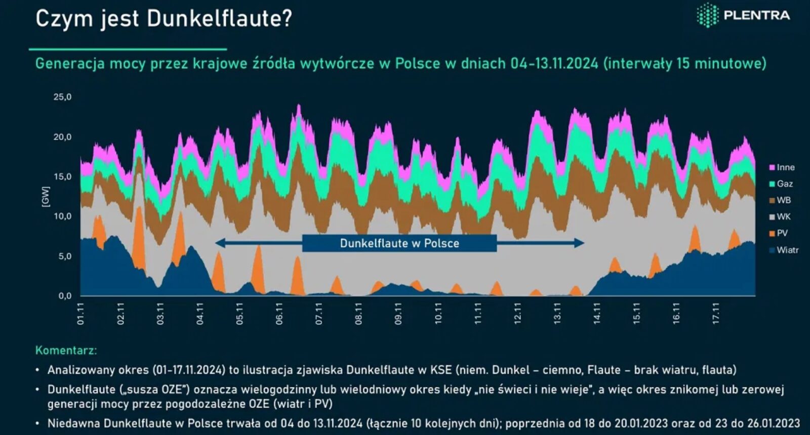 “Czarny scenariusz pogodowy” dla OZE miał miejsce właśnie w listopadzie 2024 roku. Wtedy to Polska i inne kraje Europy musiały zmierzyć się z niemal całkowitym zatrzymaniem produkcji energii z OZE. Nie pomógł fakt, że w naszym kraju fotowoltaika przekracza już swoją ogólną mocą aż 20 GW. Słońca nie było i kropka. Wtedy nawet cały kraj pokryty panelami nie zda się na wiele, bo ograniczone nasłonecznienie w krótkie, pochmurne dni, to coś, czego zwyczajnie nie da się przeskoczyć, jeśli idzie o uzysk energii z fotowoltaiki. To samo dotknęło wiatraki, bo bezwietrzna pogoda nie pozwoliła rozkręcić się turbinom o łącznej mocy w Polsce rzędu 10,5 GW.