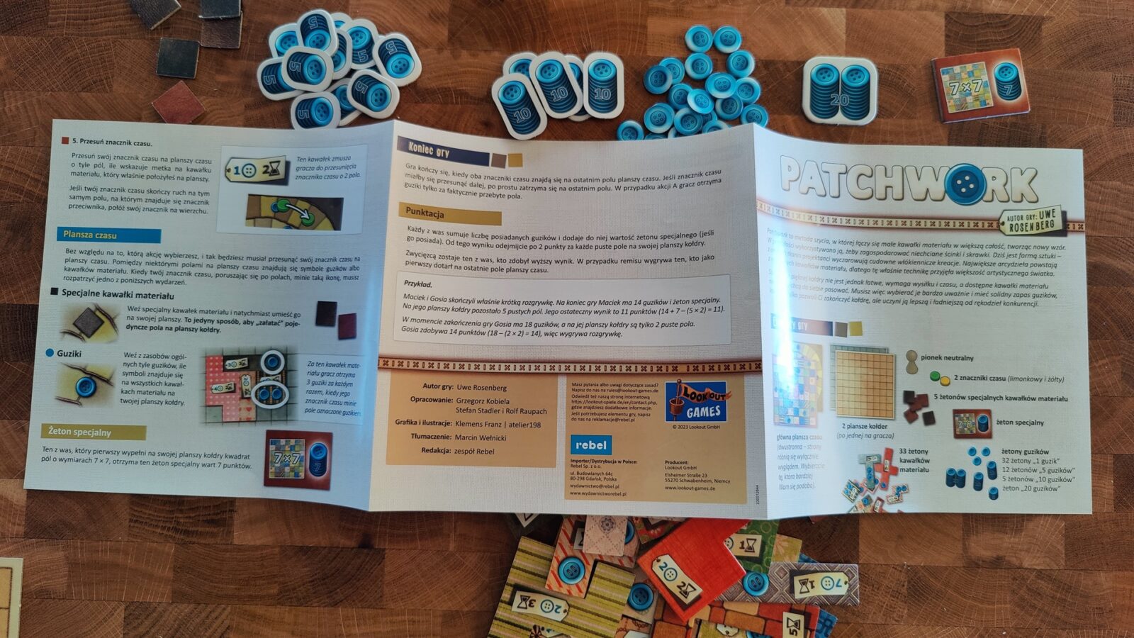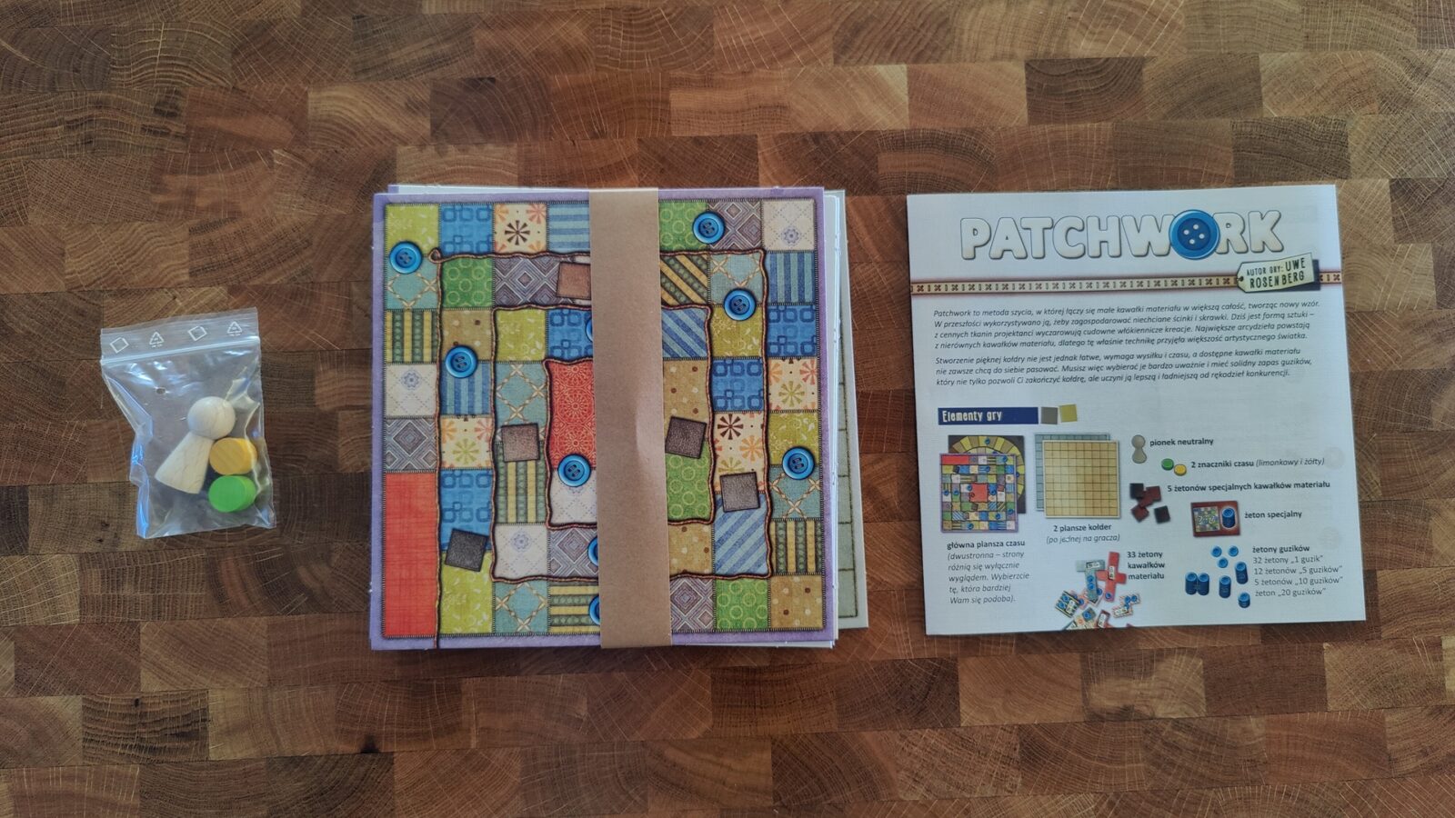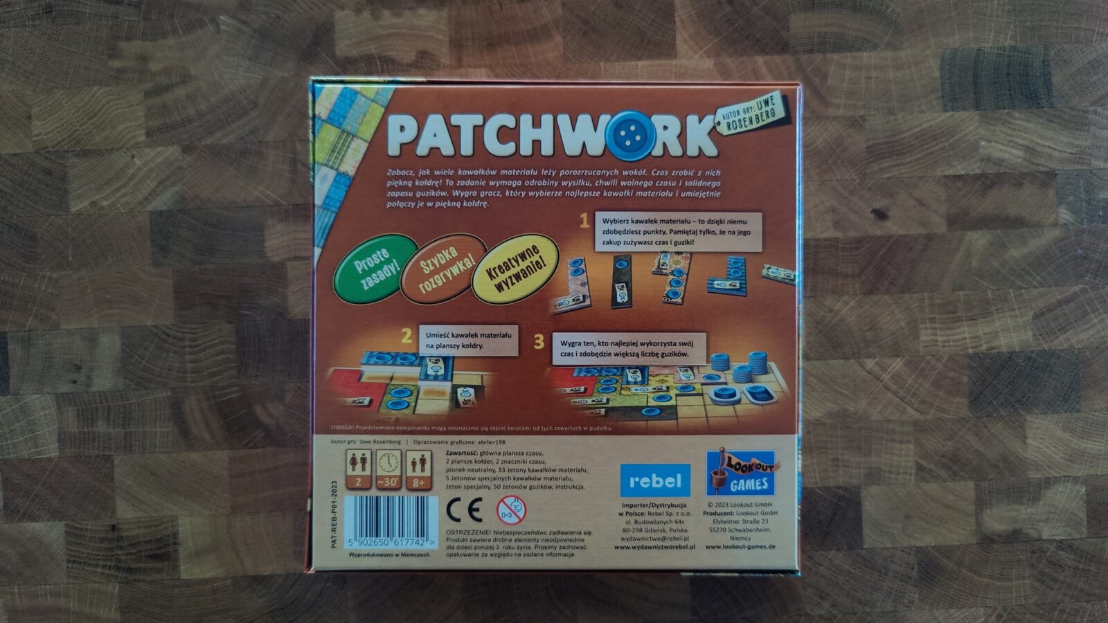 Patchwork nie jest niczym nowym na rynku gier planszowych, bo zadebiutował w 2014 roku, ale w Polsce ta gra planszowa trafiła właśnie na półki w odświeżonej formie za sprawą wydawnictwa Rebel. W pudełku niczego nowego wprawdzie nie uświadczycie, ale z drugiej strony niektóre grafiki na pudełku doczekały się delikatnych szlifów, a instrukcja graficznego odświeżenia. Innymi słowy, nie jest to żadne nowe wydanie, a ot coś na zasadzie nowego wydruku, który nawet pudełkiem nie odbiega od oryginału.