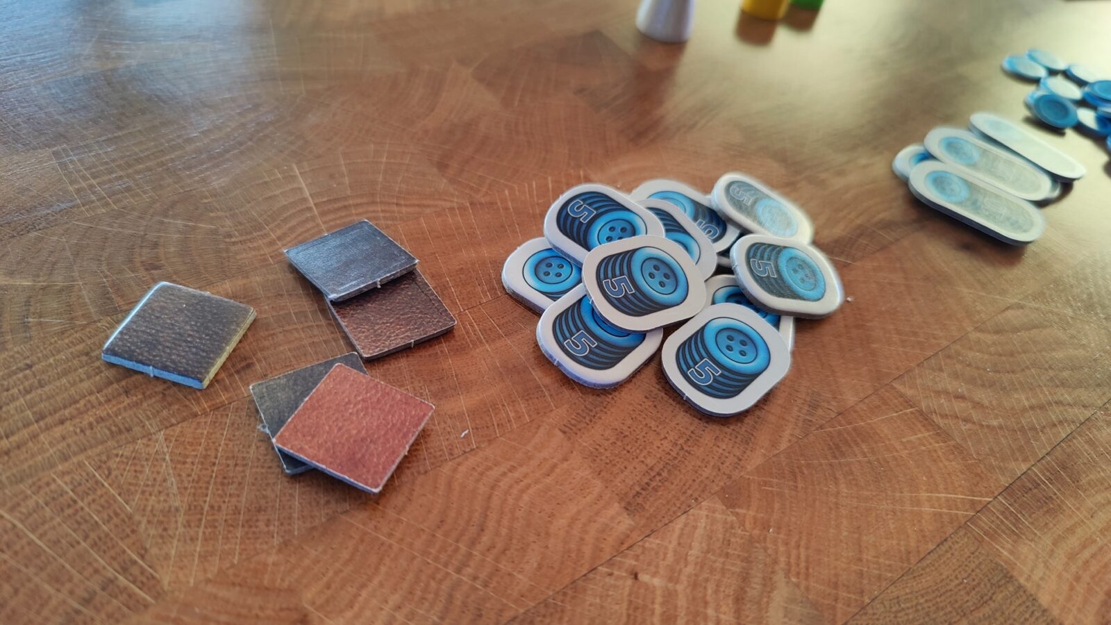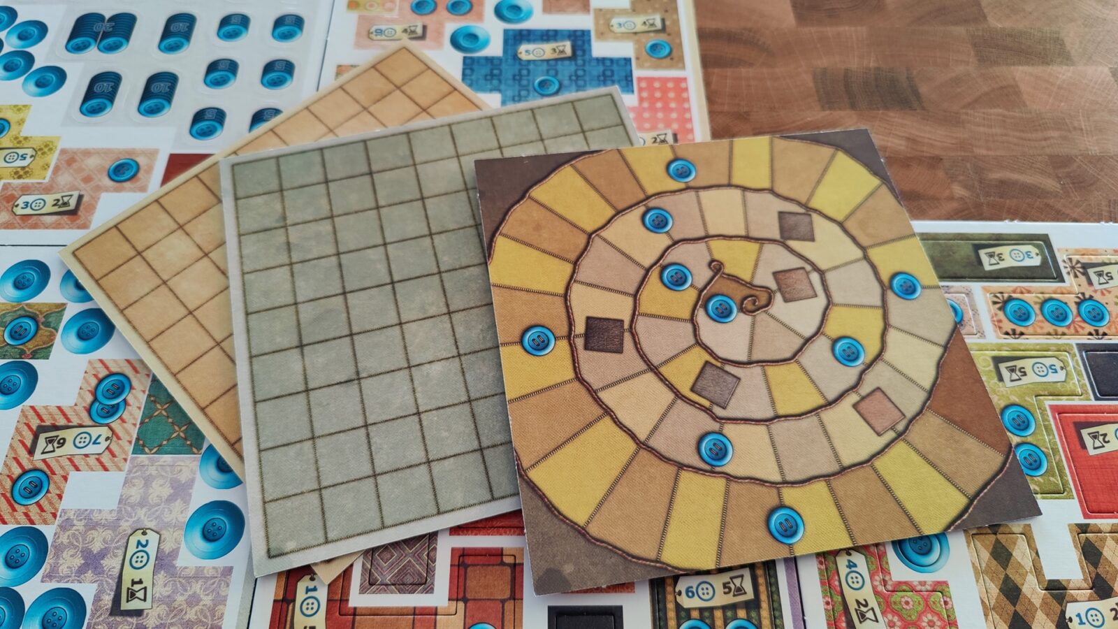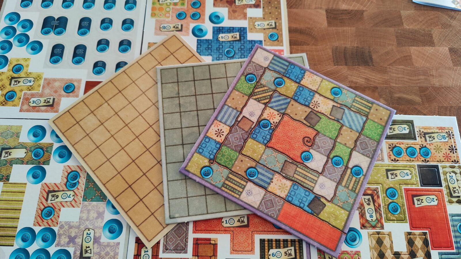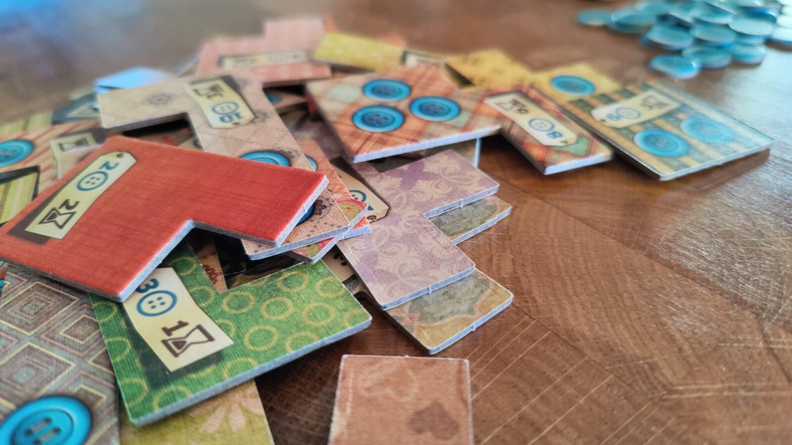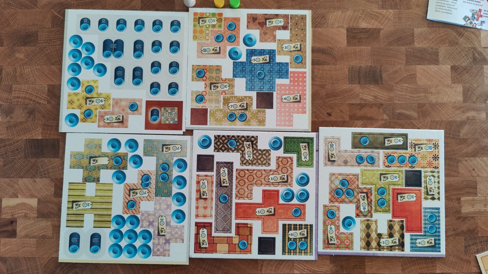 558-gramowe pudełko skrywa w sobie instrukcję w języku polskim, trzy grube tekturowe plansze (dwie dedykowane graczom i jedna dwustronna główna), 33 kawałki materiału o różnych kształtach, 50 żetonów guzików, 5 łatek, znacznik bonusu punktowego, dwa pionki graczy i jeden pionek neutralny. Tylko te dwa ostatnie elementy są wykonane z czegoś innego, niż tektura, bo z drewna, ale jeśli idzie o trwałość tej gry, to mogę was zapewnić, że jeśli utrzymacie kafelki z dala od wody, to nawet po latach nie będą wyglądać źle.