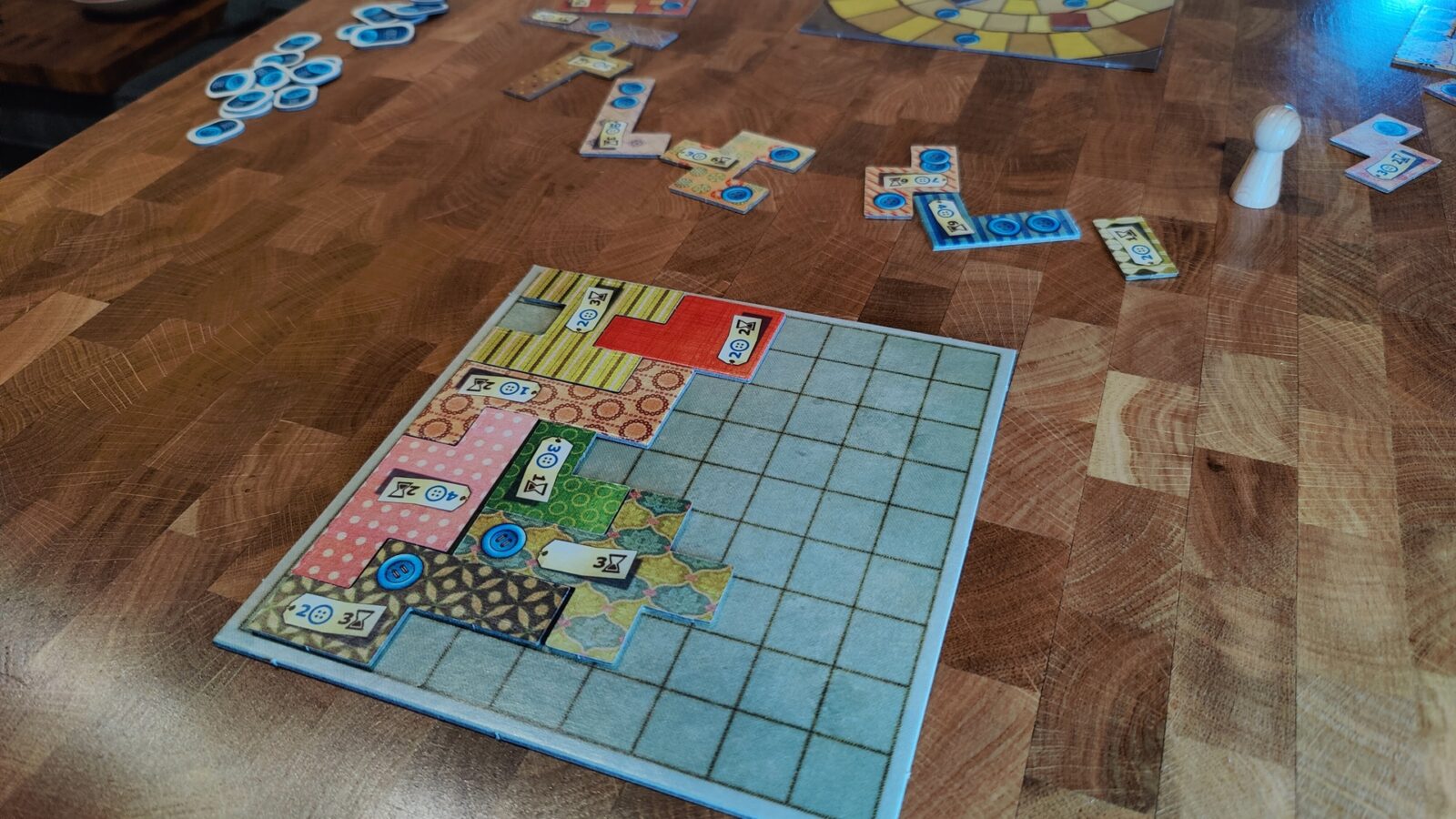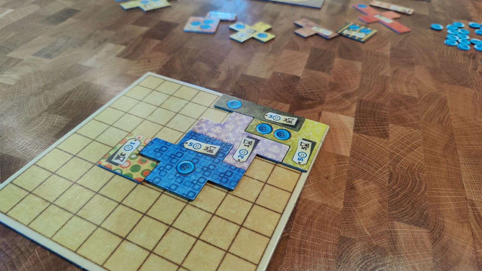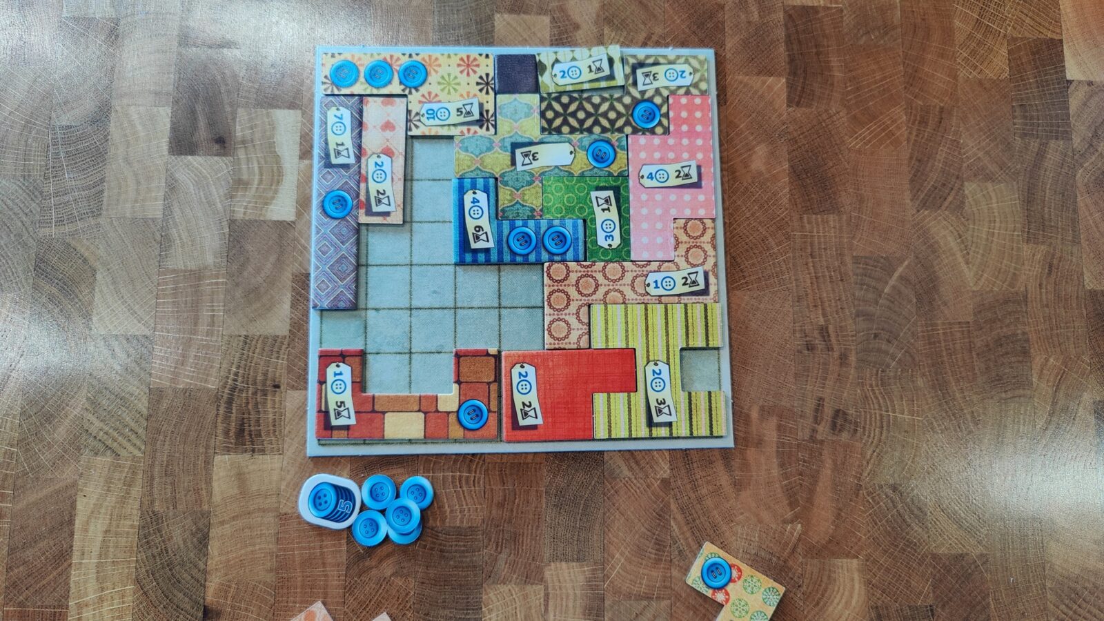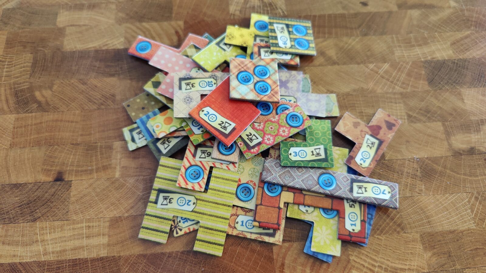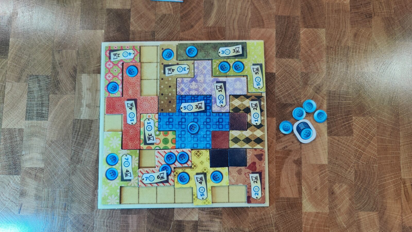 W tej grze planszowej, która została oceniona na poziomie 7.6 w rankingu BGG, mierzą się dwaj gracze. Nie mniej, nie więcej. Każdy dostaje swoją planszę podzieloną na siatkę 9×9, garść guzików (to waluta) i stawia swojego pionka na planszy głównej, która reprezentuje długość gry i określa momenty dobierania waluty czy łatek. Rozgrywka polega na kupowaniu różnego rodzaju materiałów rozproszonych dookoła planszy głównej (dostępne kafelki określa pozycja drewnianego pionka) i układania ich na własnej planszy tak, aby w toku gry zakryć jej możliwie najwięcej. Im więcej “dziur” będziecie mieli na planszy, tym więcej guzików będziecie musieli “oddać” pod koniec gry, a musicie wiedzieć, że to właśnie liczba guzików określa zwycięzcę.