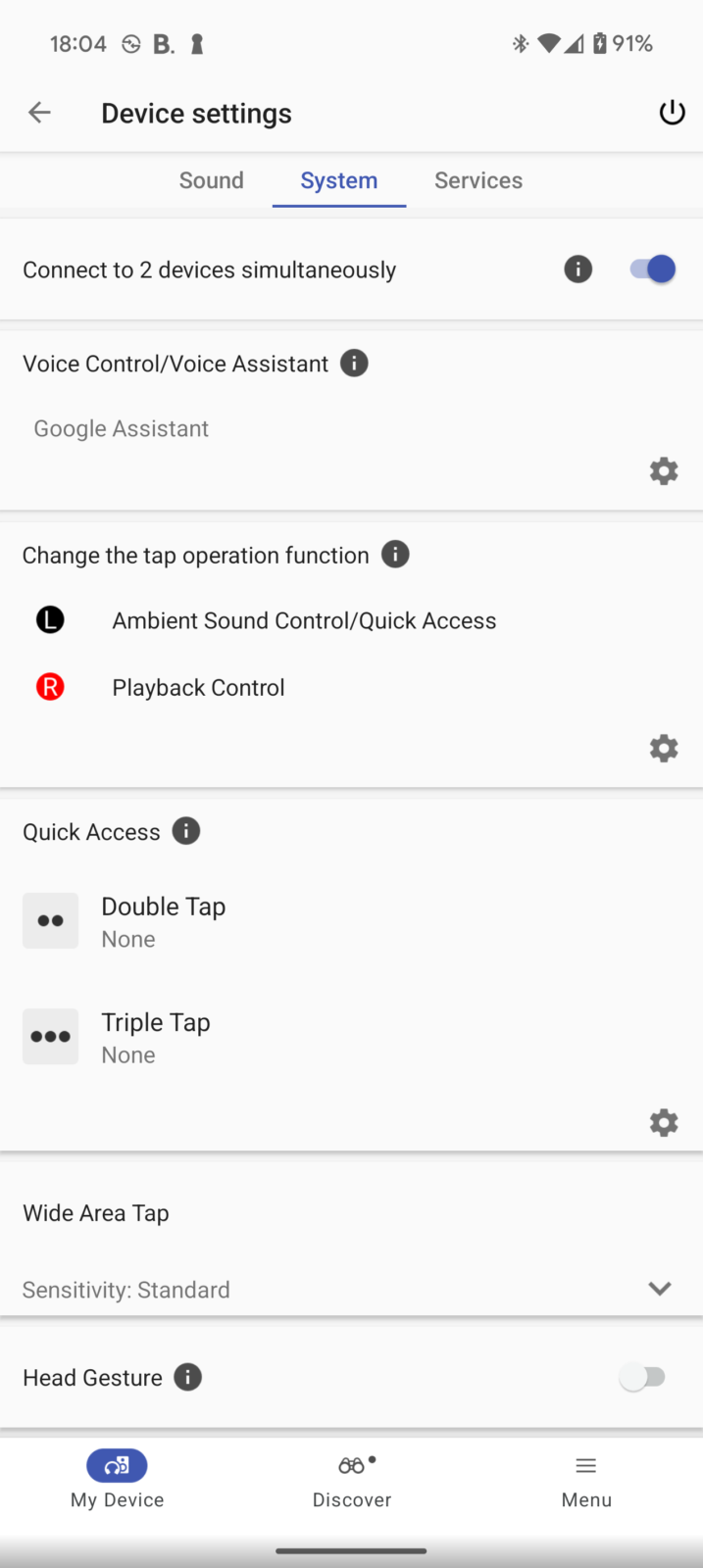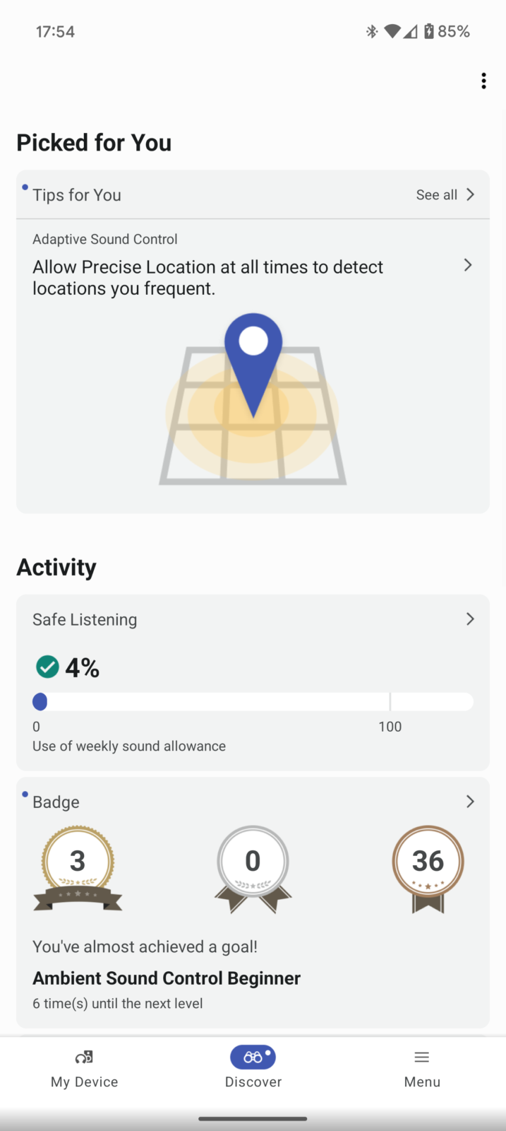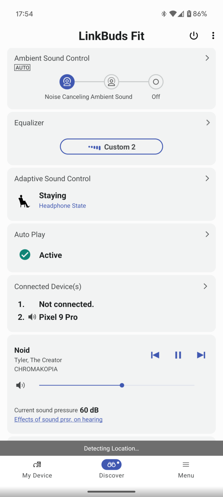Jest tego wszystkiego sporo i pominąłem pomniejsze opcje. Problem Sound Connect jest jednak to, że nie do końca się łatwo w tym wszystkim odnaleźć. Zamiast sekcji “Discover” z odznakami i poradami dotyczącymi włączania jak największej ilości ustawień, lepiej byłoby wstawić ustawienia. Ponadto warto byłoby poprawić czytelność i być może dokonać segregacji według innych kryteriów. Ale to i tak najmniejszy problem Sony LinkBuds Fit.