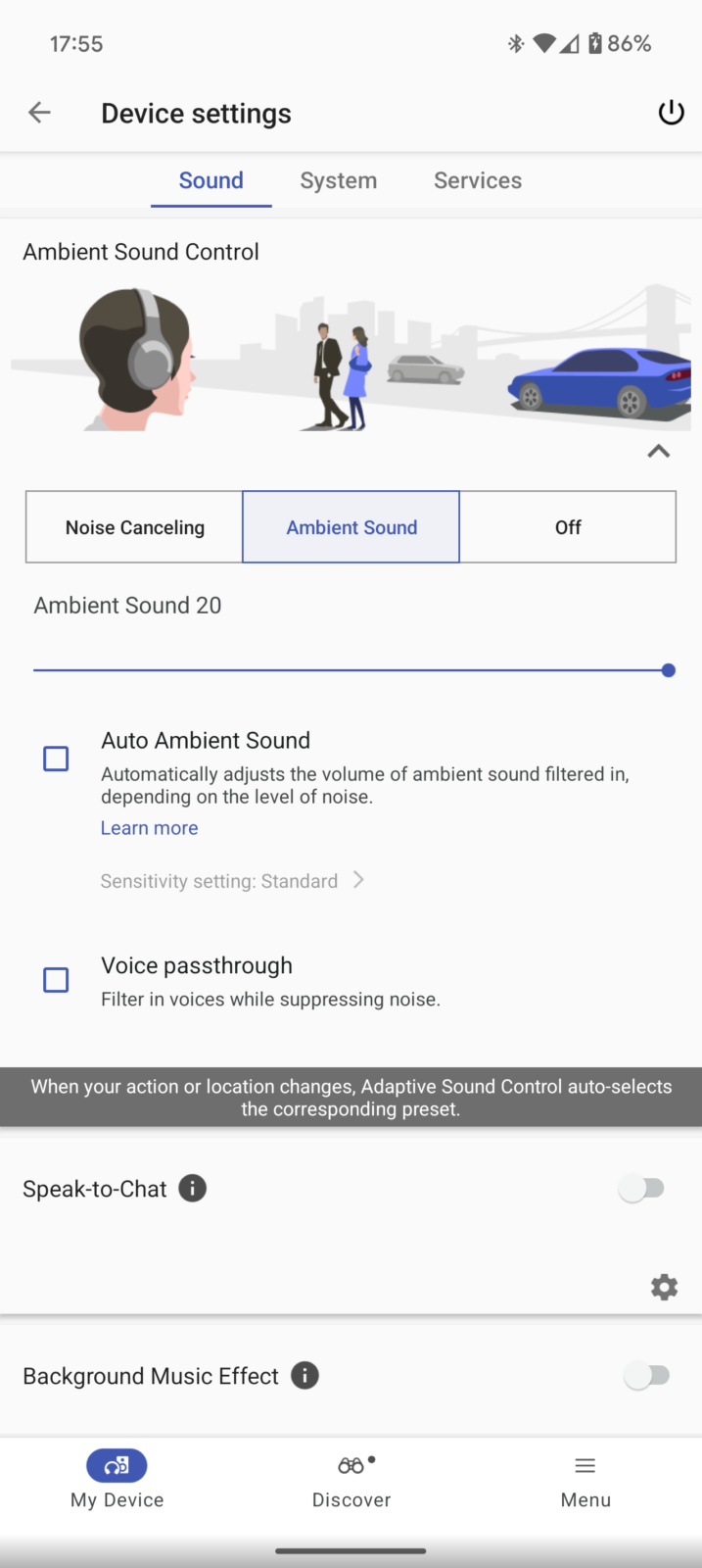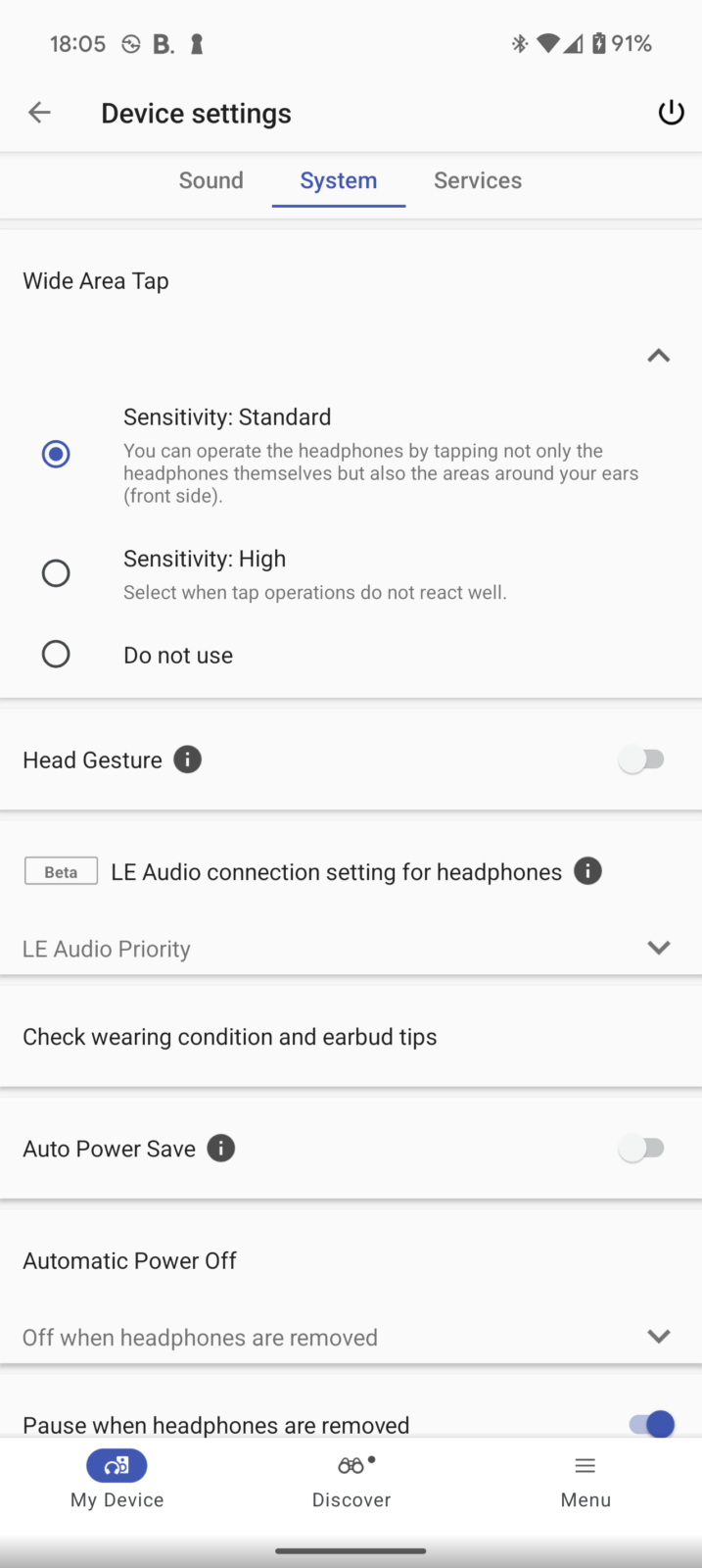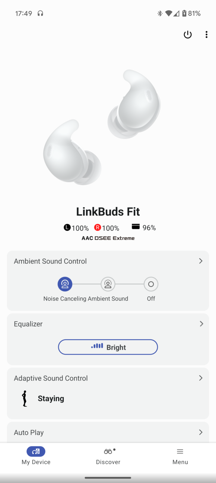 A jest tu co konfigurować, bo Sony dość poważnie traktuje swoją aplikację. Podzielono ją na trzy sekcje, z czego najmniej uczęszczaną zapewne będzie “Menu”, oferujące pomoc techniczną oraz kopię zapasową ustawień aplikacji. Najważniejsze i częste ustawienia znajdziemy w sekcji “My Device”. To tutaj przełączymy się między aktywną redukcją hałasu, a przepuszczaniem dźwięku z otoczenia. Sony warto docenić, bo LinkBuds Fit nie tylko automatycznie dopasowują poziom nasłuchiwania otoczenia, ale i dają opcję ręcznej regulacji. Szkoda, że nie jest tak z aktywną redukcją hałasu – tu dostajemy tylko jej włącznik.
