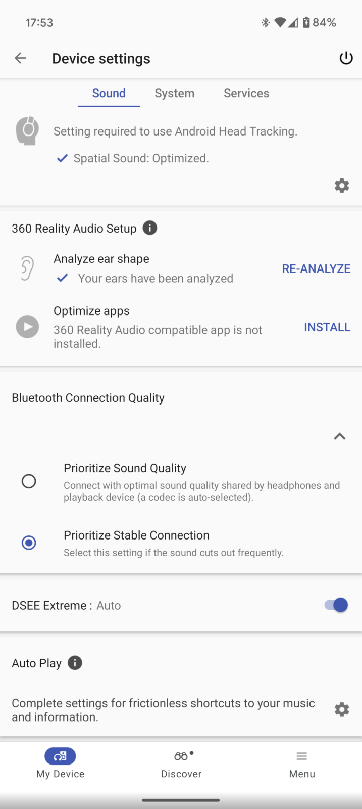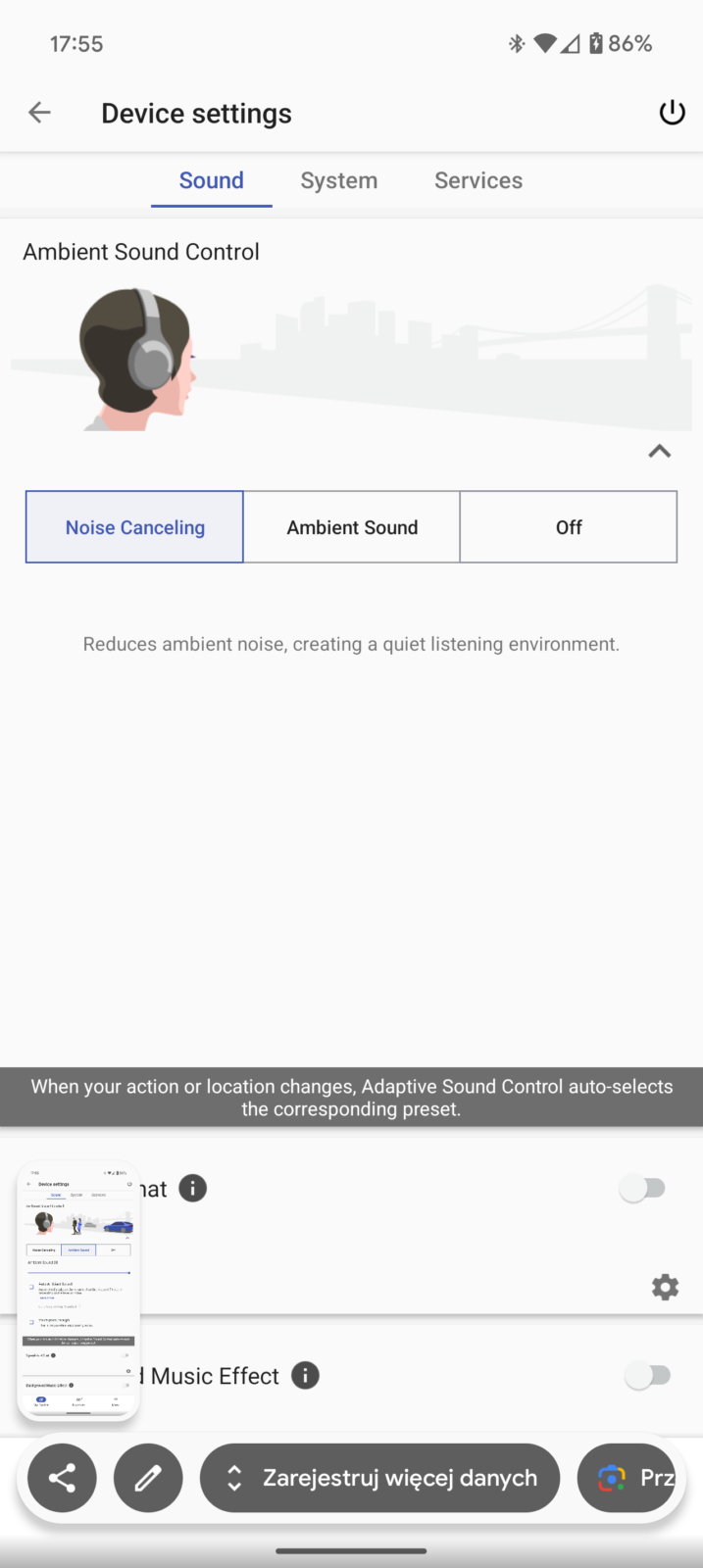 Główny ekran pozwala też na sterowanie połączonymi urządzeniami oraz aktualnie odtwarzanym dźwiękiem. Z tego miejsca przejdziemy też do zbiorczych ustawień związanych z aplikacją i towarzyszącymi jej rozwiązaniami. To tu ustawimy intensywność nasłuchiwania otoczenia, skonfigurujemy dźwięk przestrzenny czy zadecydujemy o priorytecie w sygnale Bluetooth oraz ustawieniach DSEE Extreme. Sekcja zawiera też podsekcję “System”.